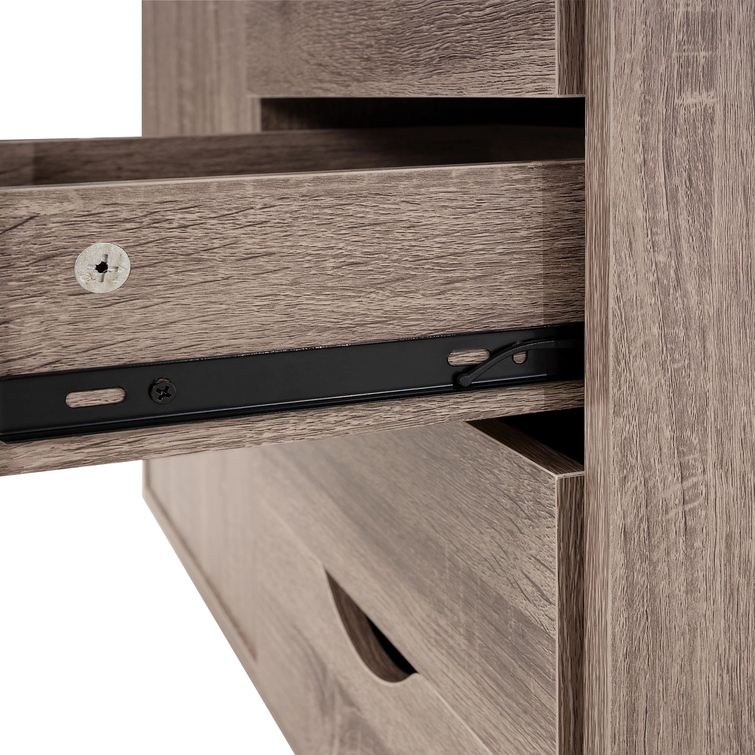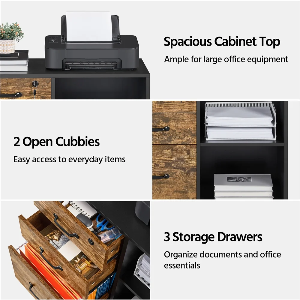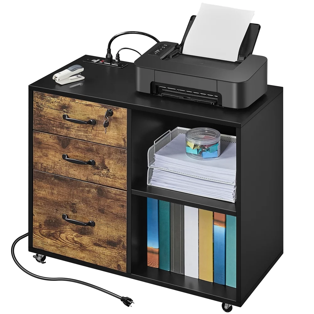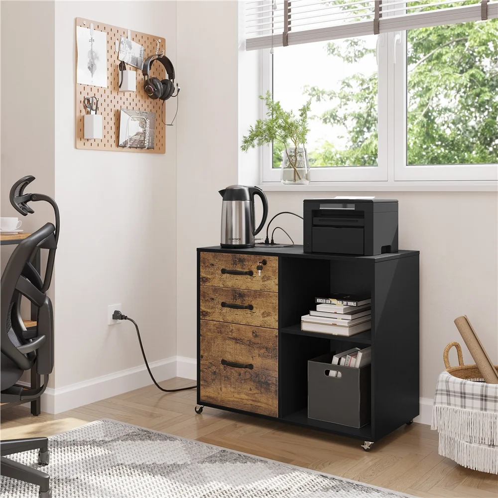 Smile Mart 3-Drawer Mobile Vintage File Cabinet with Power Outlet for Home and Office Black, Rustic Brown