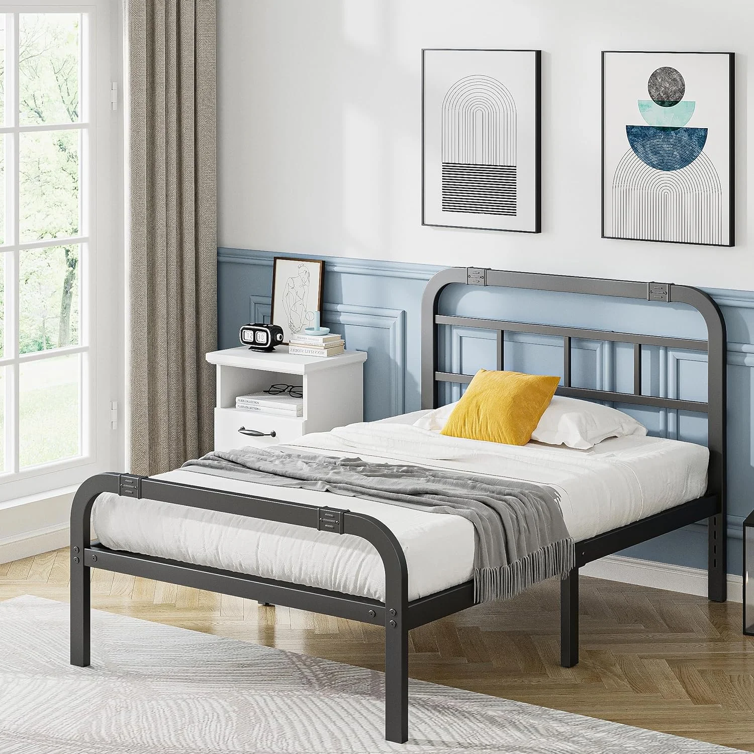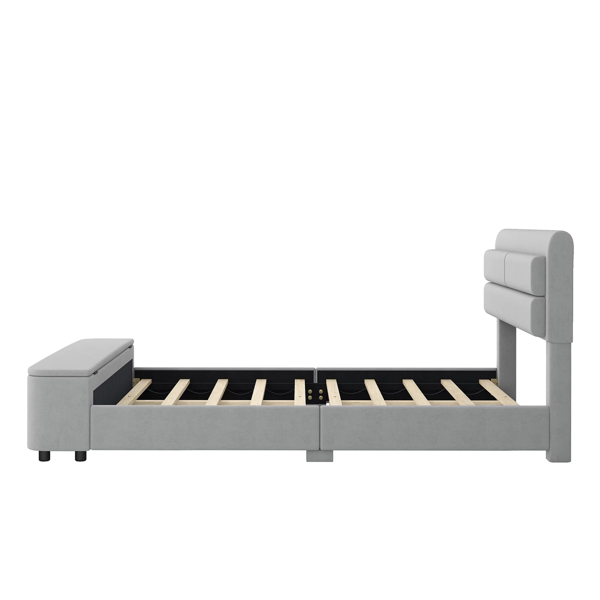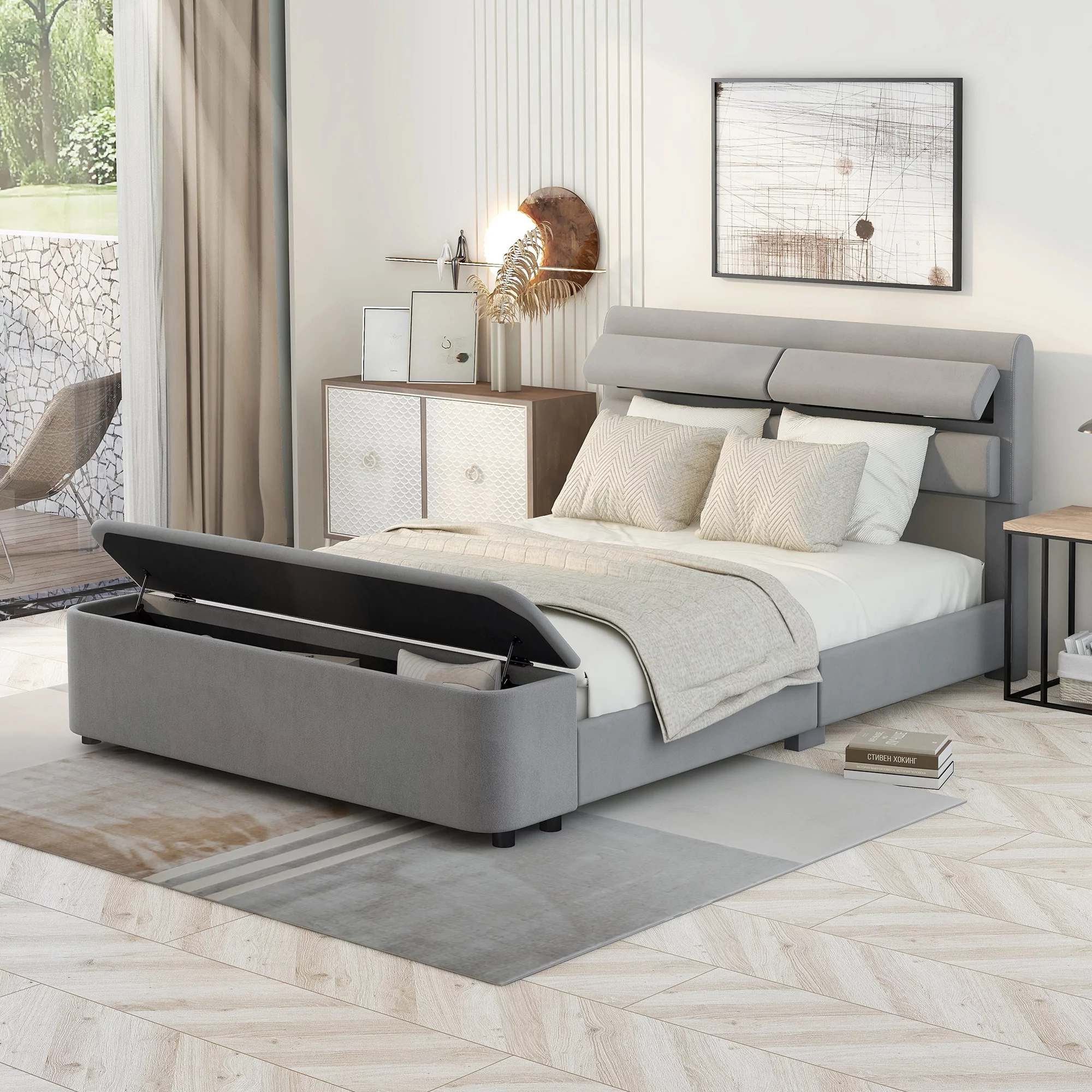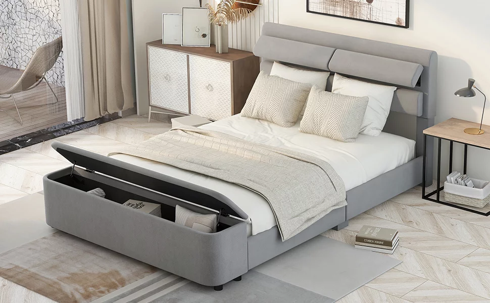 Full Size Wood Platform Bed with House-shaped Storage Headboard and 2 Drawers, Gray