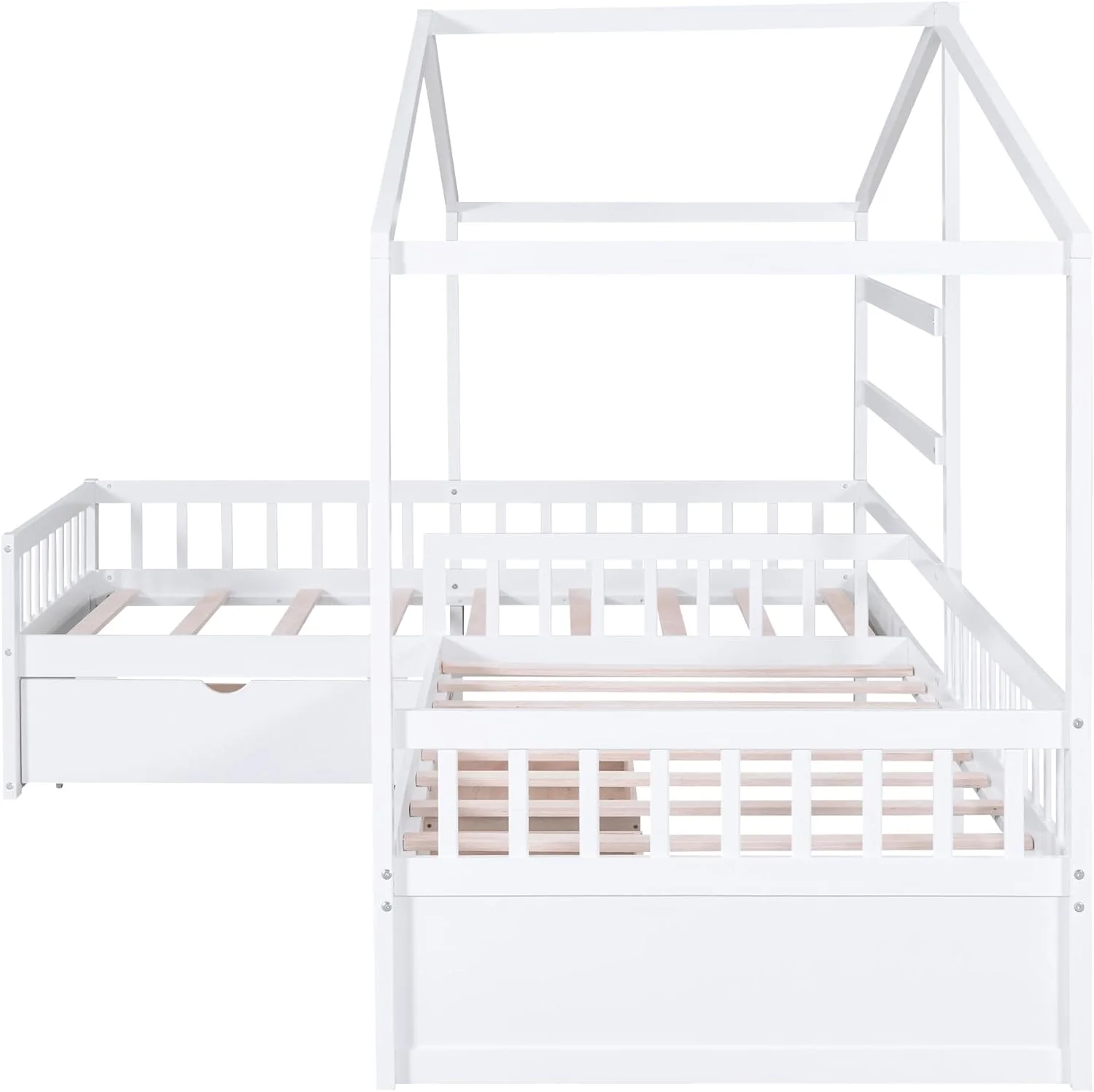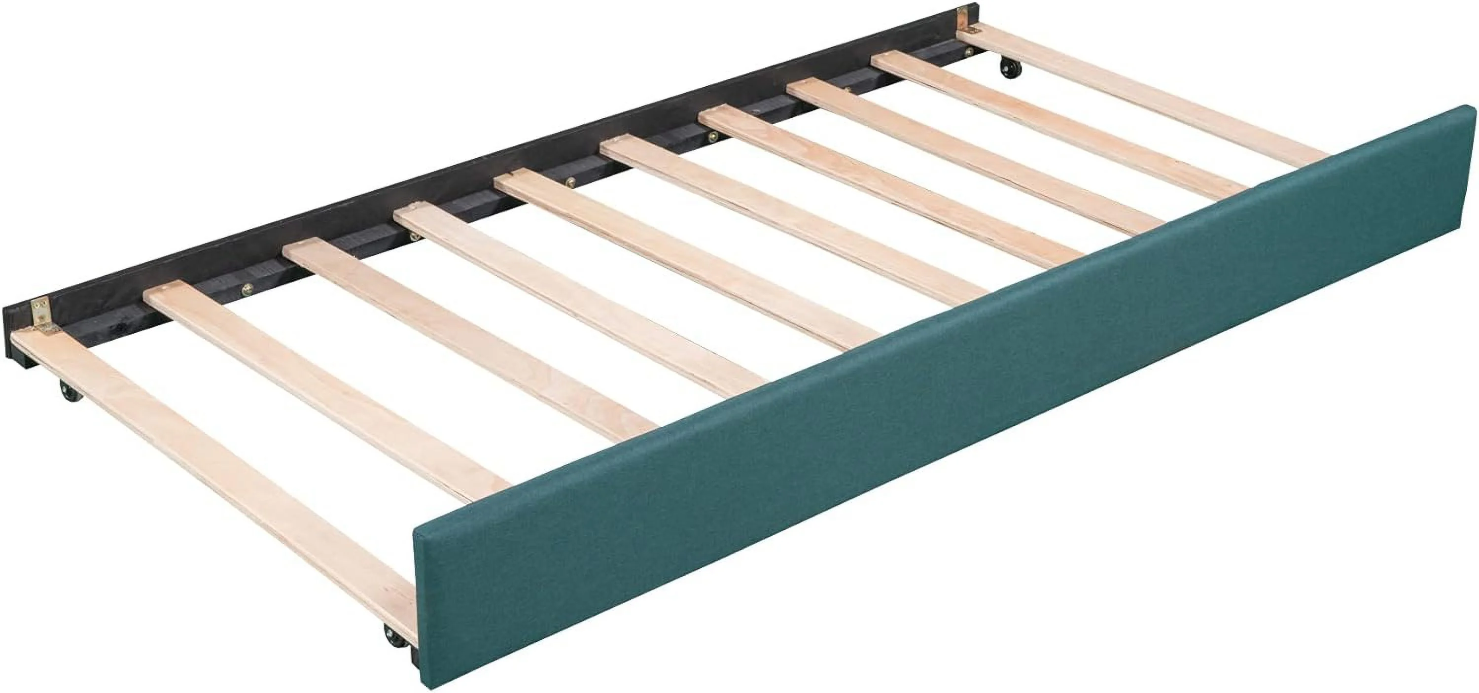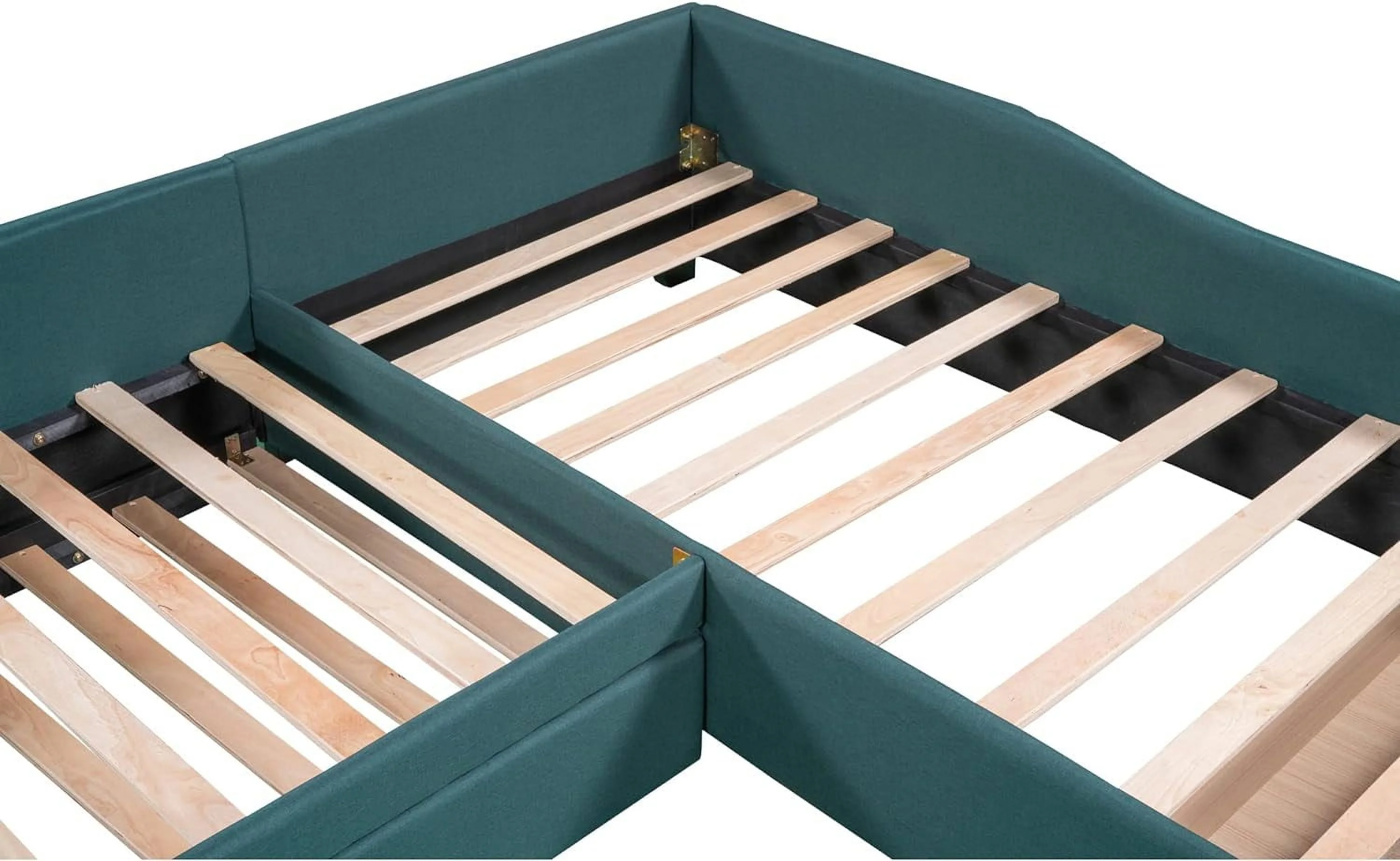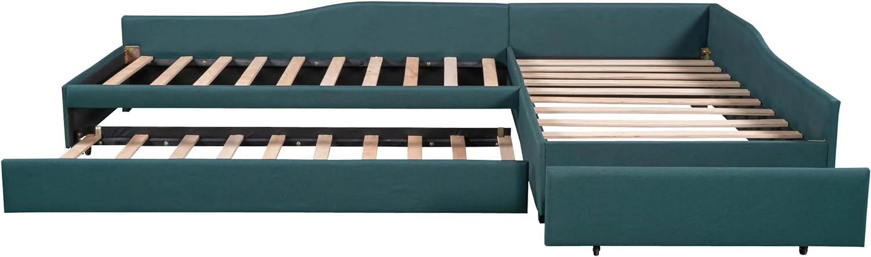 Upholstered L-Shaped 2 Beds With Trudle Ad Storage Drawer, Wood Lie Corer Bed For Kids Girls Boys Tees Bedroom, Gree