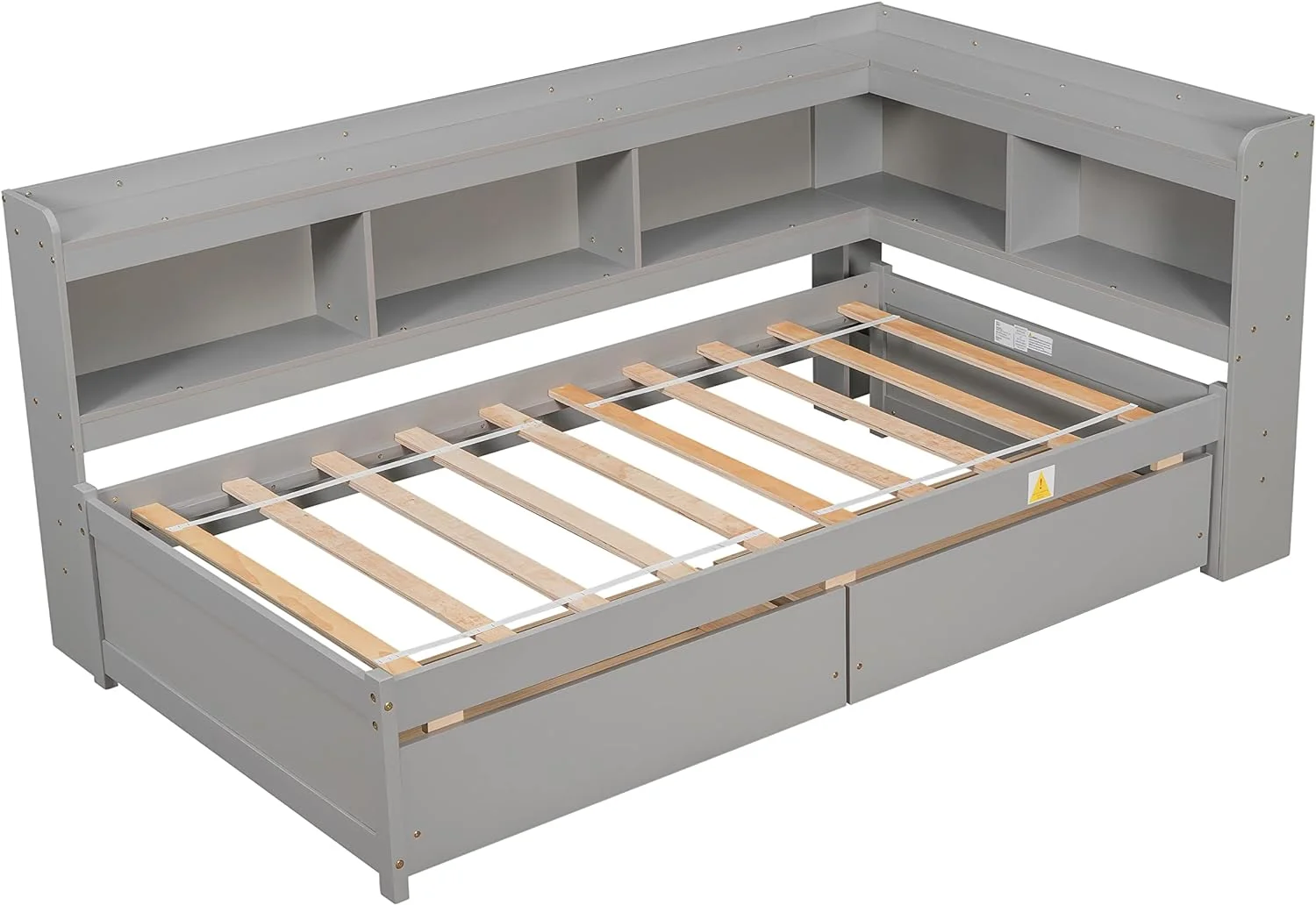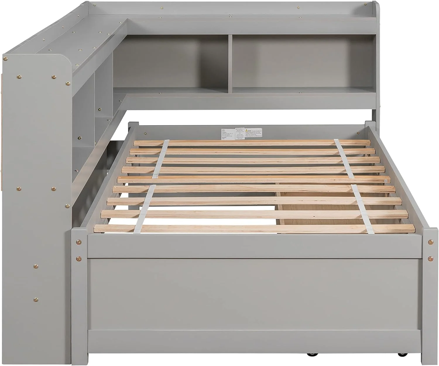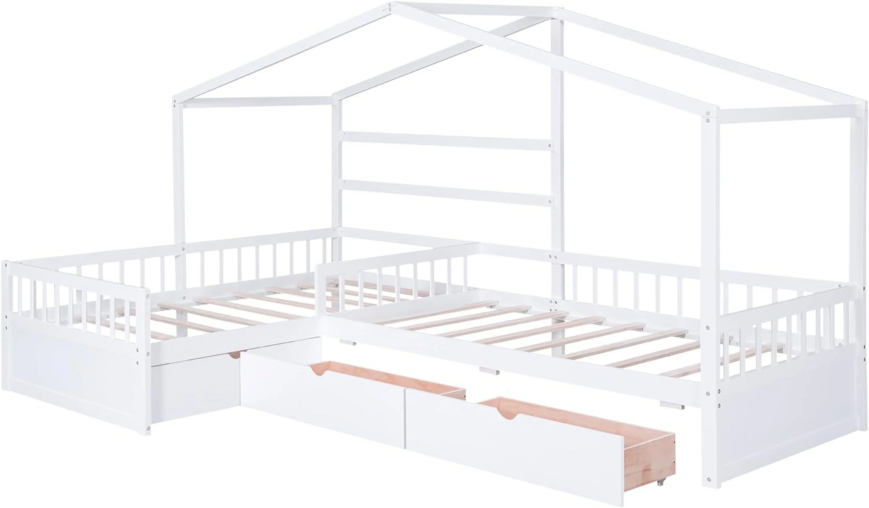 Upholstered L-Shaped 2 Beds With Trudle Ad Storage Drawer, Wood Lie Corer Bed For Kids Girls Boys Tees Bedroom, Gree