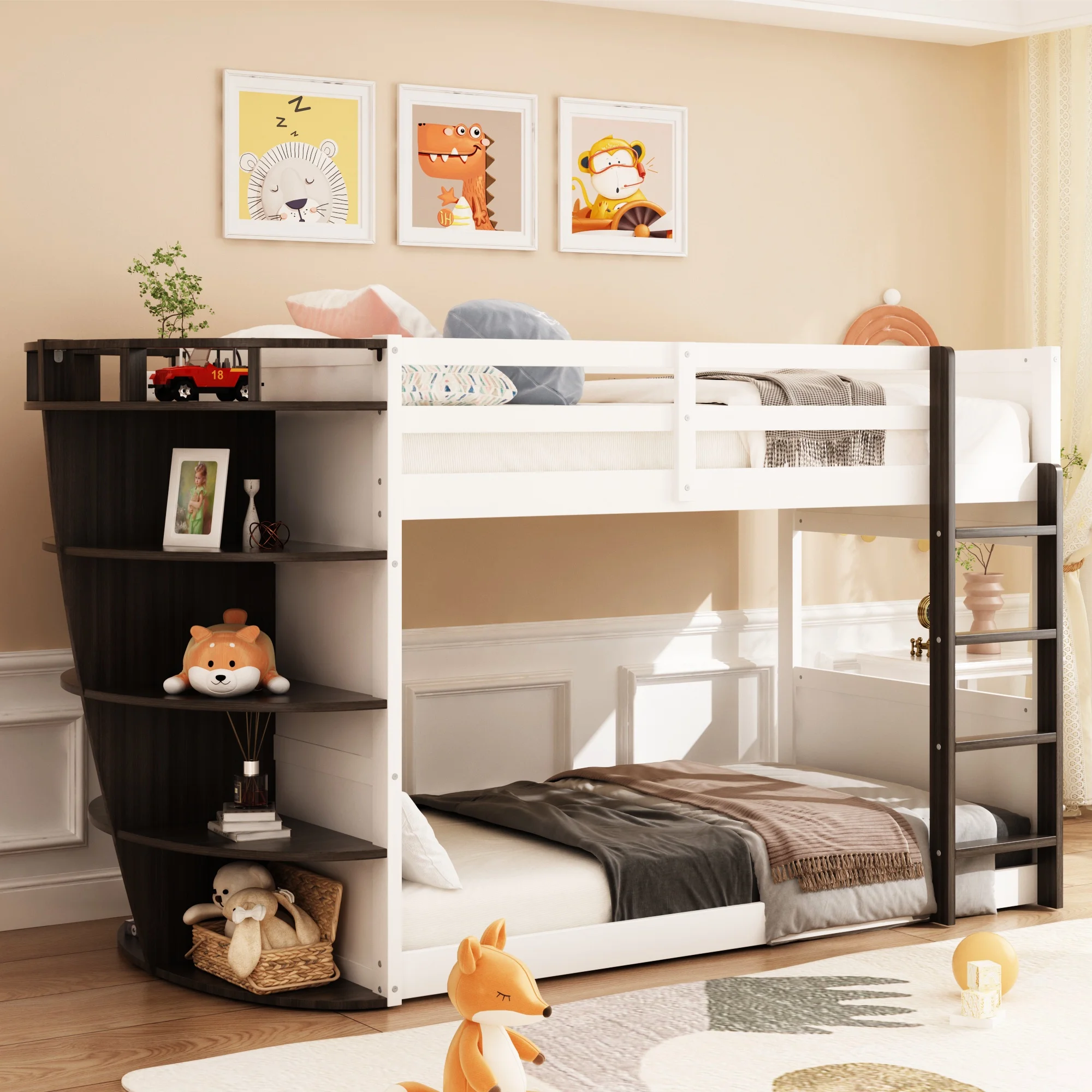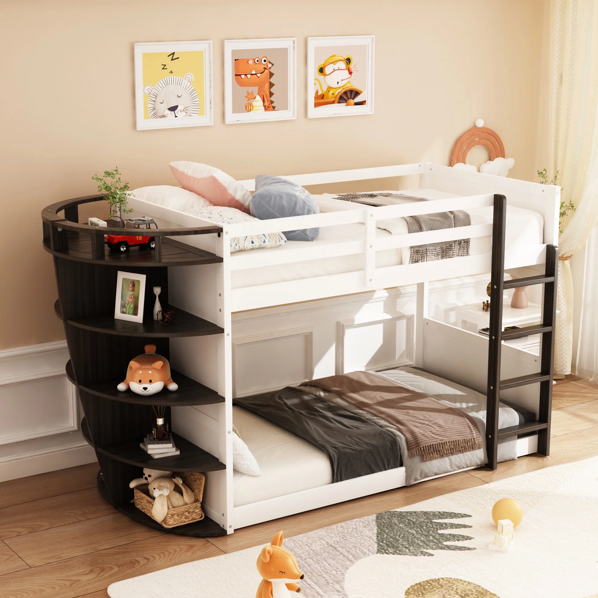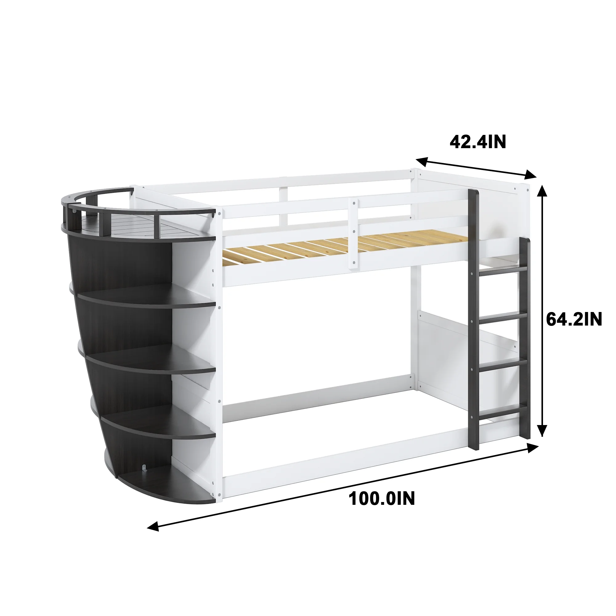 Bunk Bed Boat-Like Shape Design with Storage Shelves, Wooden Frame for Kids Teens (Espresso)