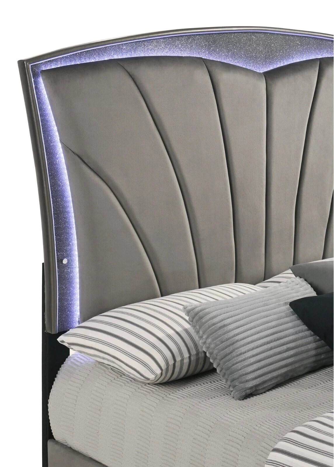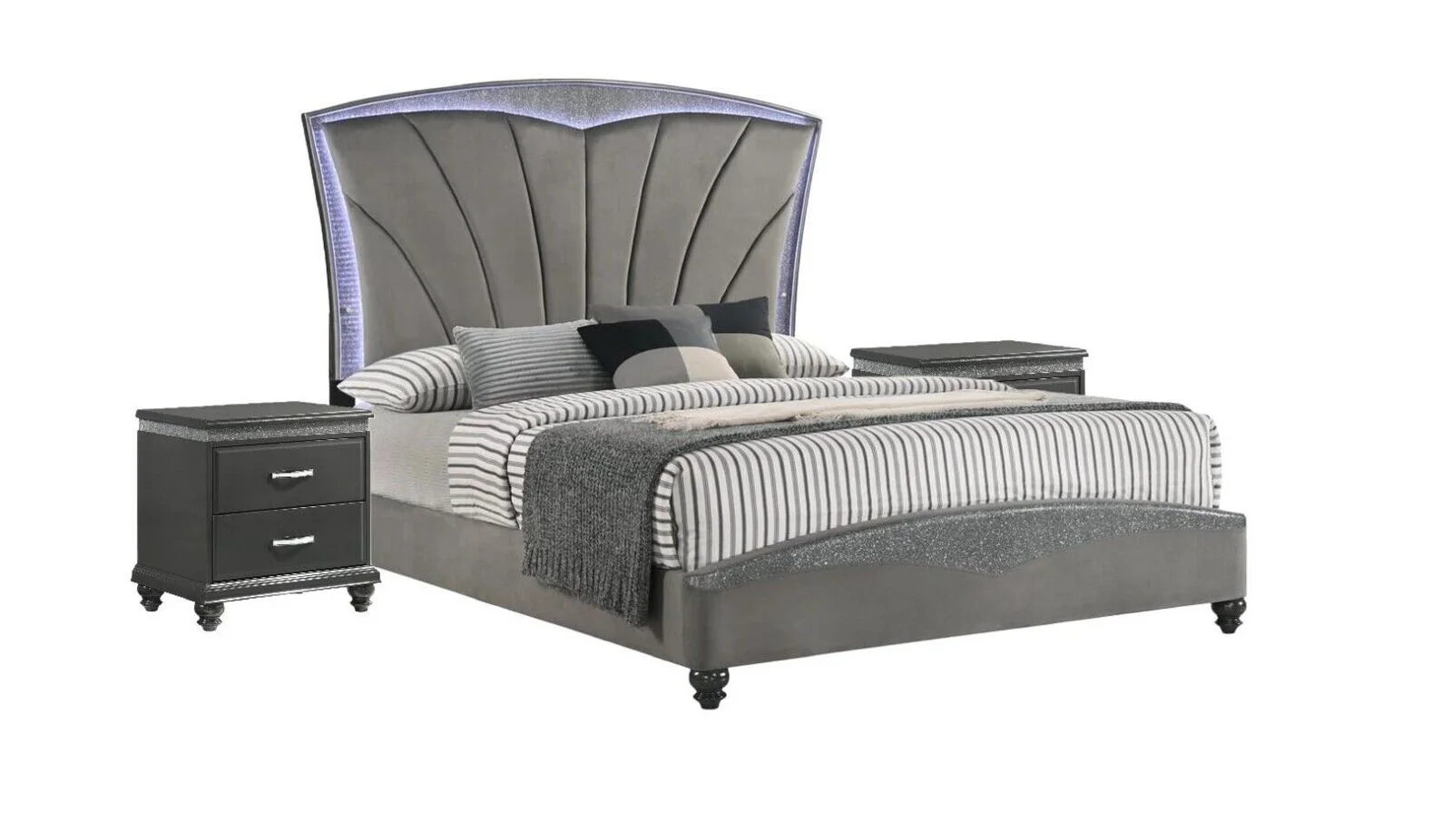 Modern 3Pc Queen Size Panel Bed Nightstands Set Glitter Upholstered Headboard Gray Blue LED Wooden Furniture