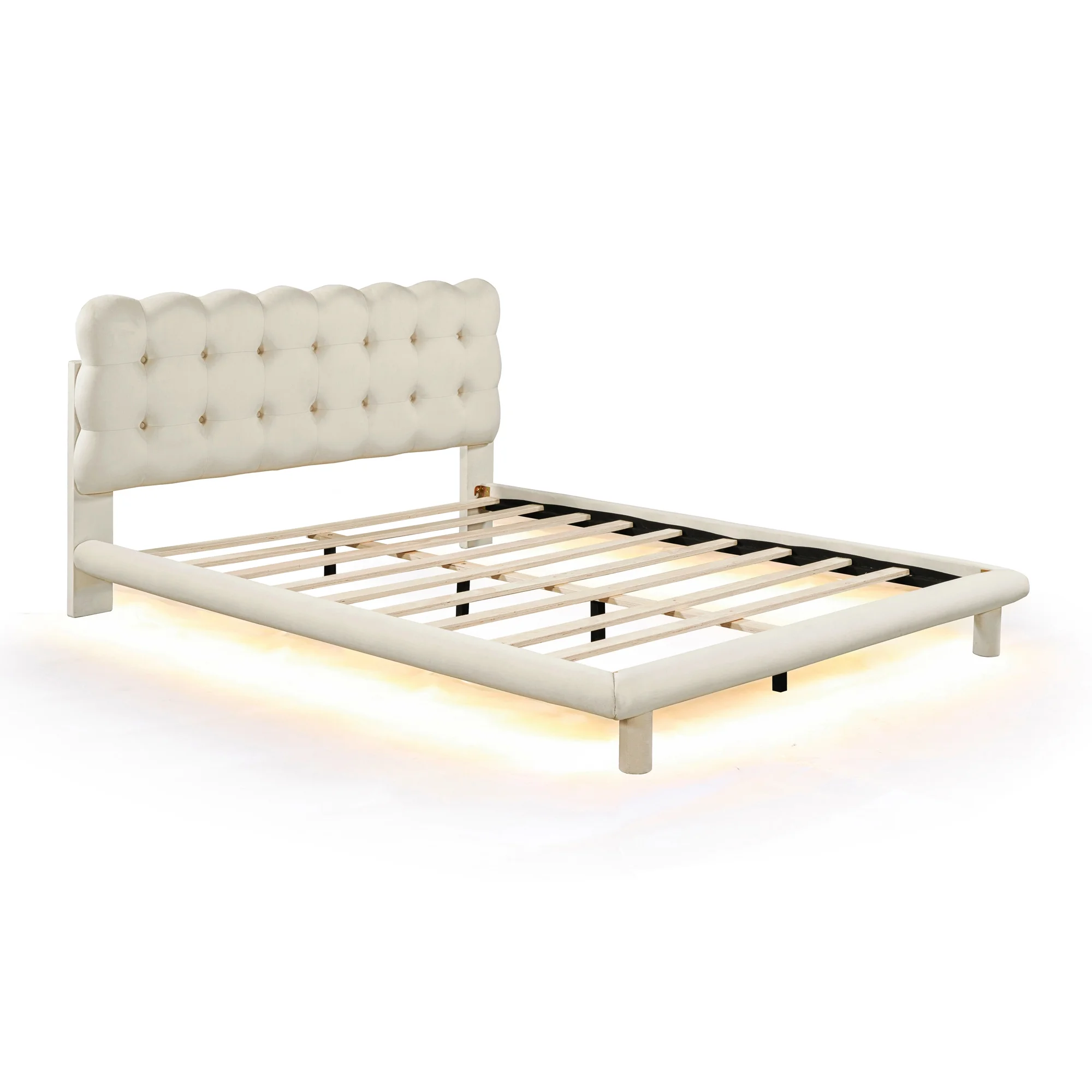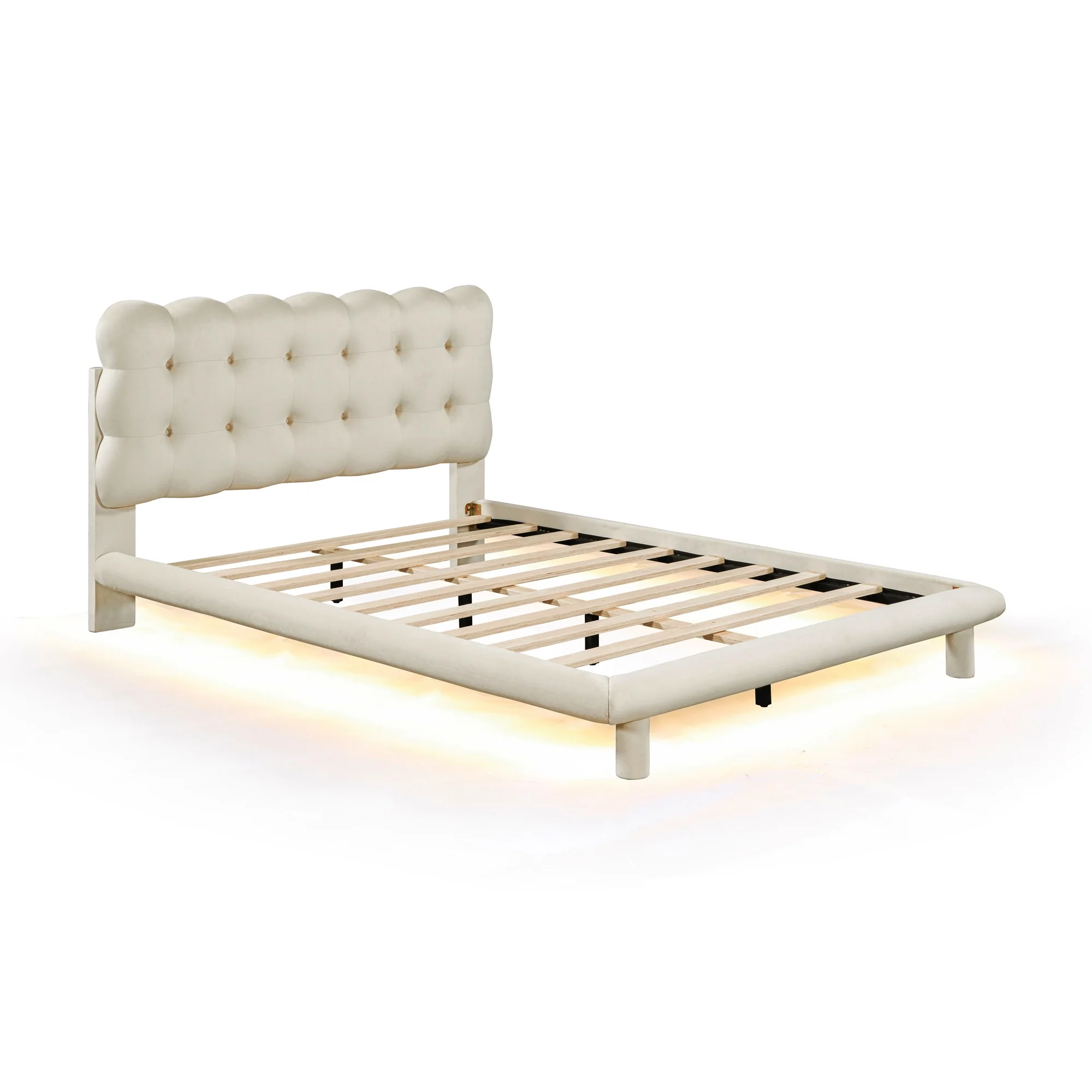 CoSoTower Queen Size Velvet Platform Bed with LED Frame, Thick & Soft Fabric and Button-Tufted Design Headboard, Beige