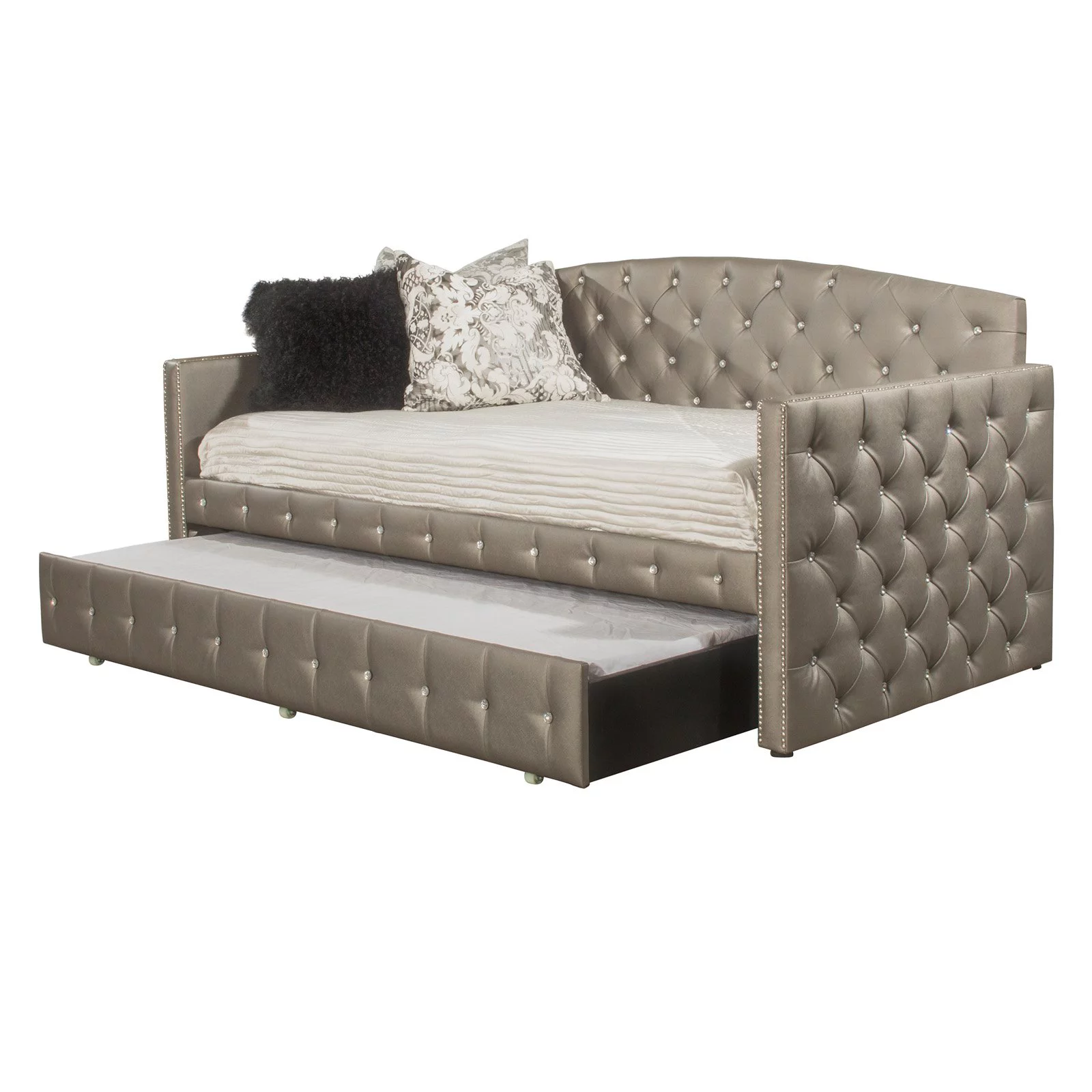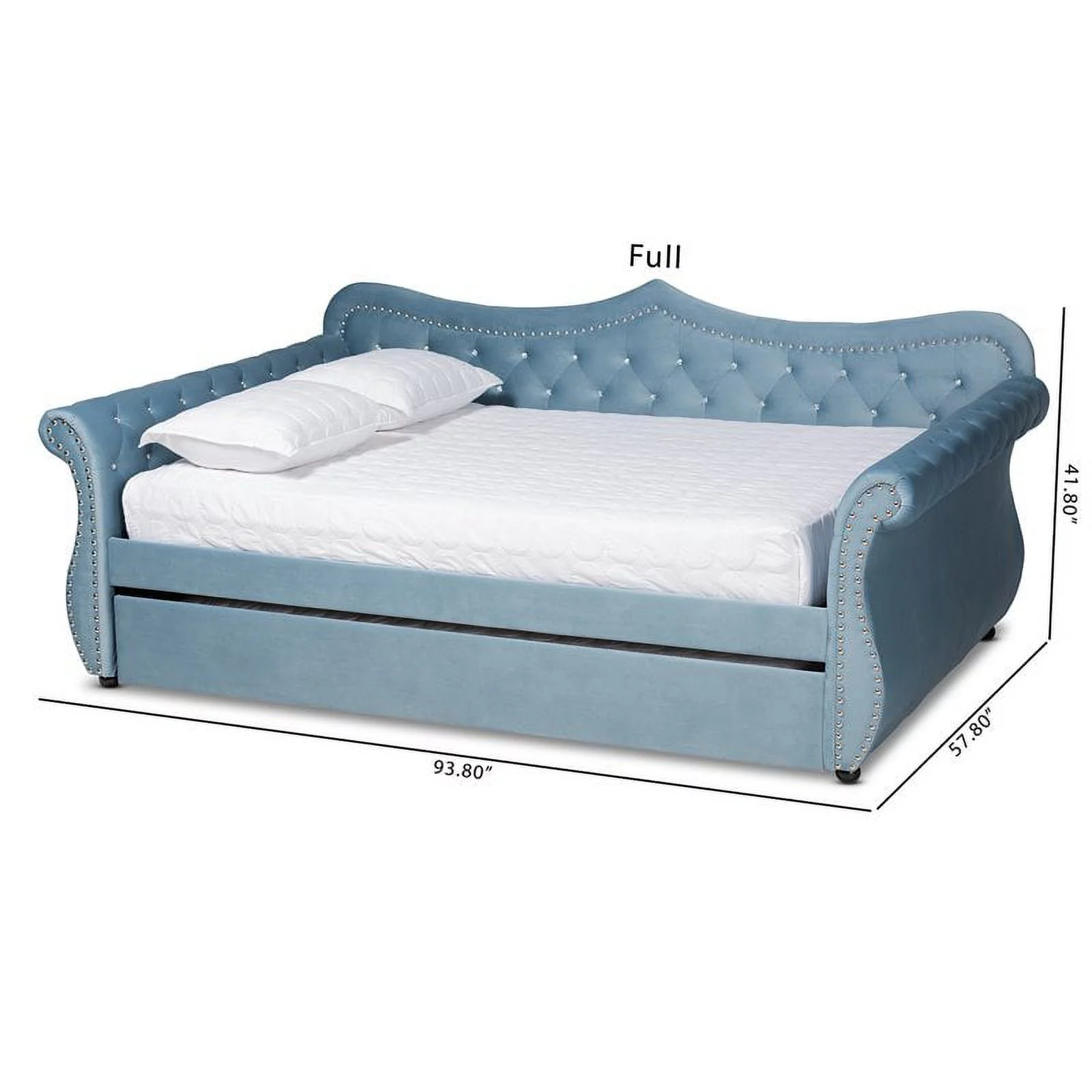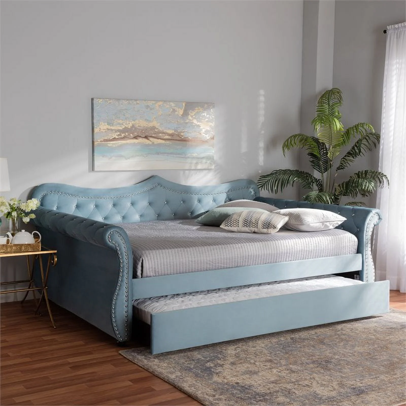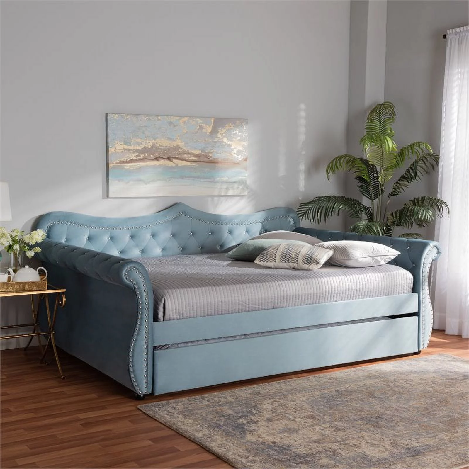 Bowery Hill Light Blue Velvet Tufted Queen Size Wood Daybed with Trundle