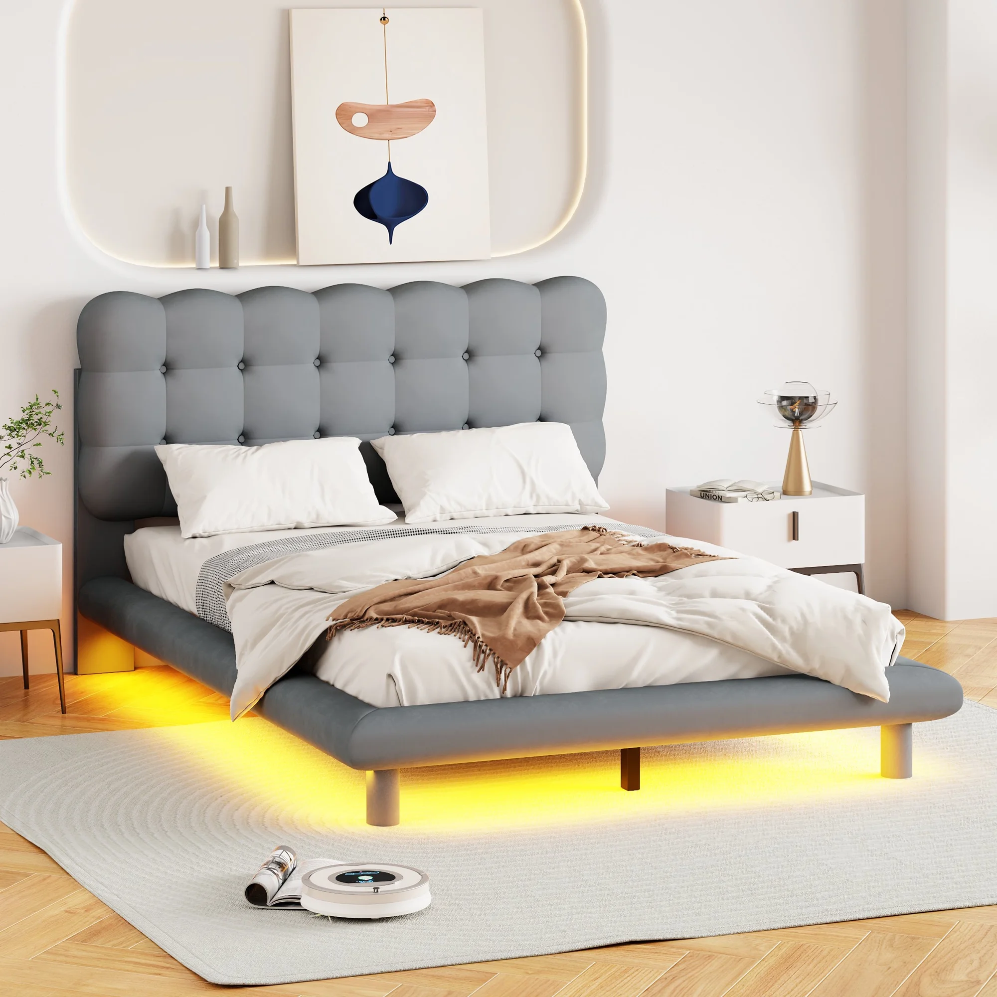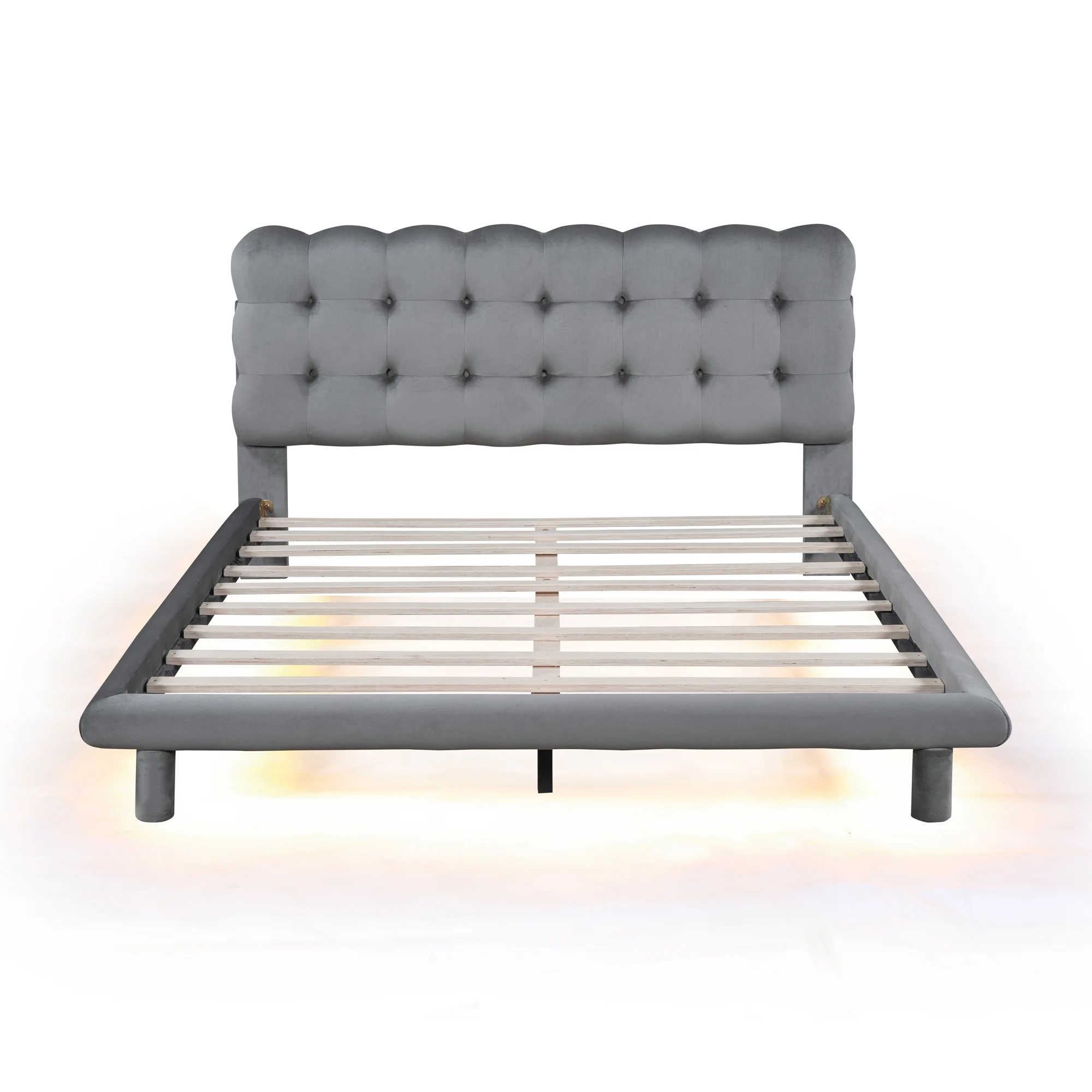 CoSoTower Queen Size Velvet Platform Bed with LED Frame, Thick & Soft Fabric and Button-Tufted Design Headboard, Gray