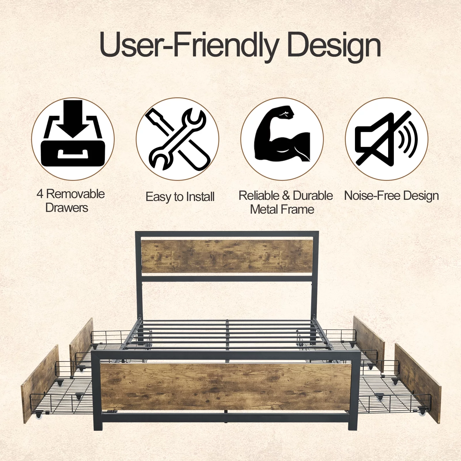 4 Piece Modern Bedroom Set with Queen Size Bed, Headboard, and (Set of 2) Night Stands in Walnut