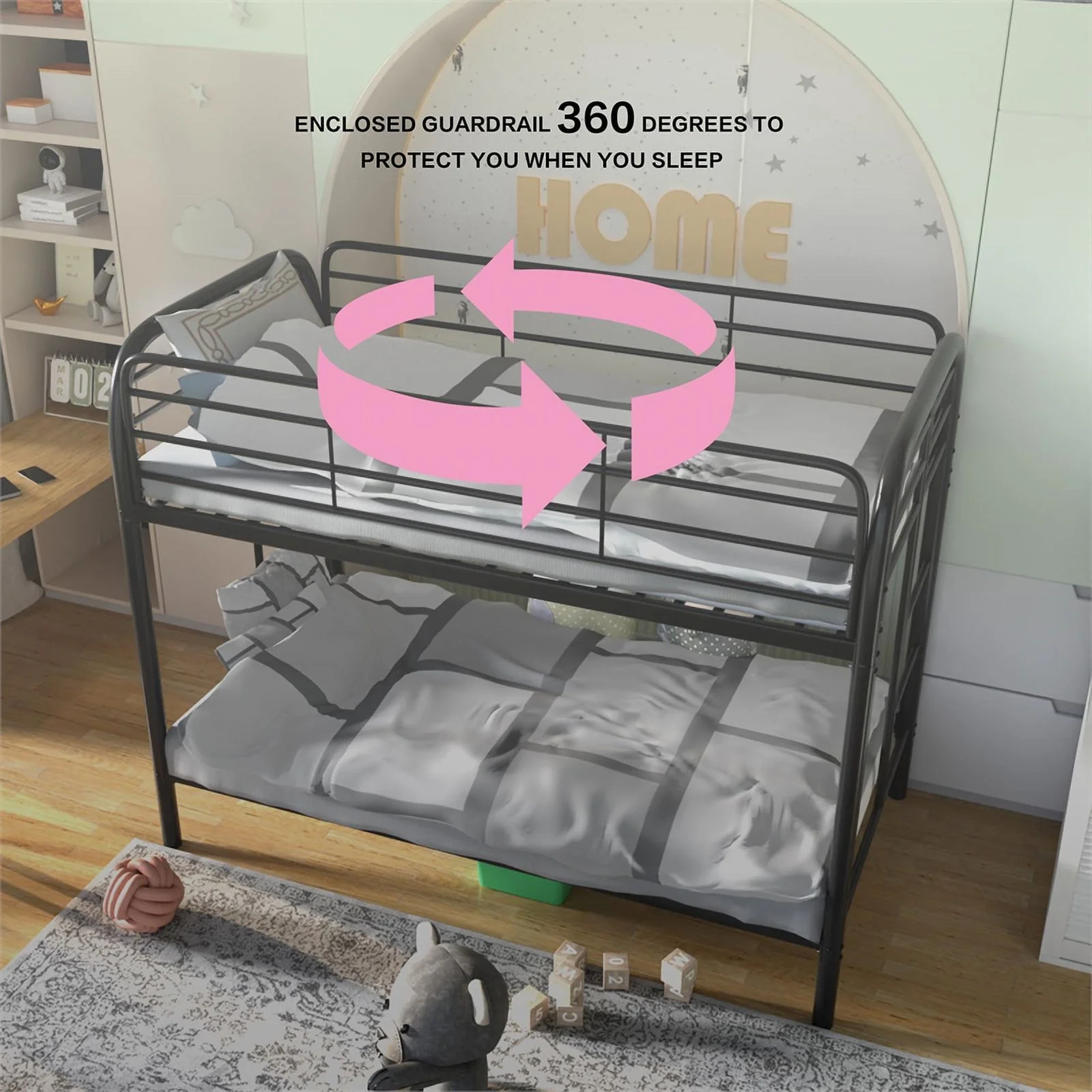 Pemberly Row Metal Twin-Over-Twin Bunk Beds with Secure Guard Rail in Black