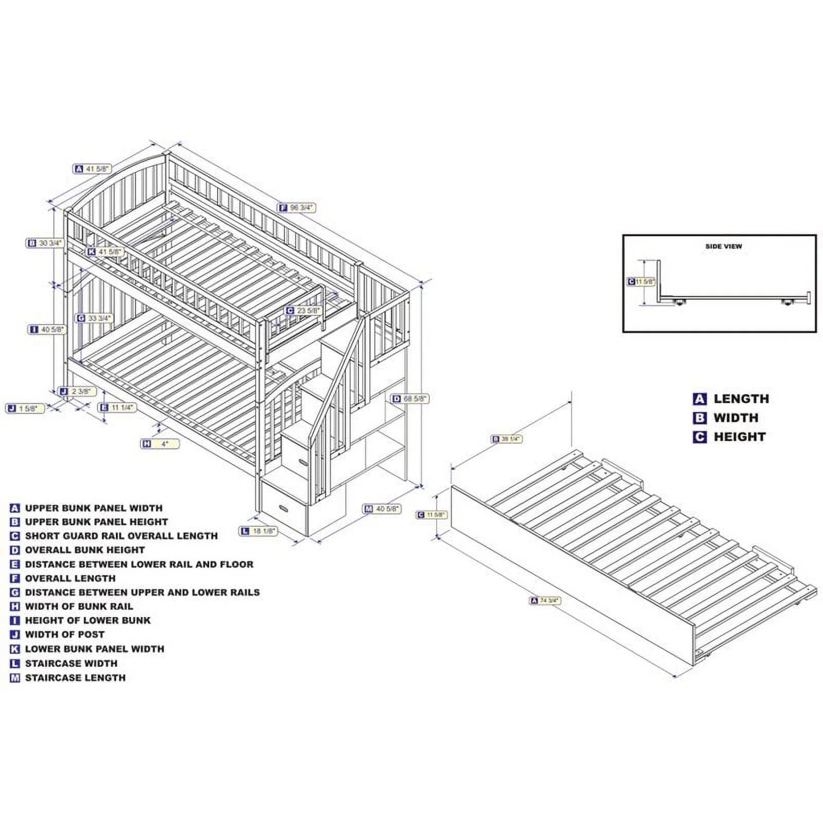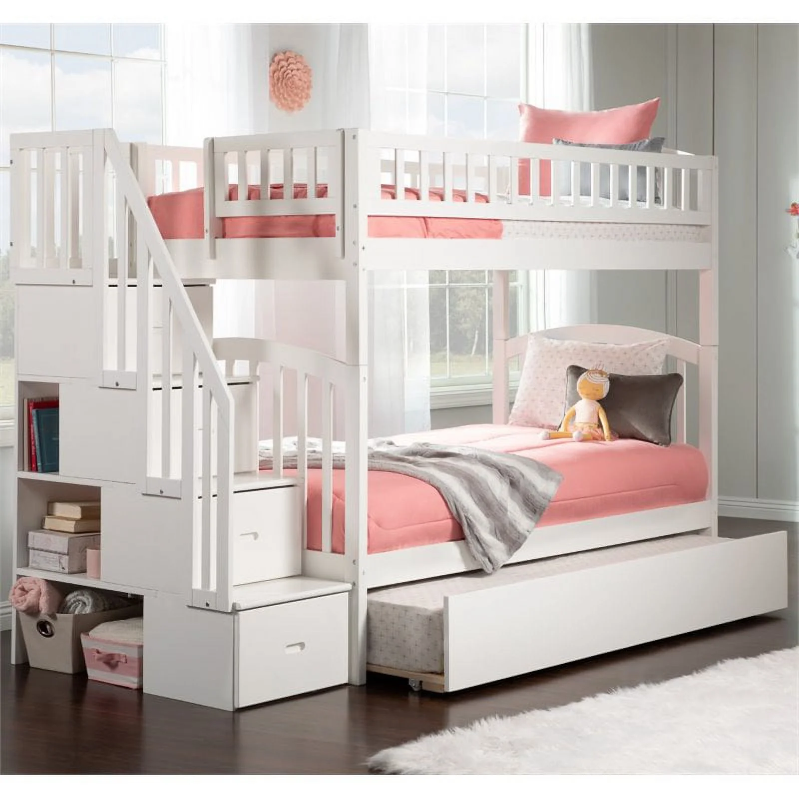 Pemberly Row Traditional Wood Staircase Bunk Twin Over Twin w/ Trundle in White