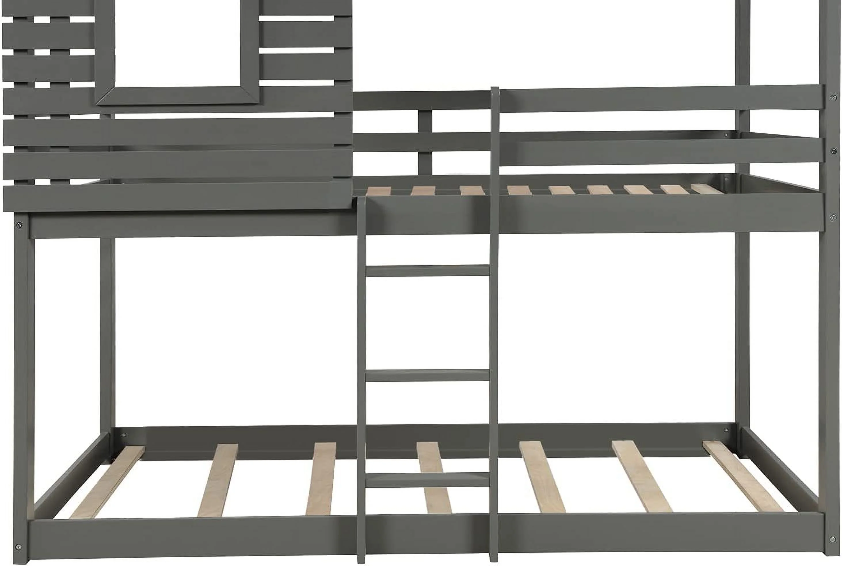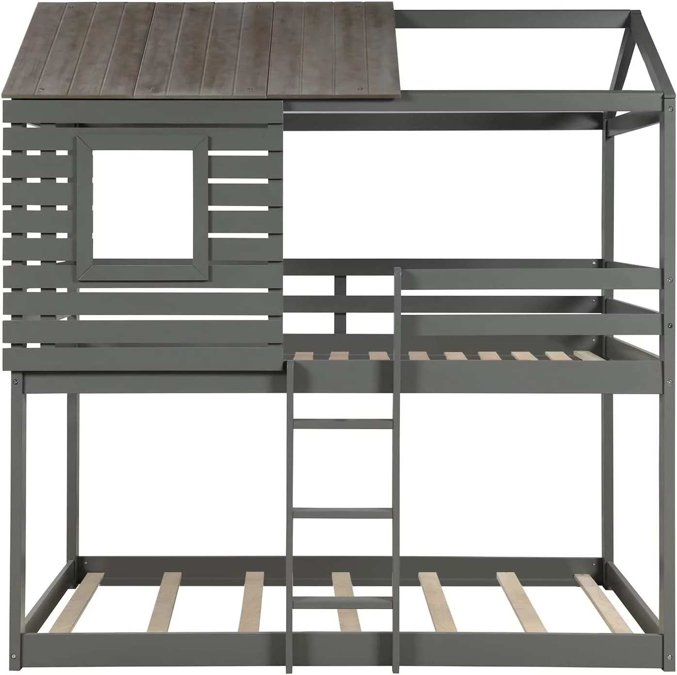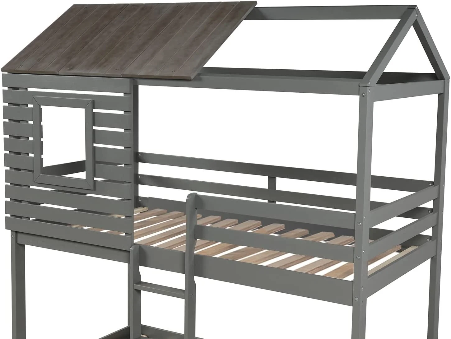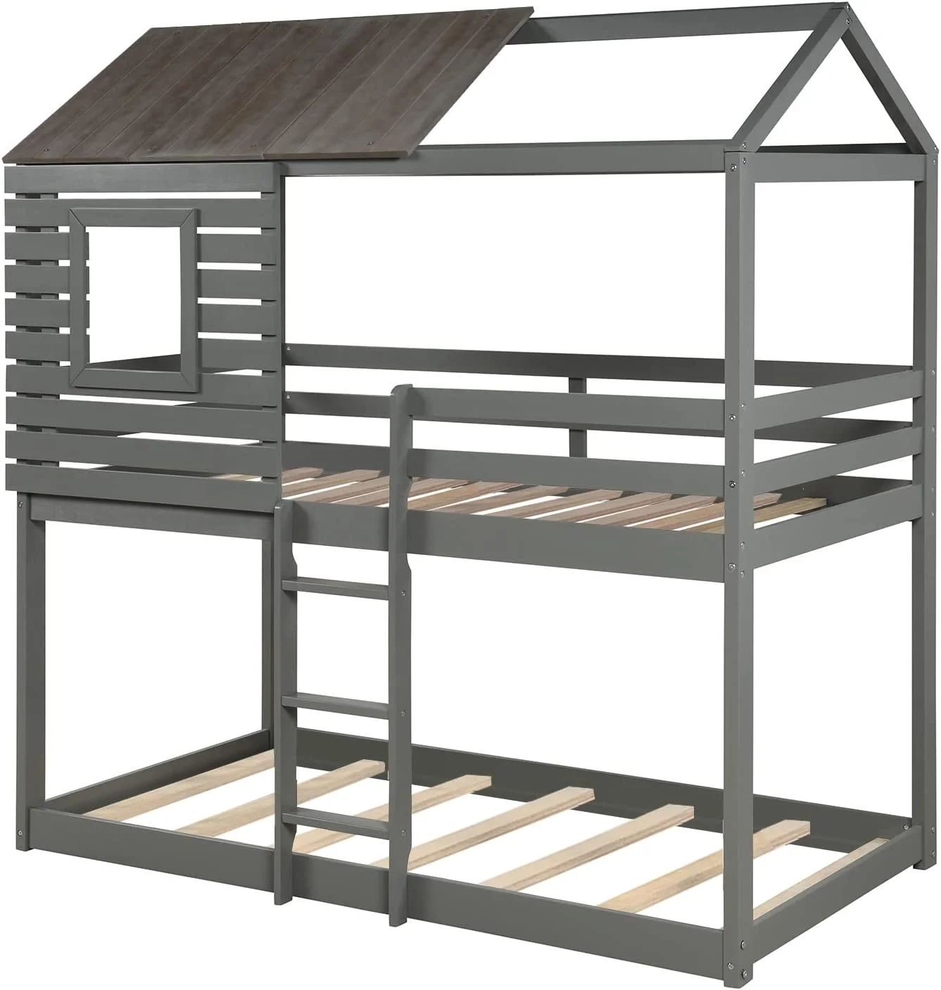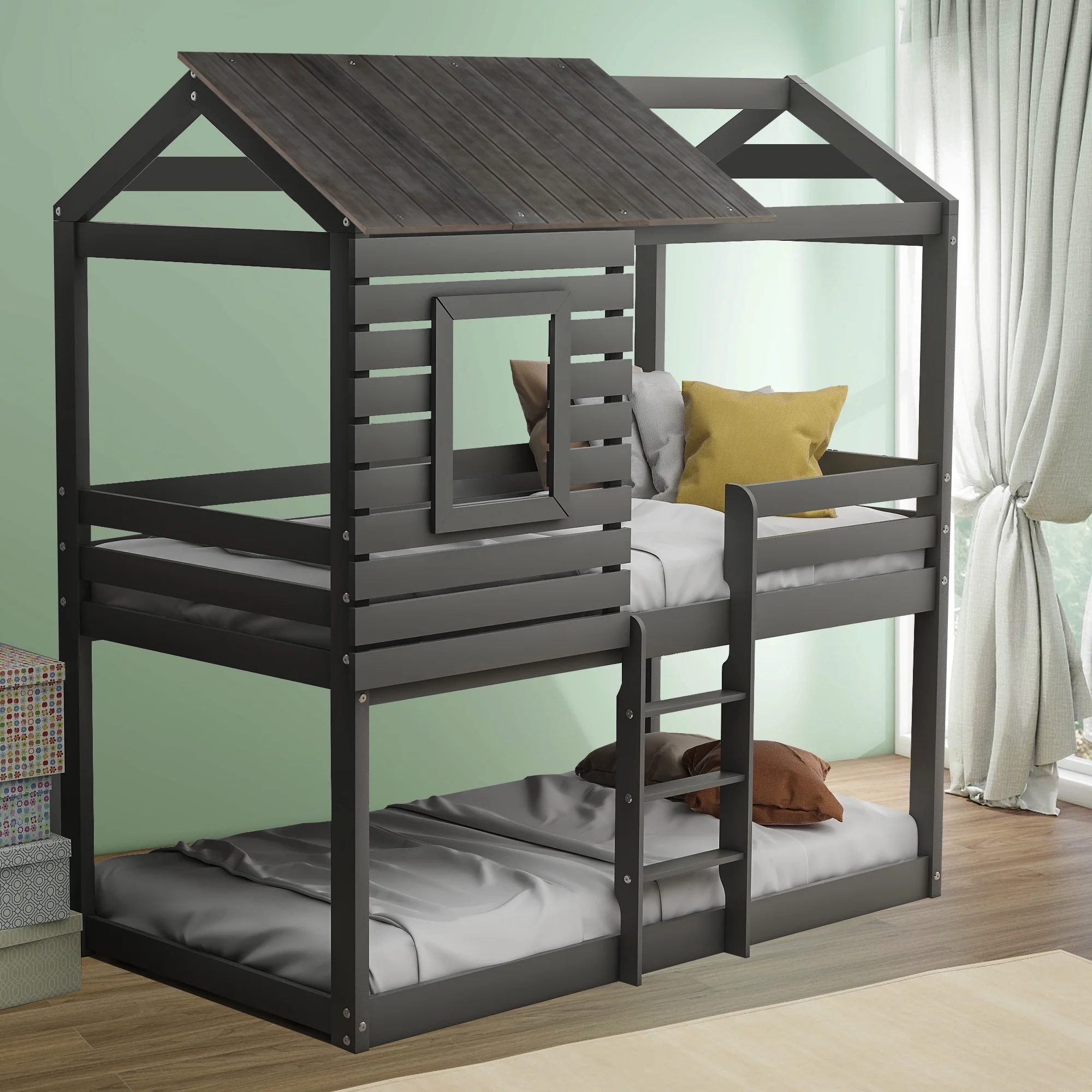 Lifeand Twin Over Twin Bunk Bed with Roof, Window, Guardrail, Ladder for Kids Teens (Dark Gray)