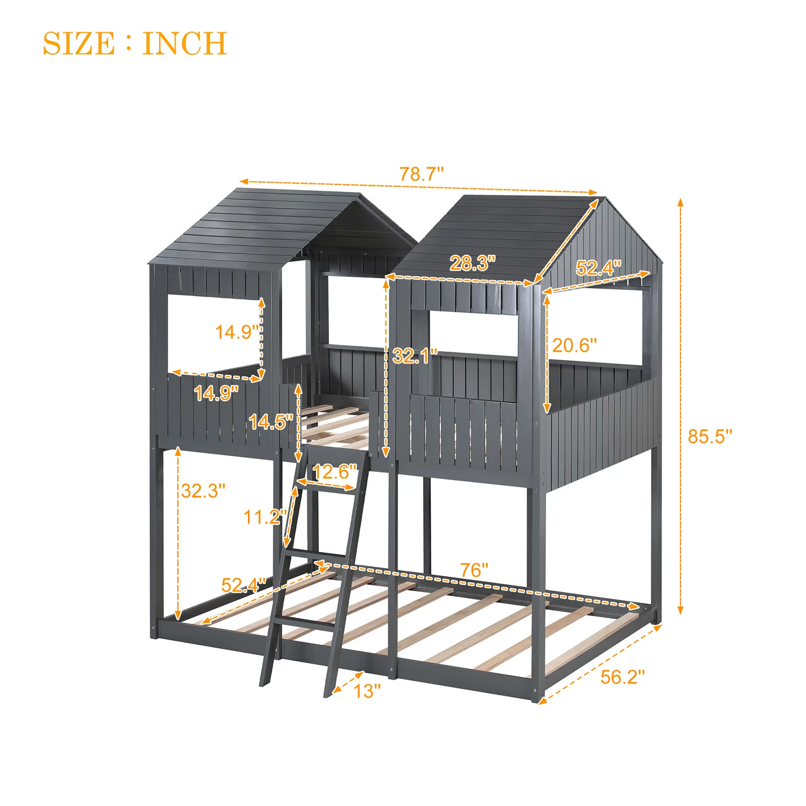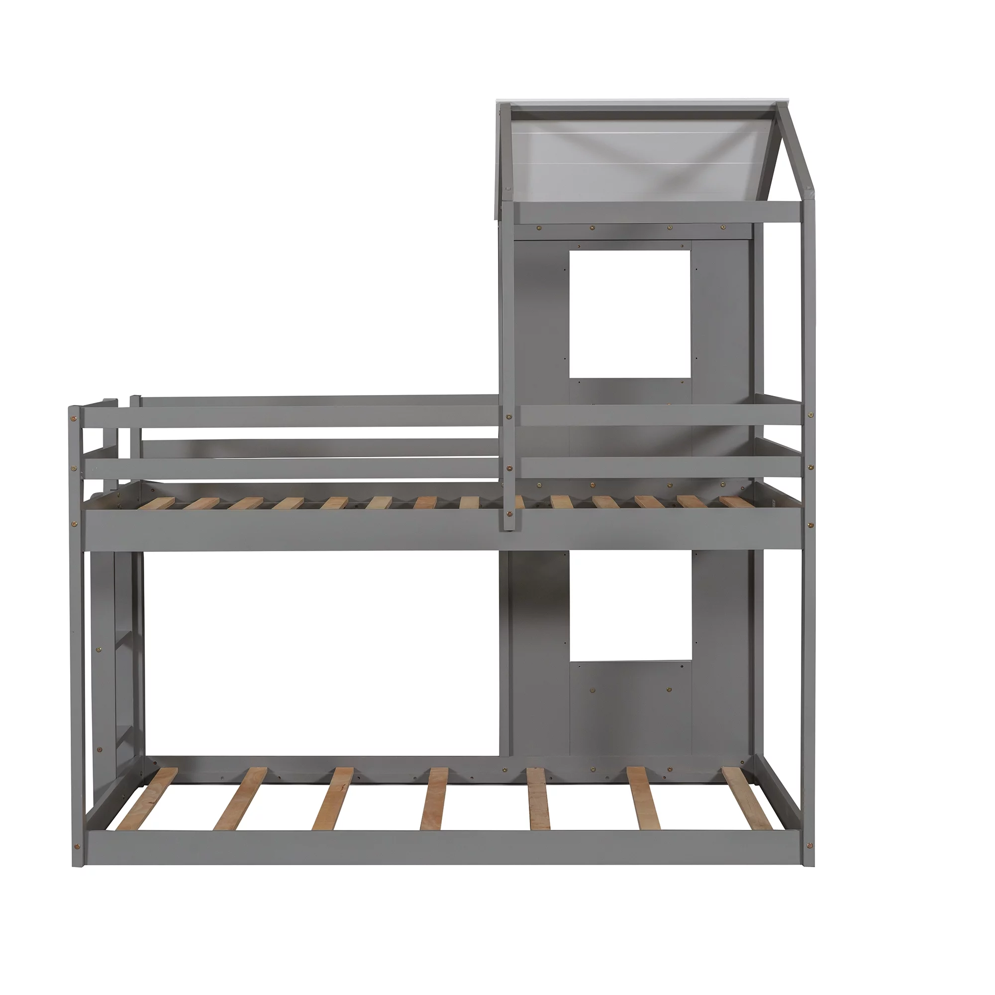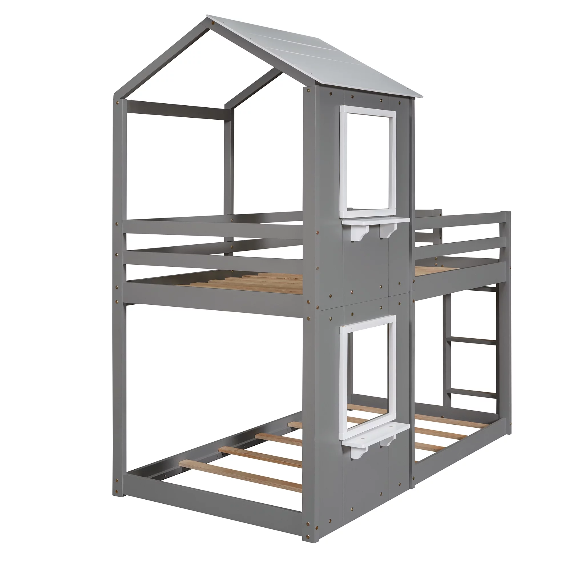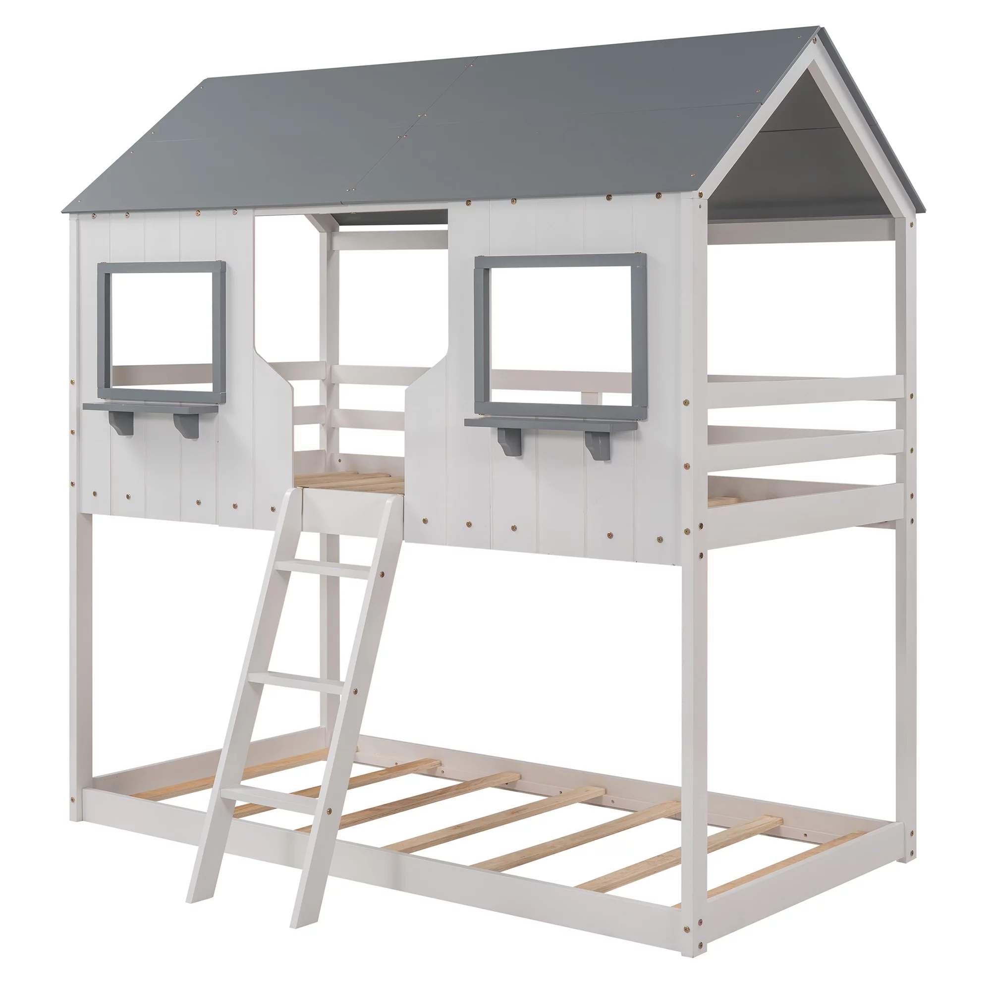 Lifeand Twin Over Twin Bunk Bed with Roof, Window, Guardrail, Ladder for Kids Teens (Dark Gray)