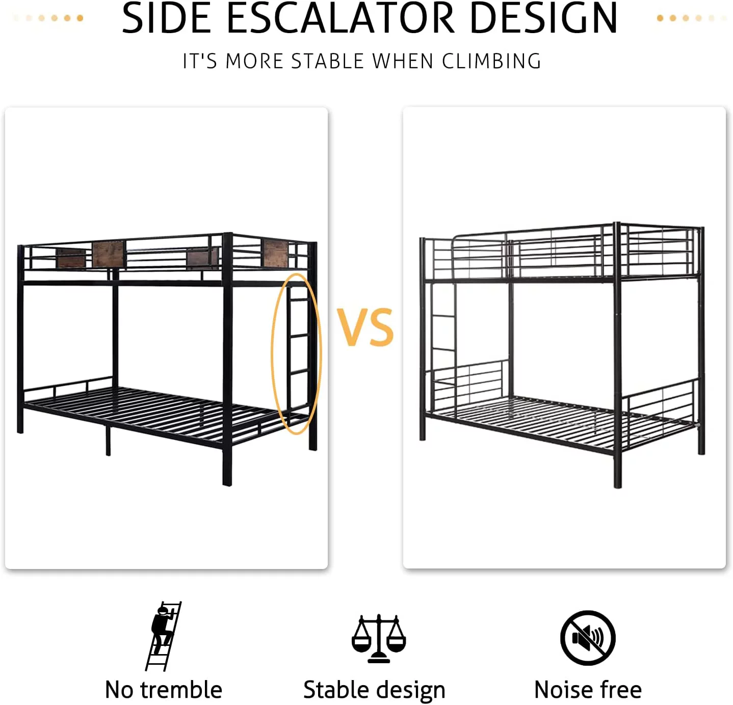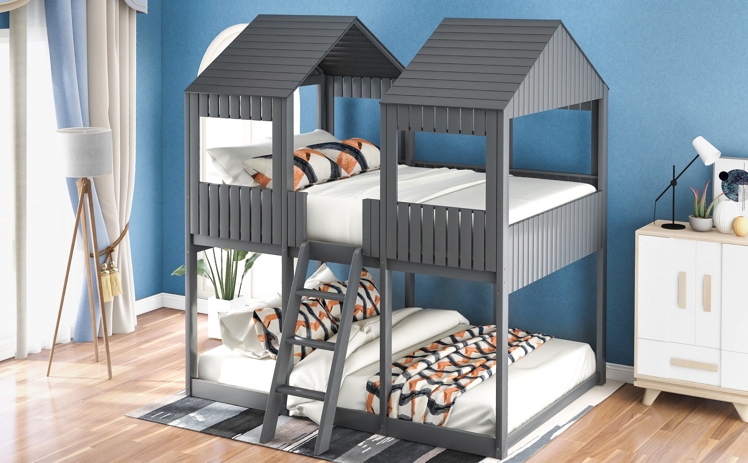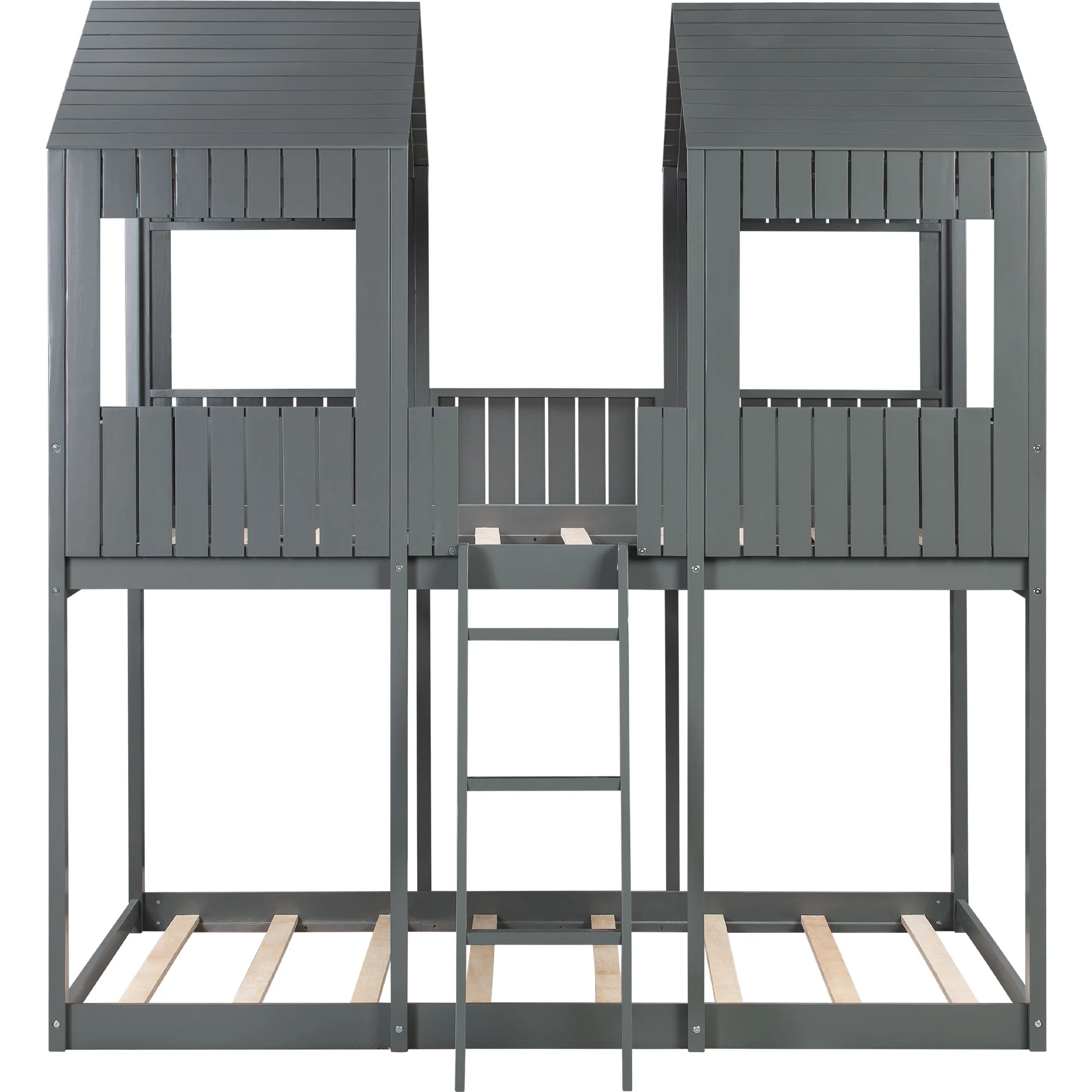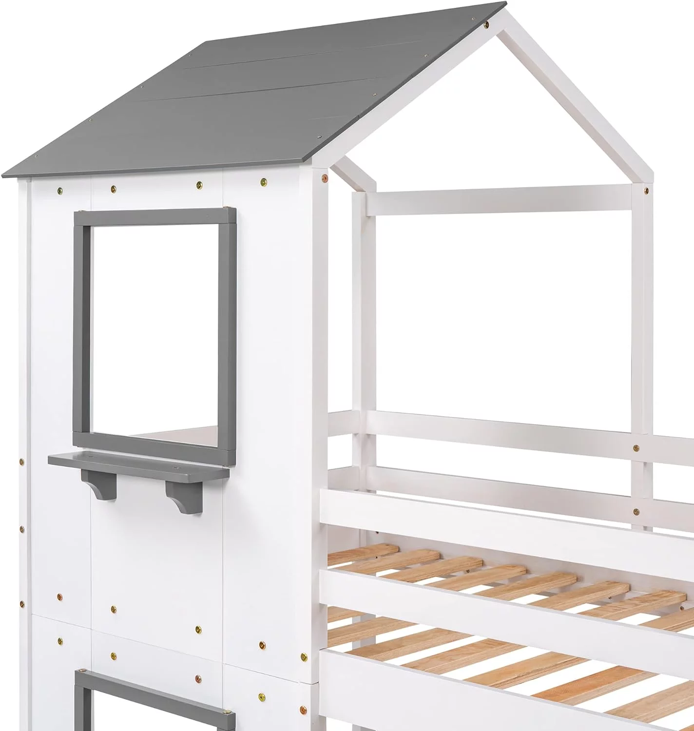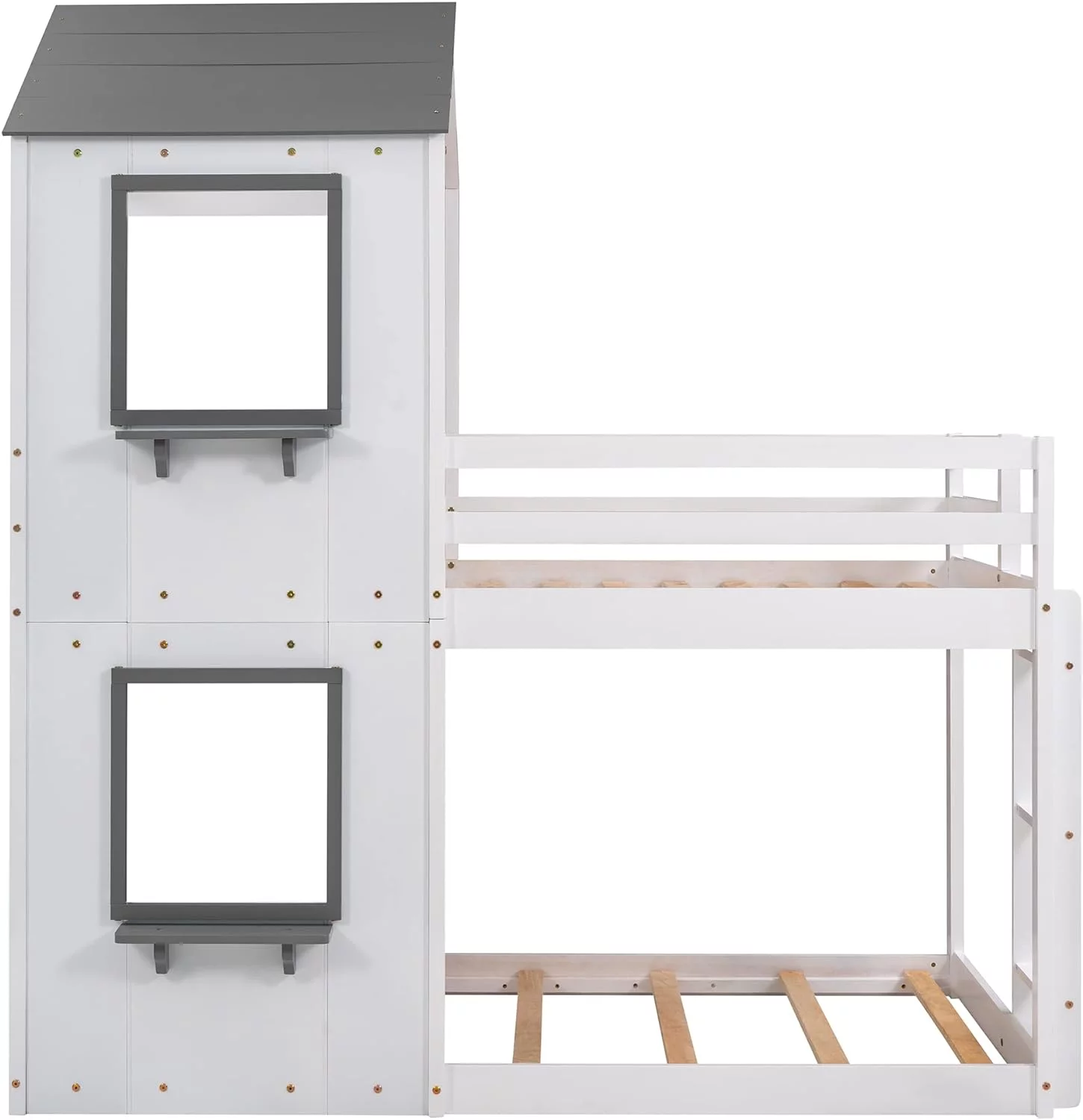 Lifeand Twin Over Twin Bunk Bed with Roof, Window, Guardrail, Ladder for Kids Teens (Dark Gray)