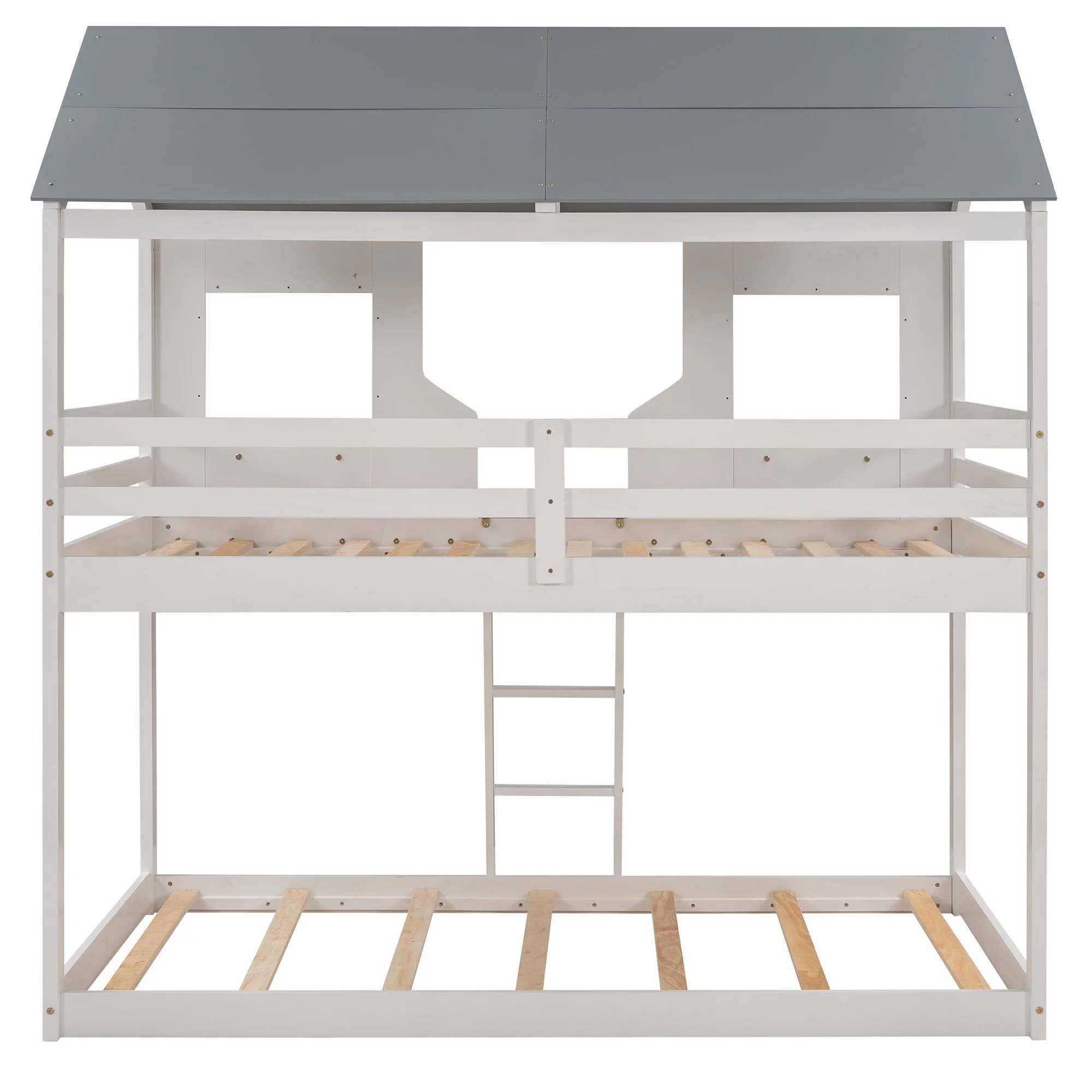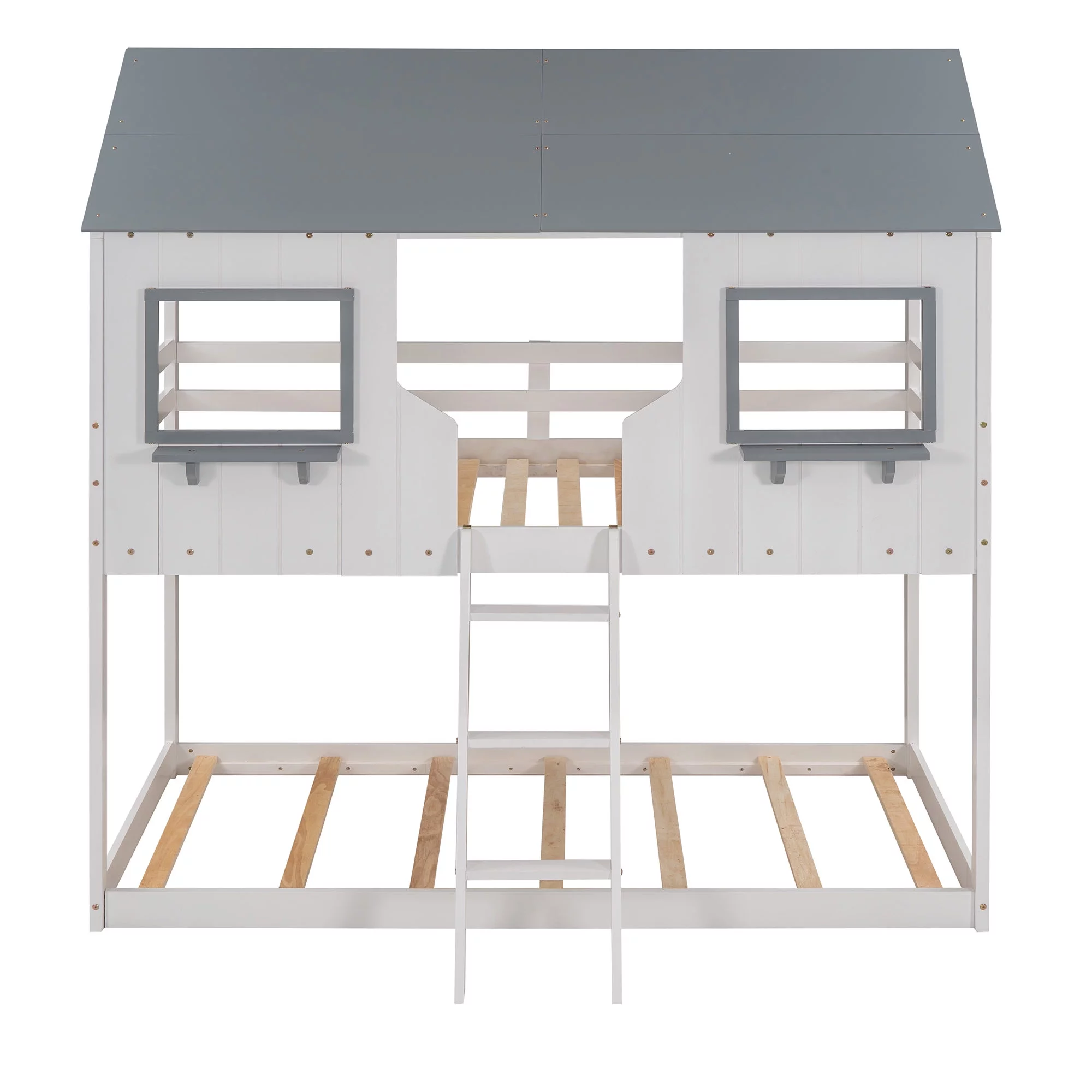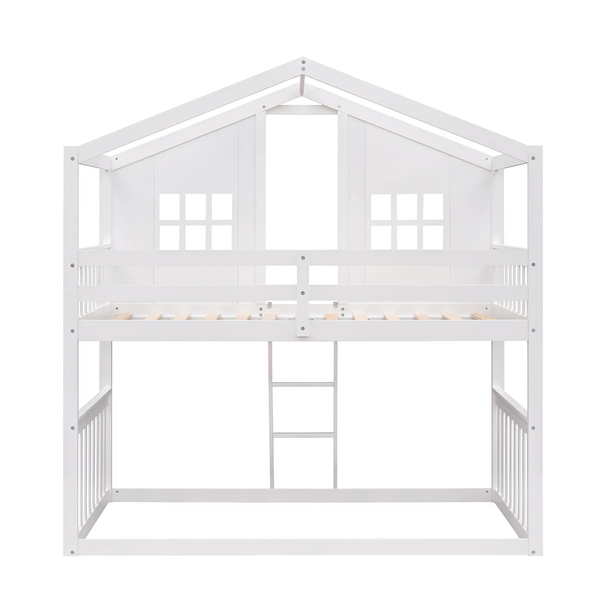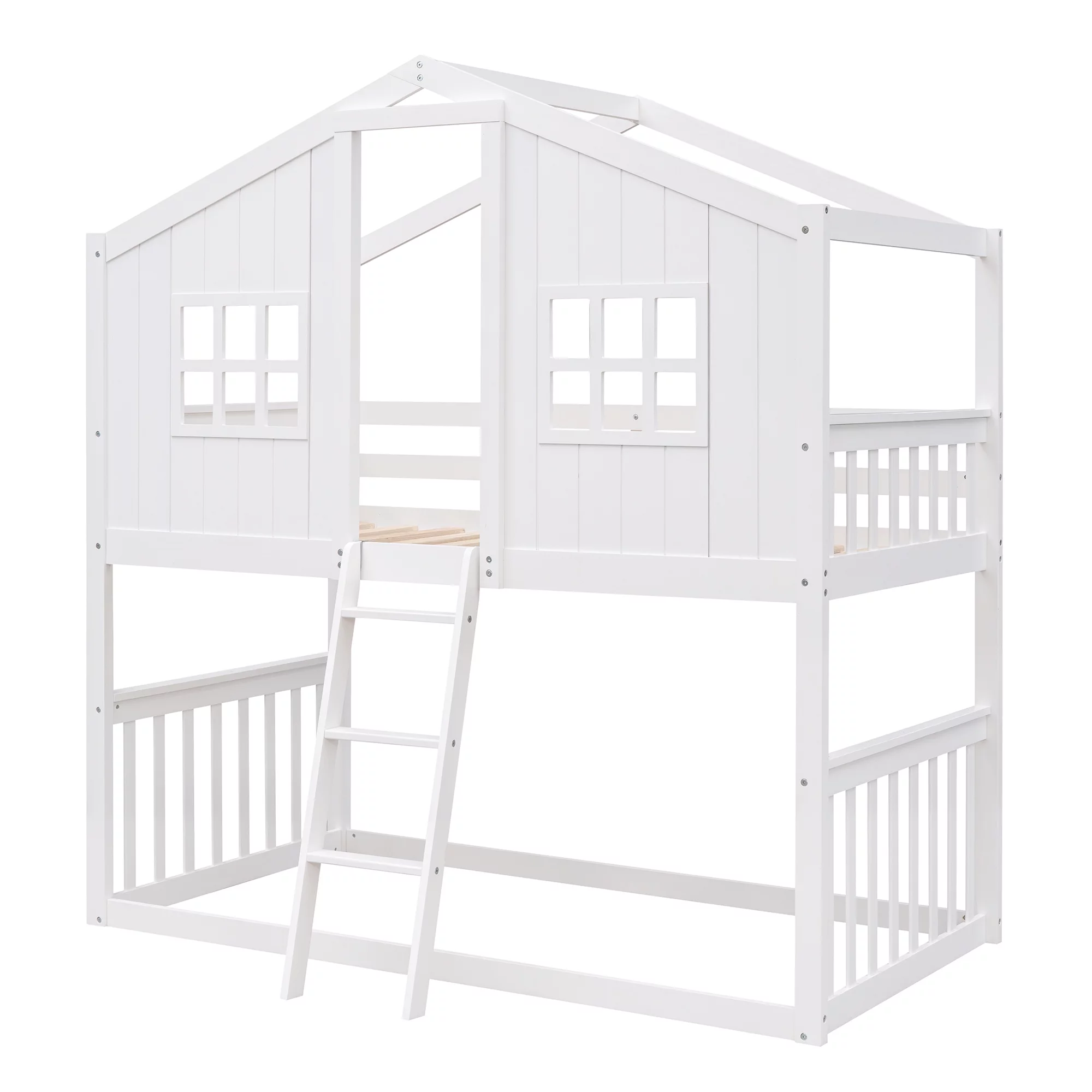 Twin Over Twin House Bunk Bed with Roof and Ladder, Wood Low Bunk Bed for Kids Girls Boys