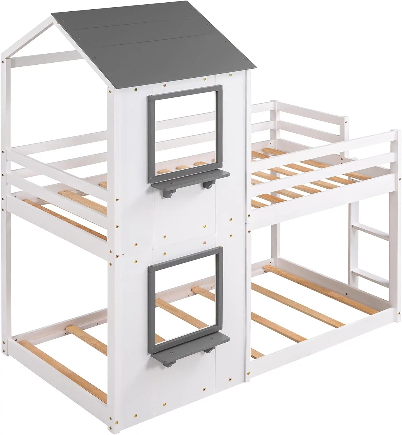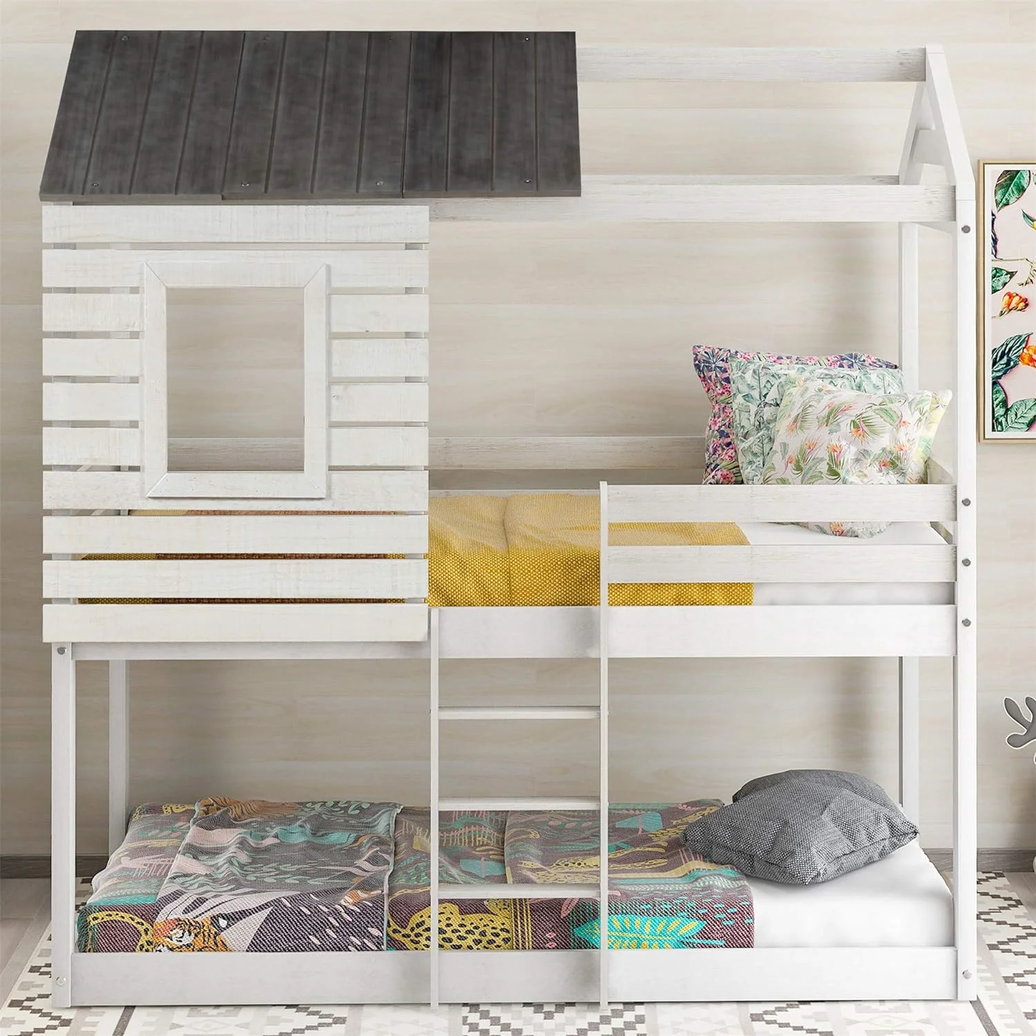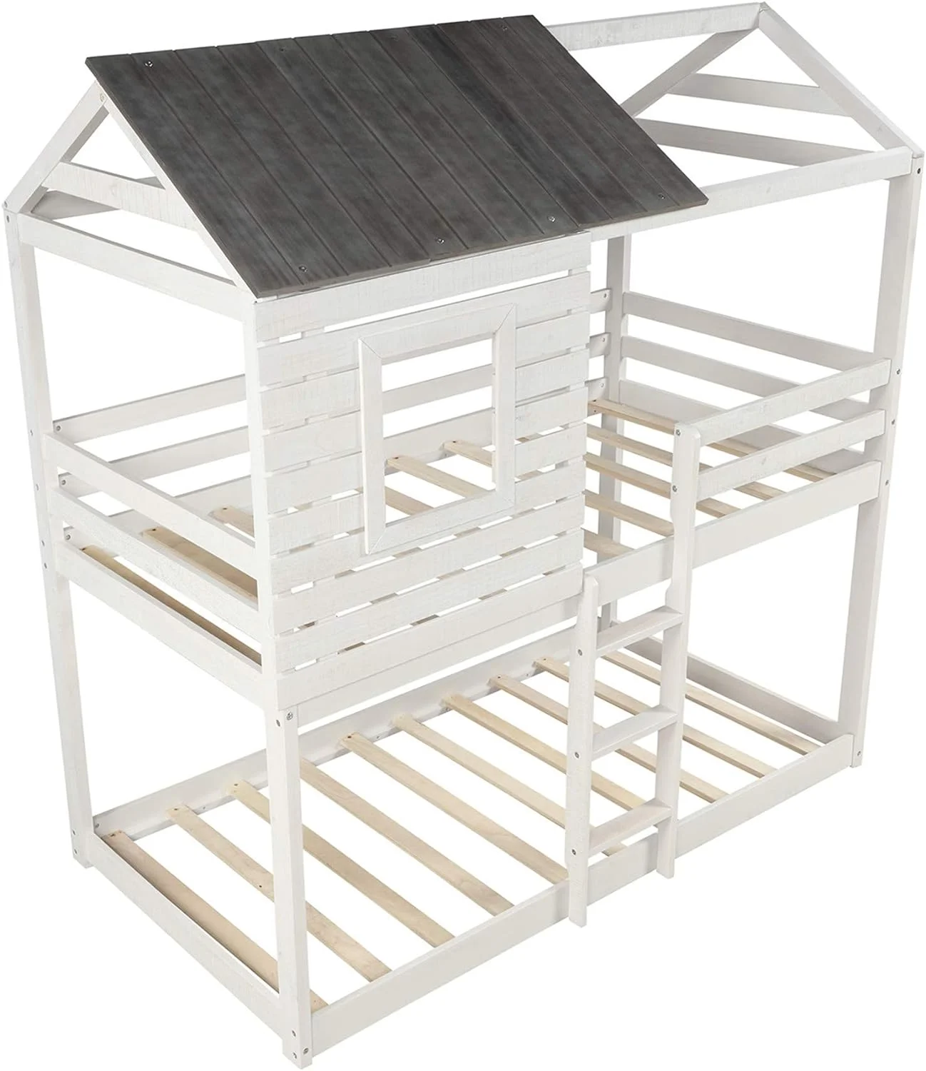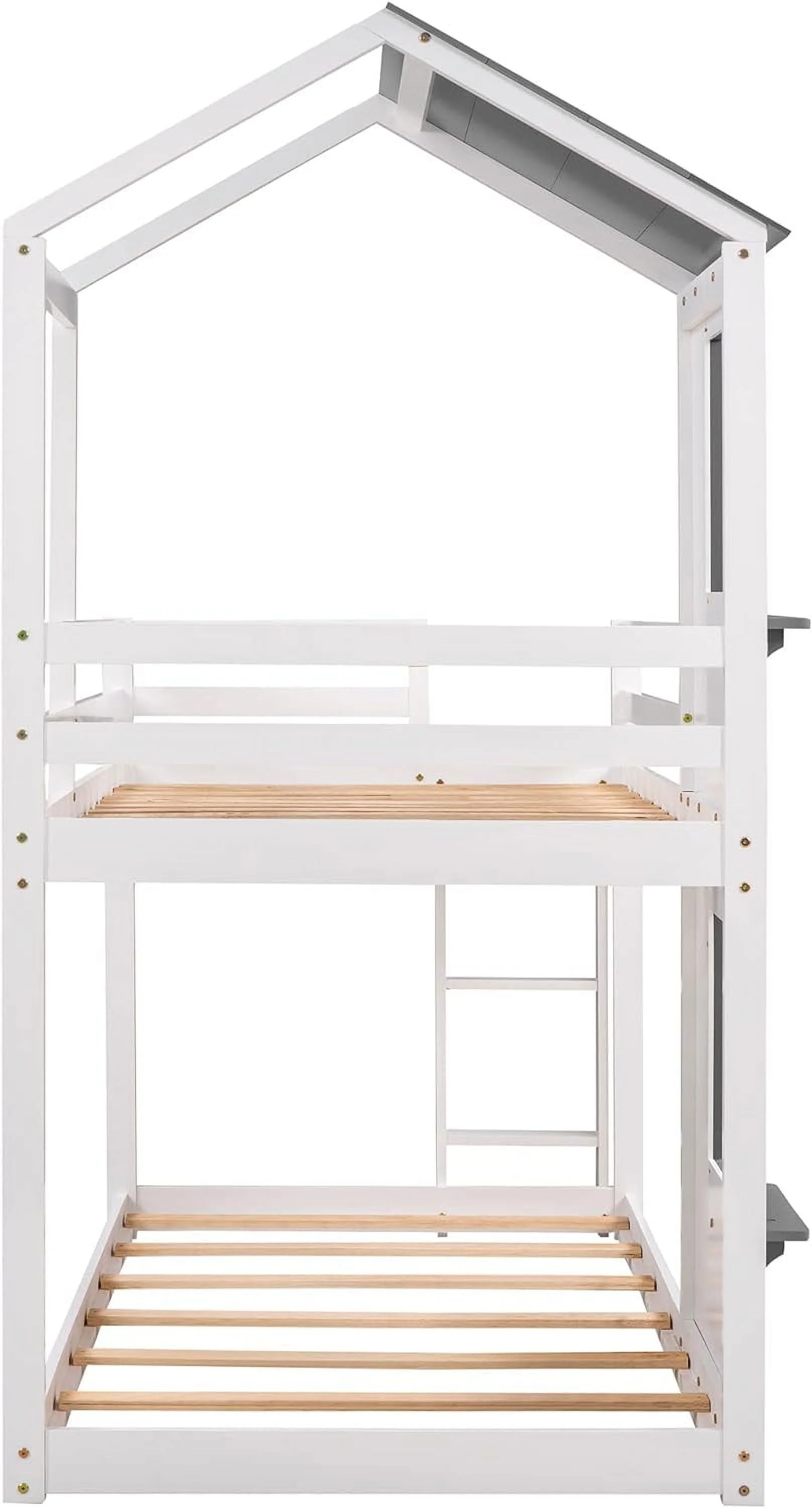 Adrinfly Twin Over Twin Bunk Bed Wood Bed with Roof, Window, Guardrail, Ladder (White)