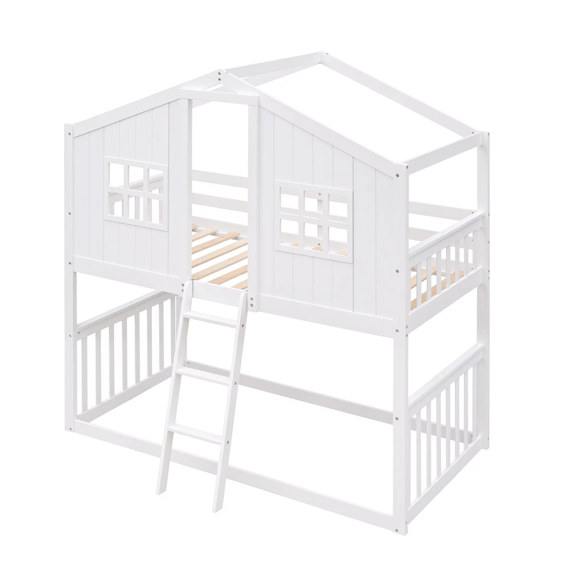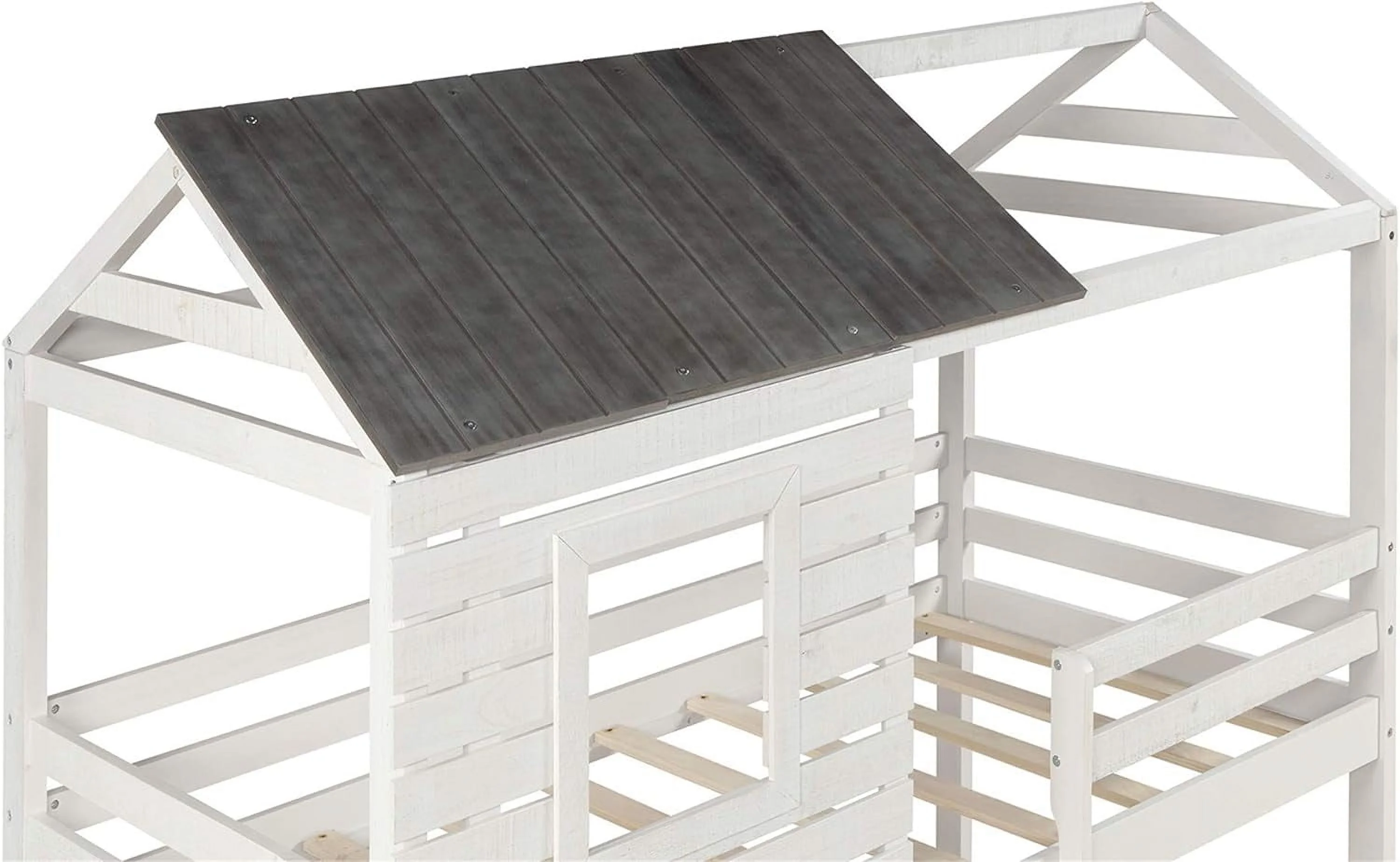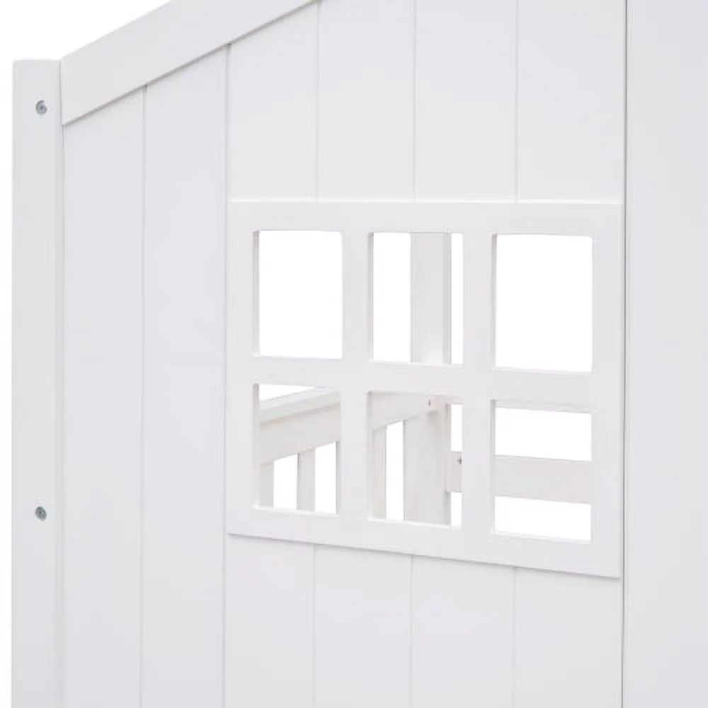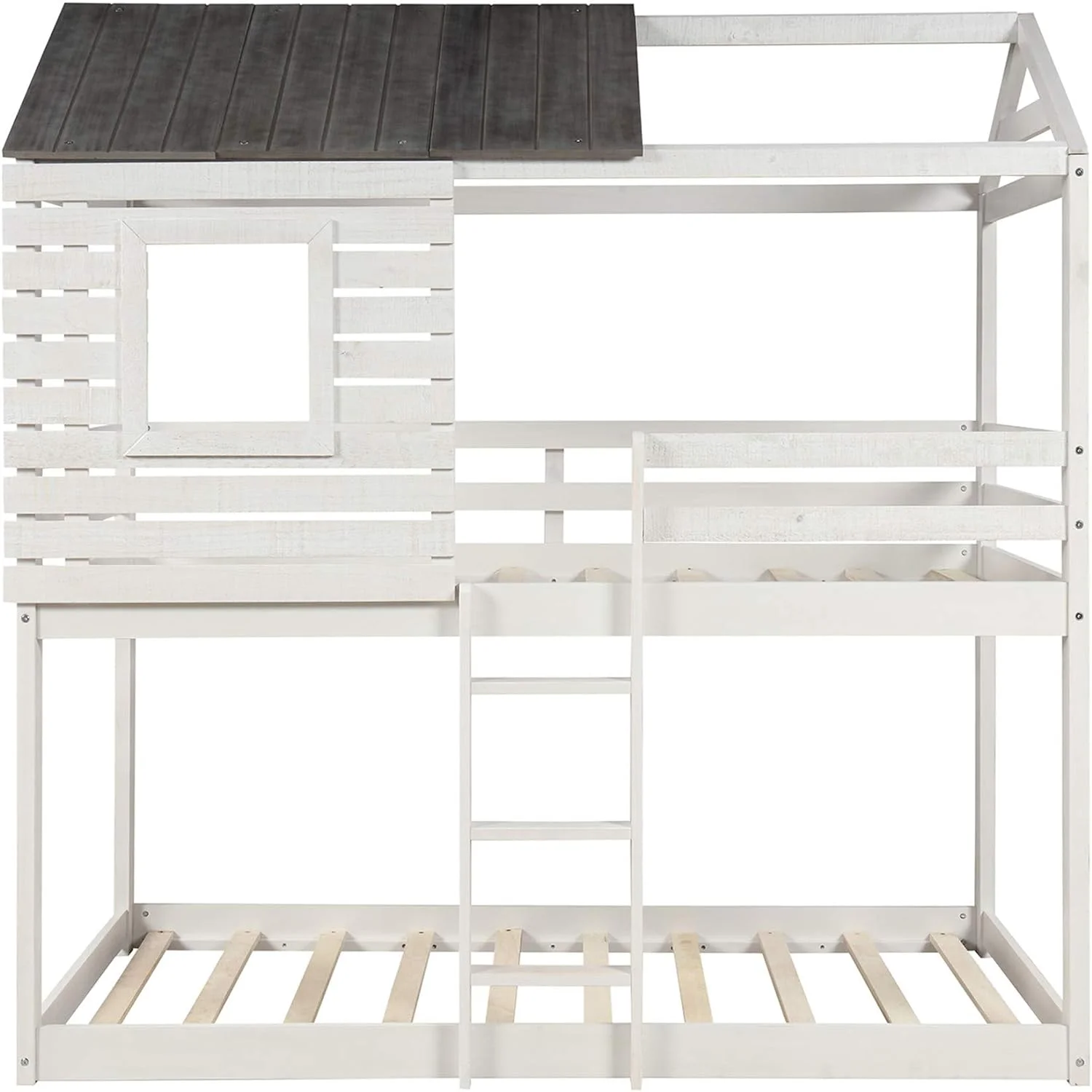 Adrinfly Twin Over Twin Bunk Bed Wood Bed with Roof, Window, Guardrail, Ladder (White)