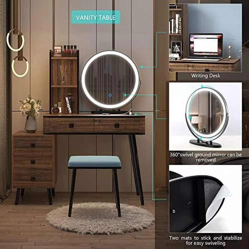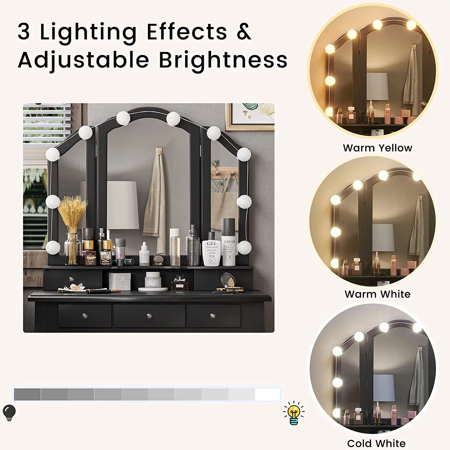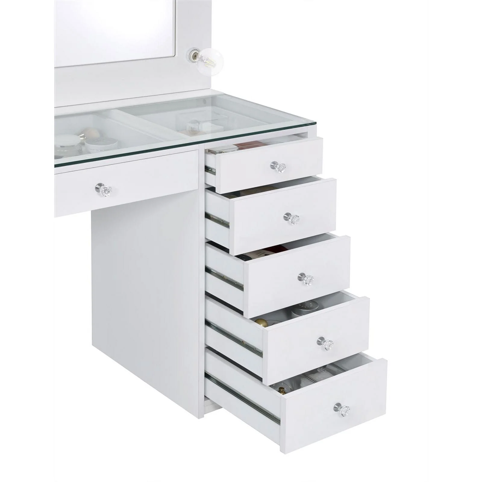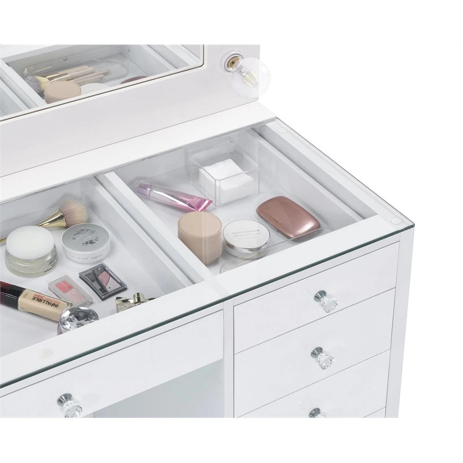 Maklaine 7-Drawer Wood & Glass Vanity Desk with LED Lighting in White