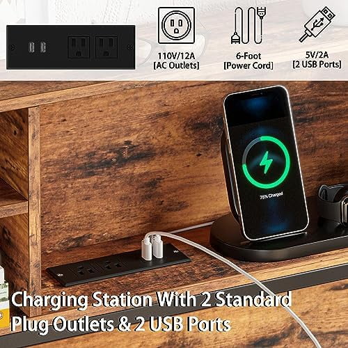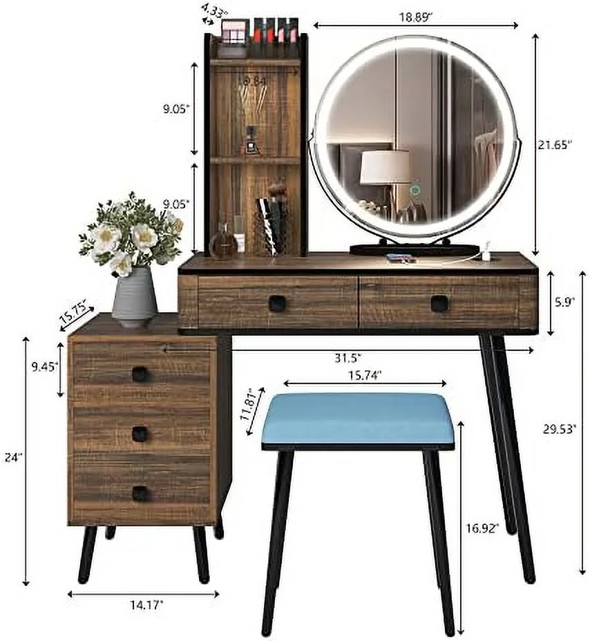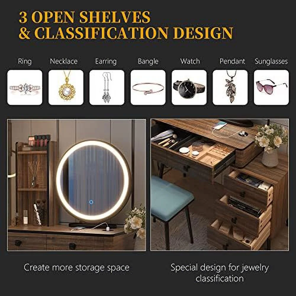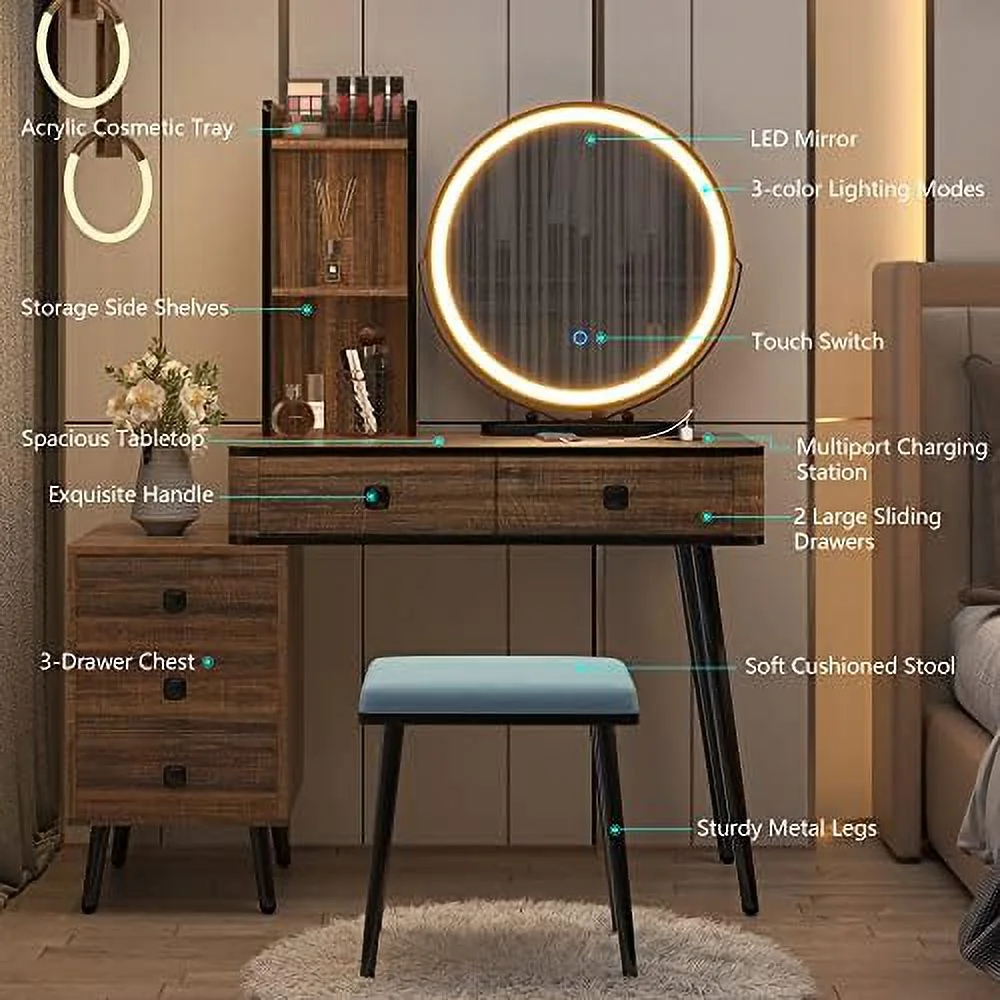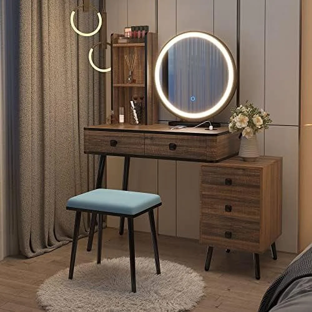 Maklaine 7-Drawer Wood & Glass Vanity Desk with LED Lighting in White
