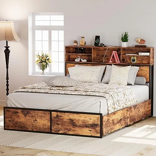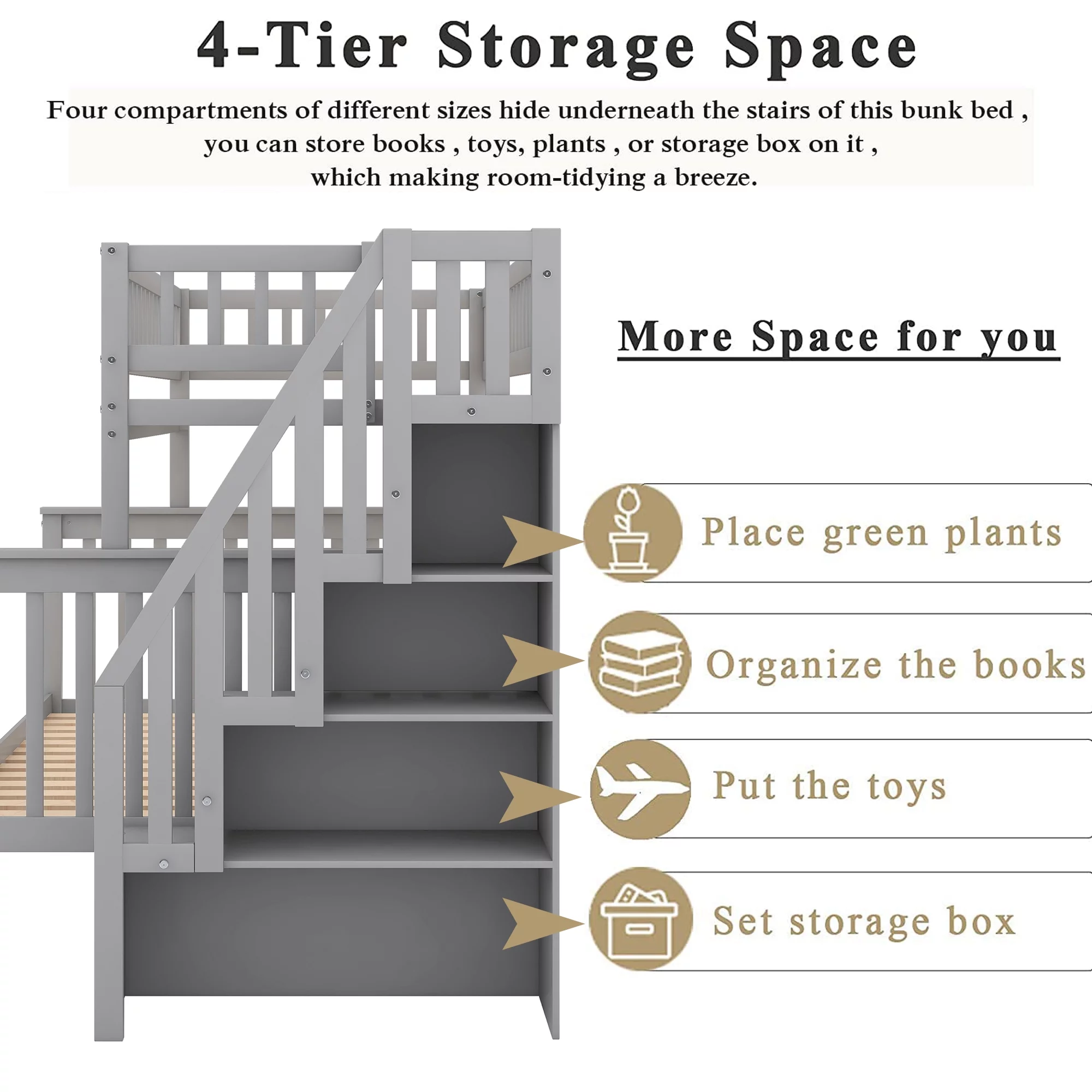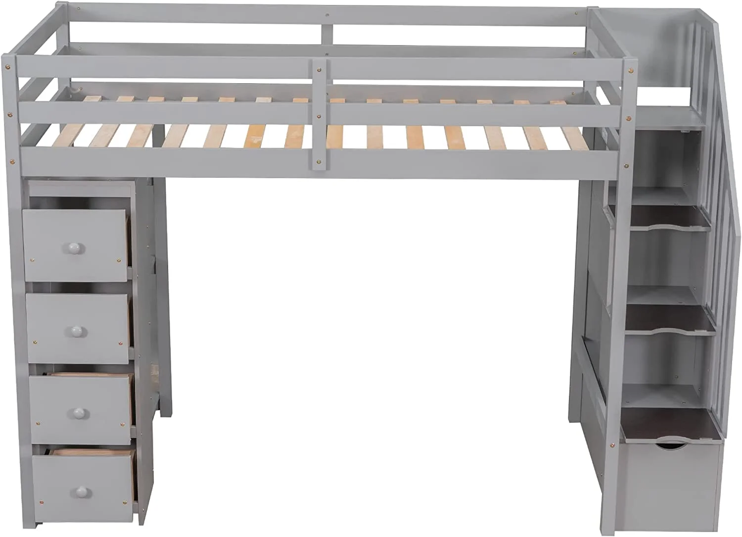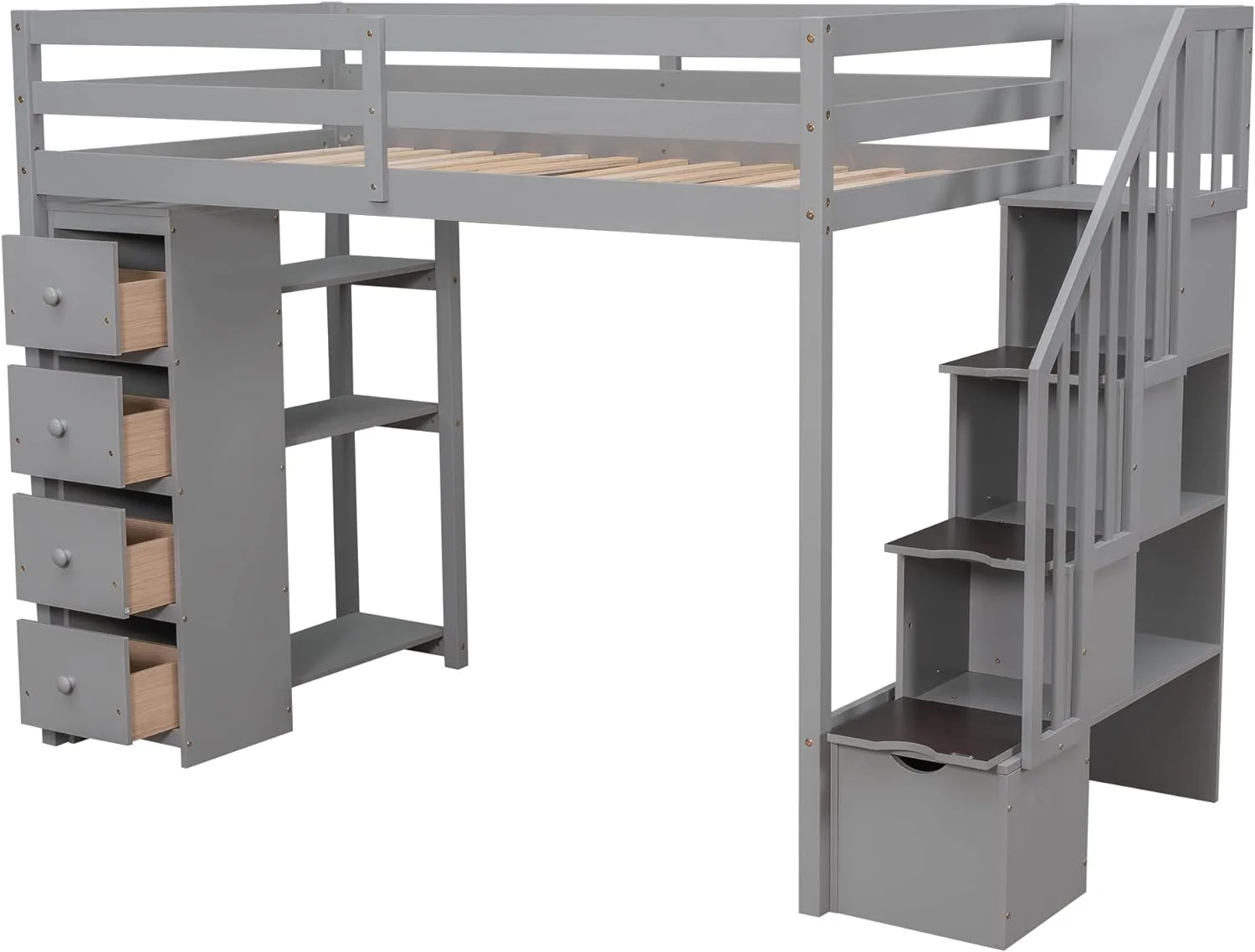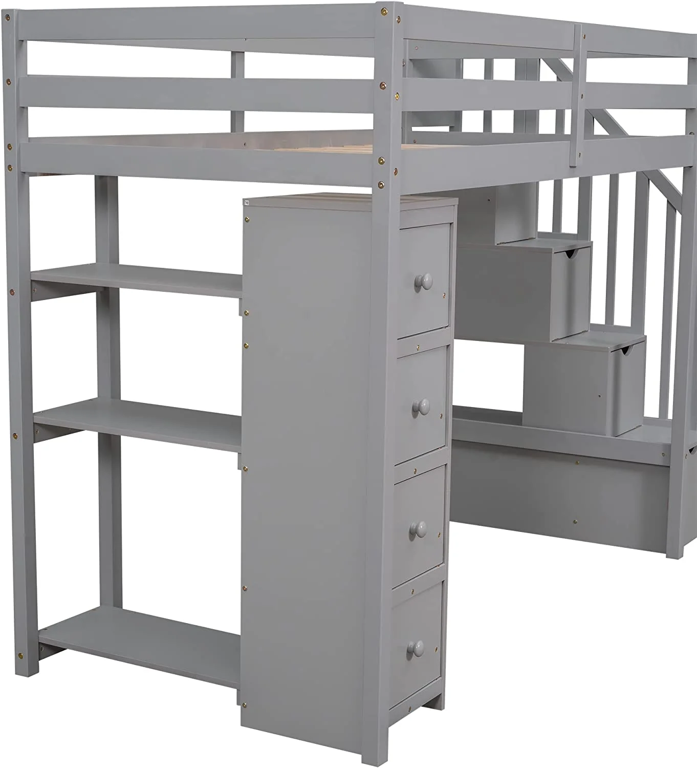 Size Loft Bed, Loft Bed Frame With Storage Drawers And Stairs, Wooden Loft Bed With Shelves, Gray