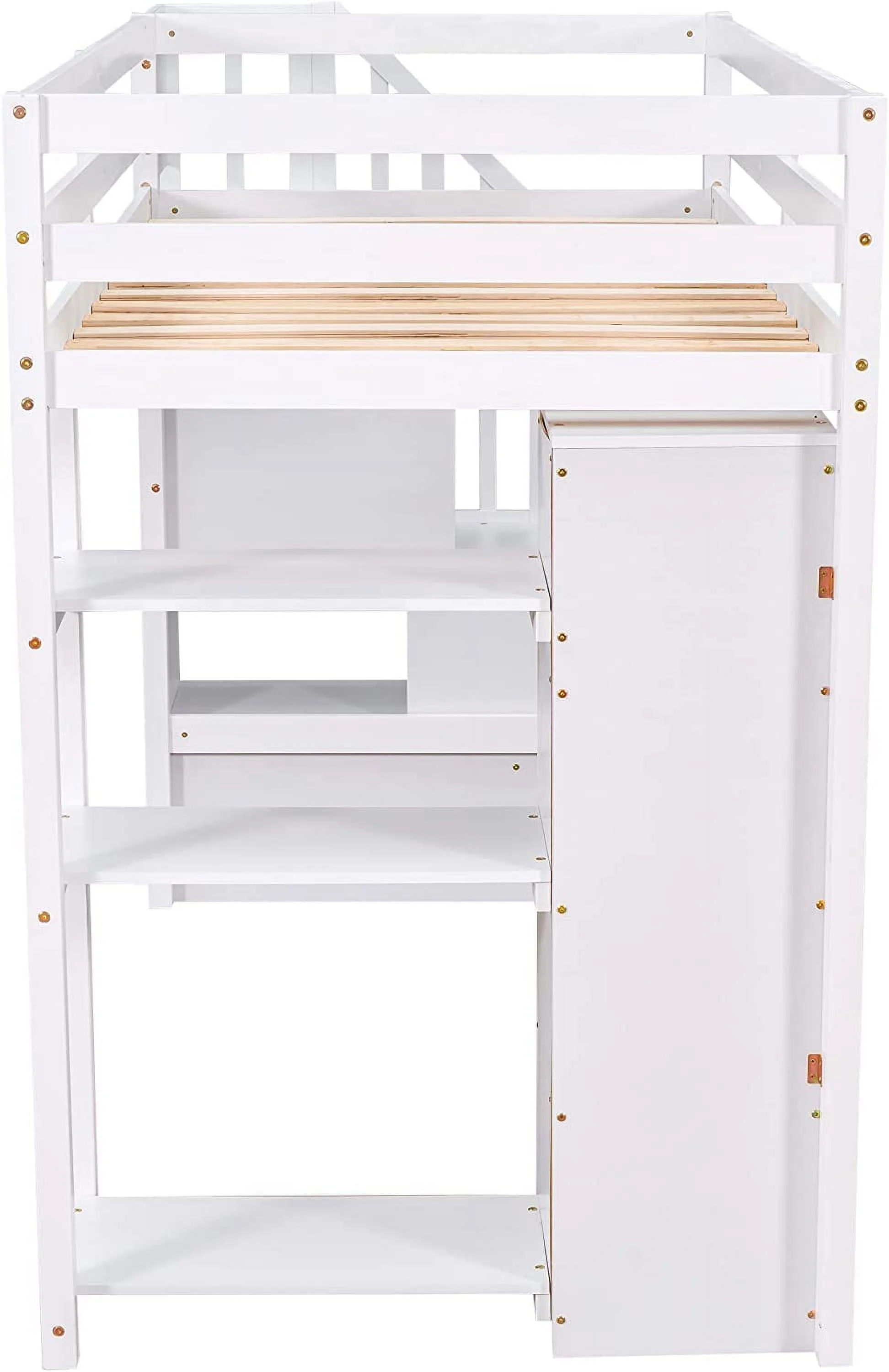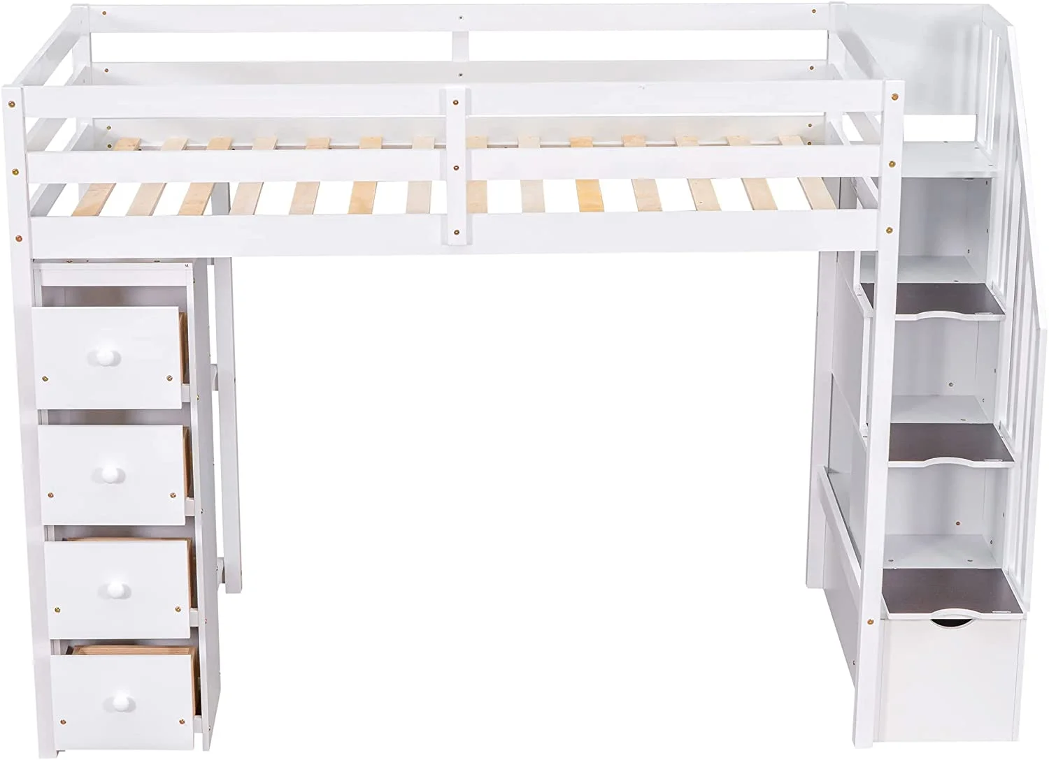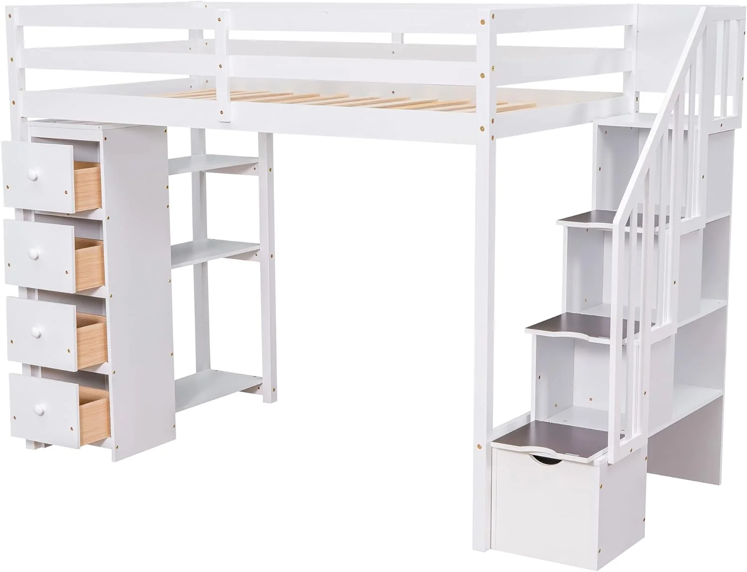 Size Loft Bed With Desk, Loft Bed Frame With Storage Drawers And Stairs, Wooden Loft Bed With Shelves, White