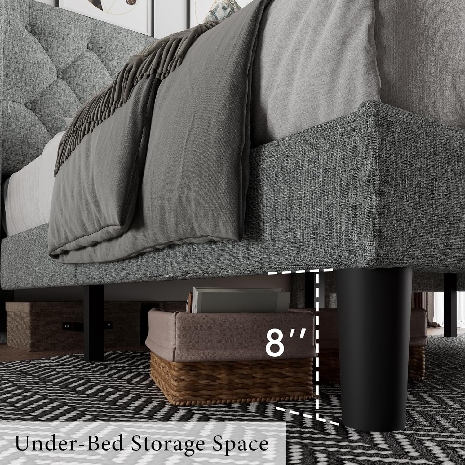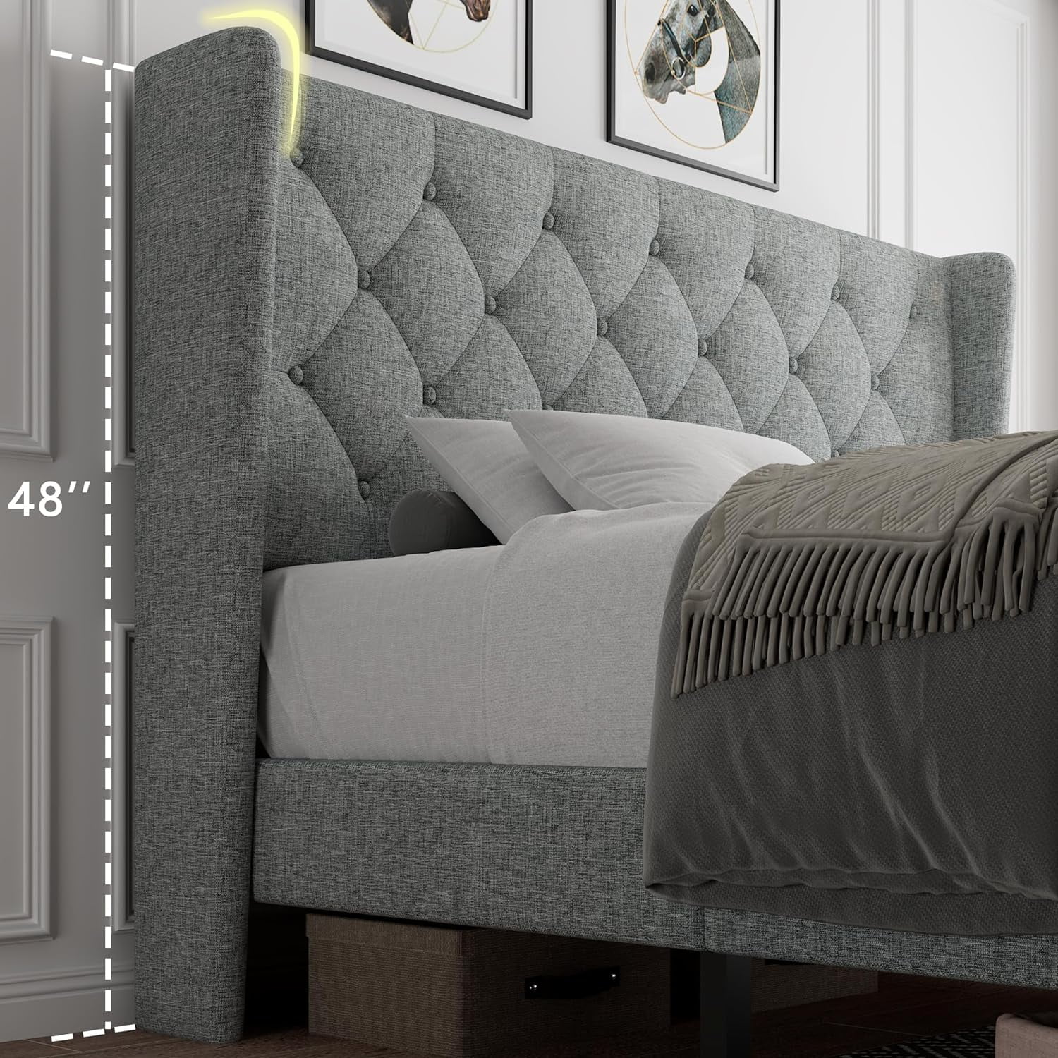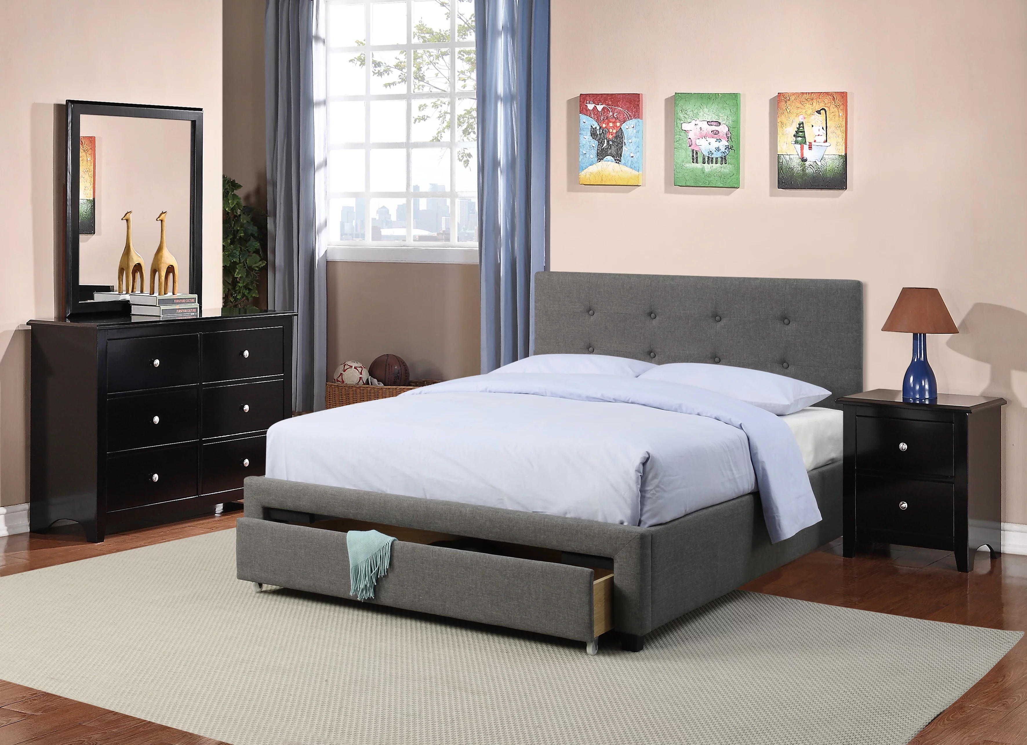 Transitional Style Grey Polyfiber 1pc Queen Size Bed Tufted Headboard Under Bed Storage Drawers Footboard Plywood Bedframe