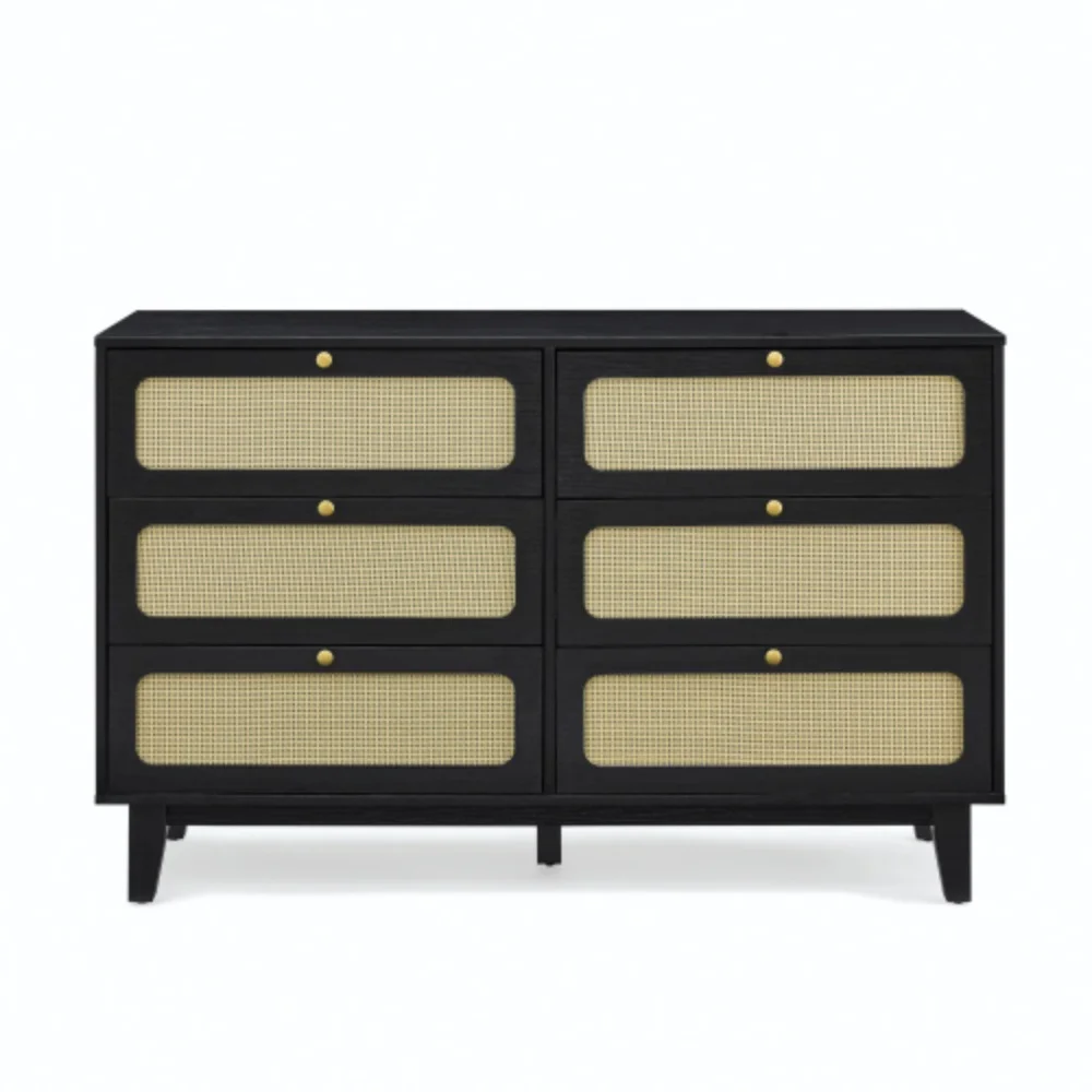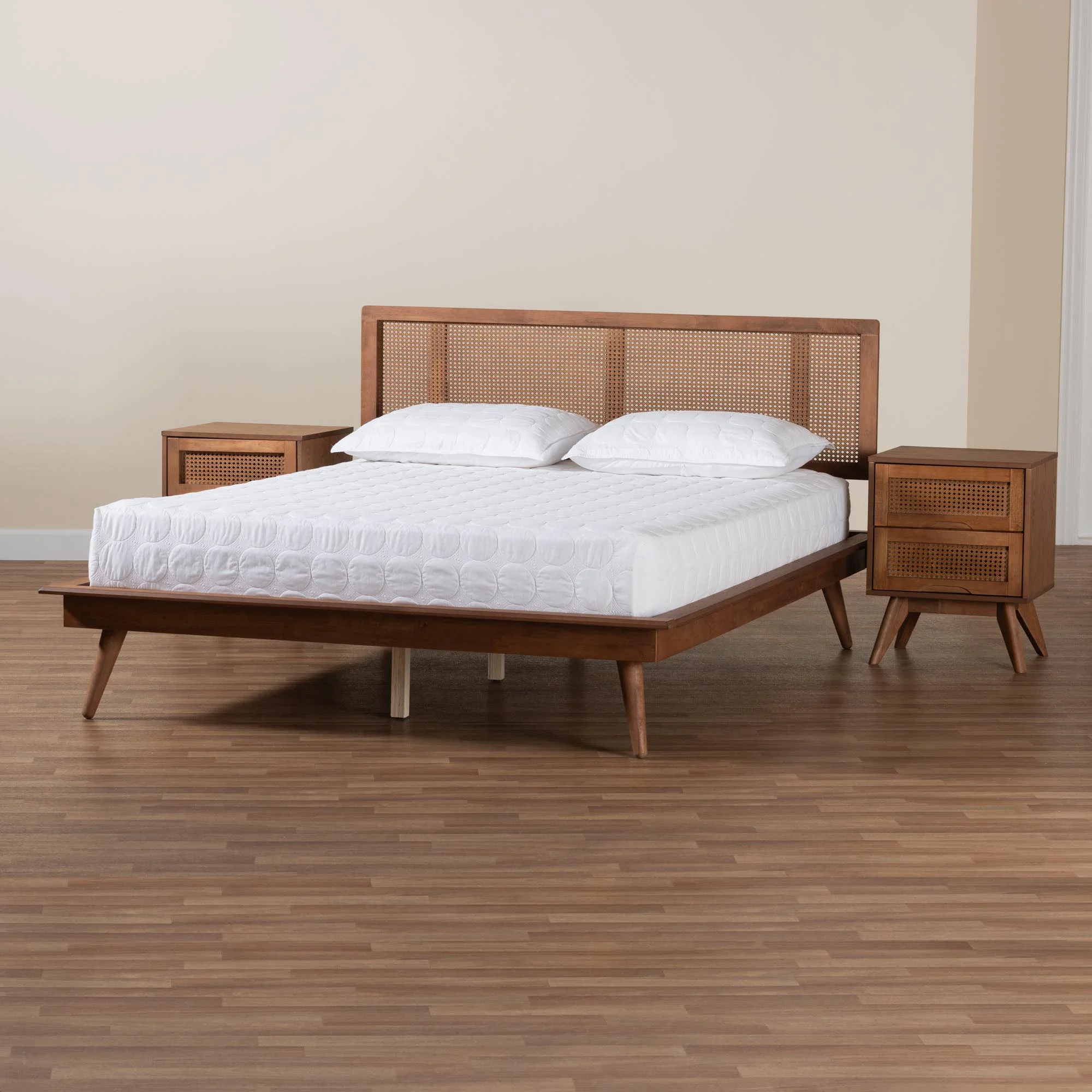 Baxton Studio Nura Mid-Century Modern Walnut Brown Finished Wood and Rattan Full Size 3-Piece Bedroom Set