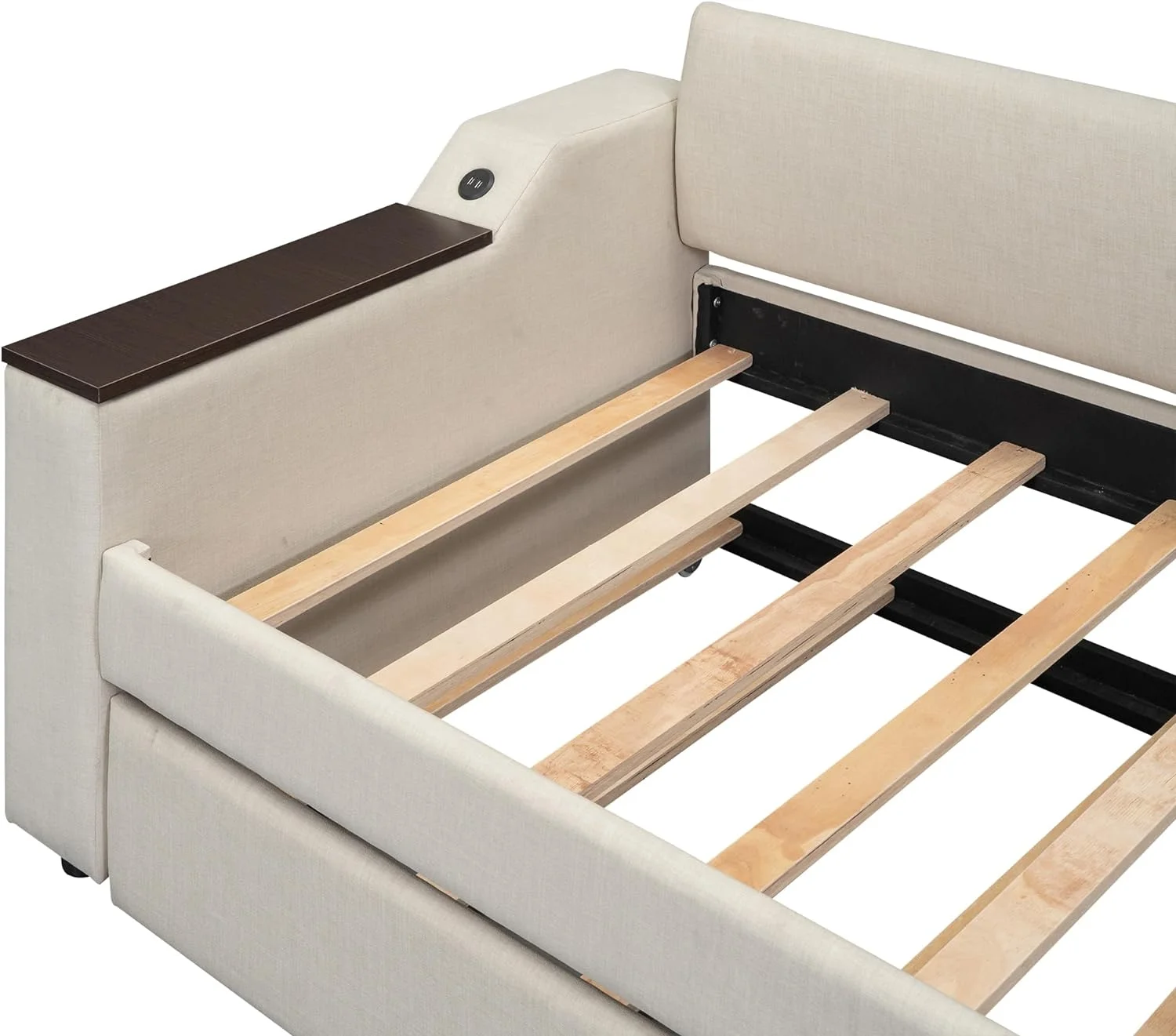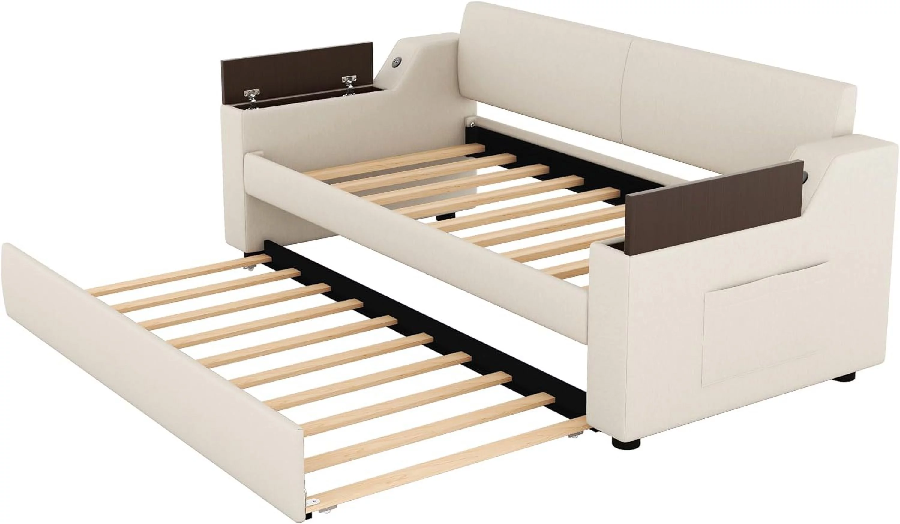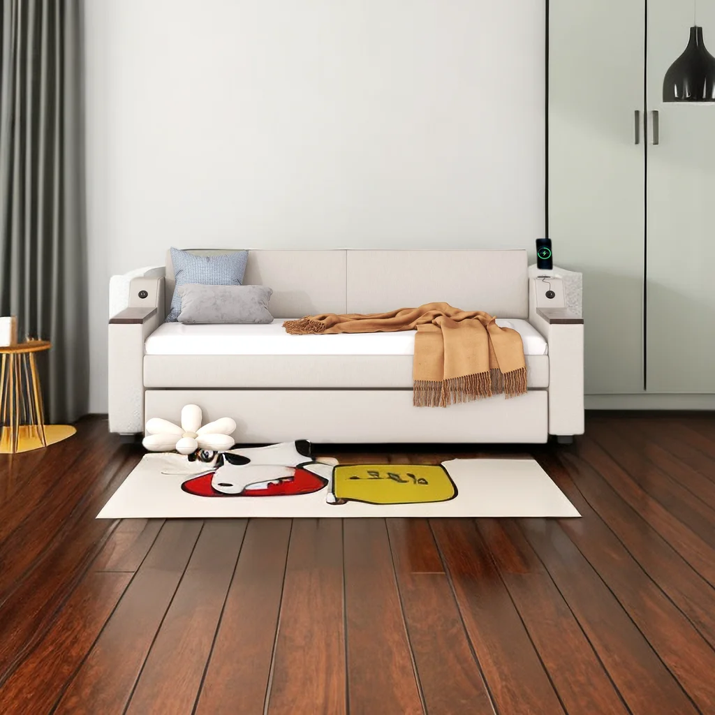 Twin Size Upholstery Daybed with Sturdy Construction Storage Arms, Trundle and USB Design