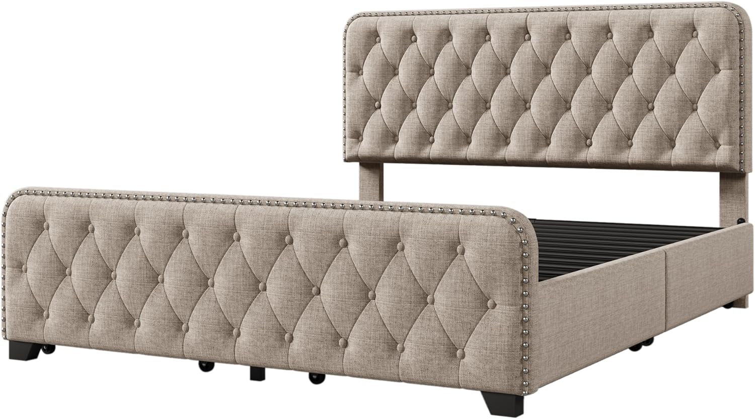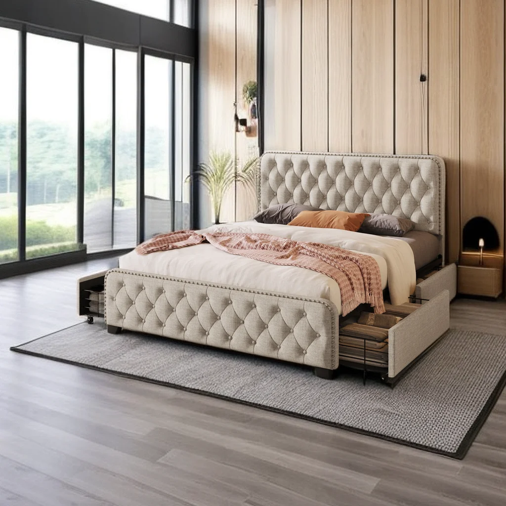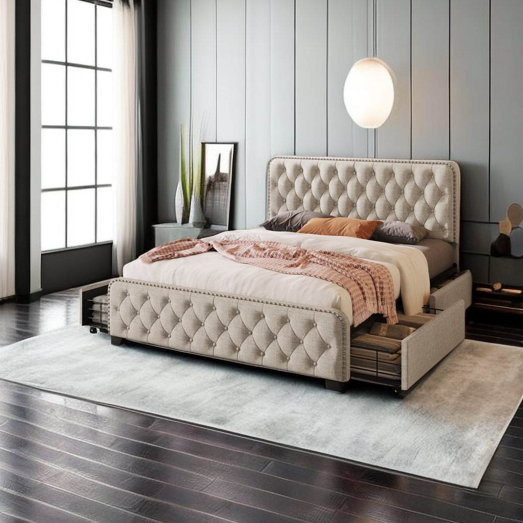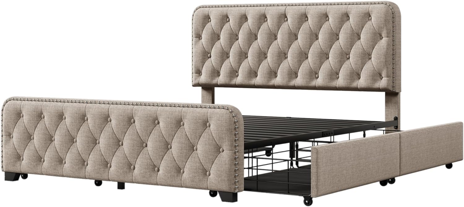 Platform Bed Frame with Four Drawers, Button Tufted Headboard and Footboard Sturdy Wood Slat Support, KING