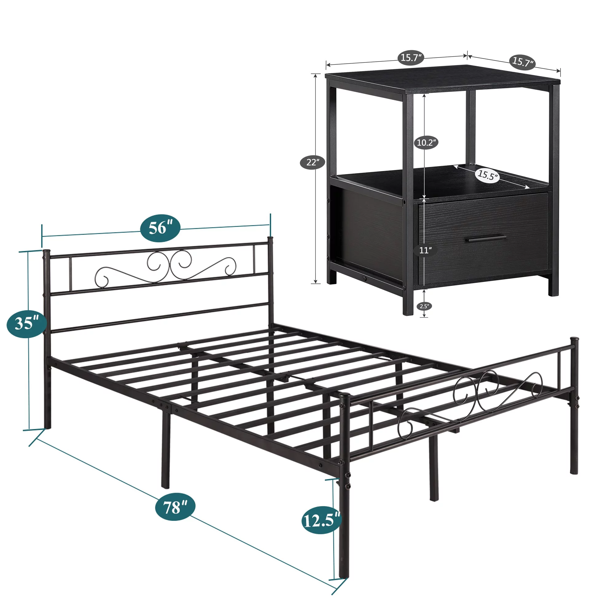 VECELO 3-Piece Bedroom Set with Full Bed Frame and 2 Black Nightstands