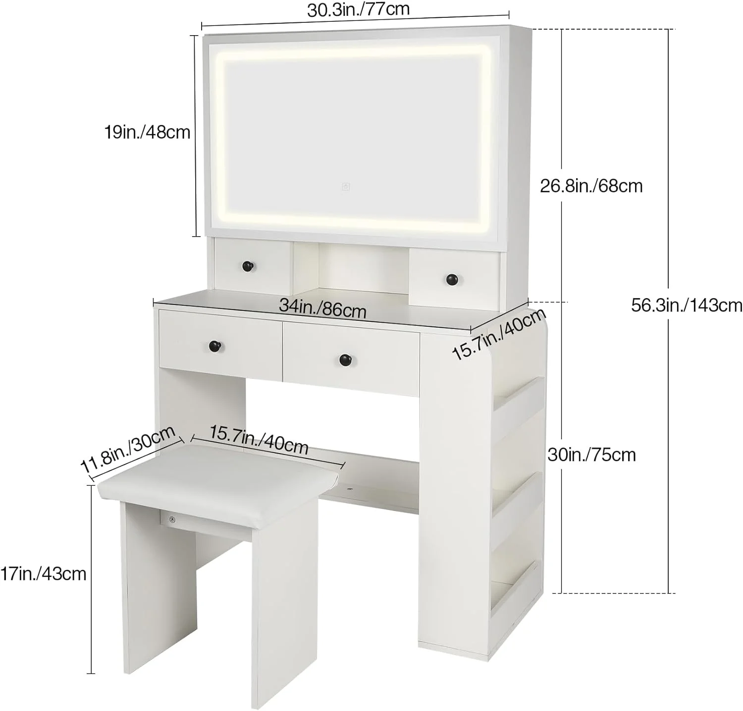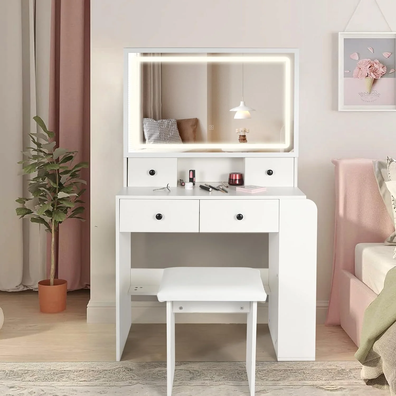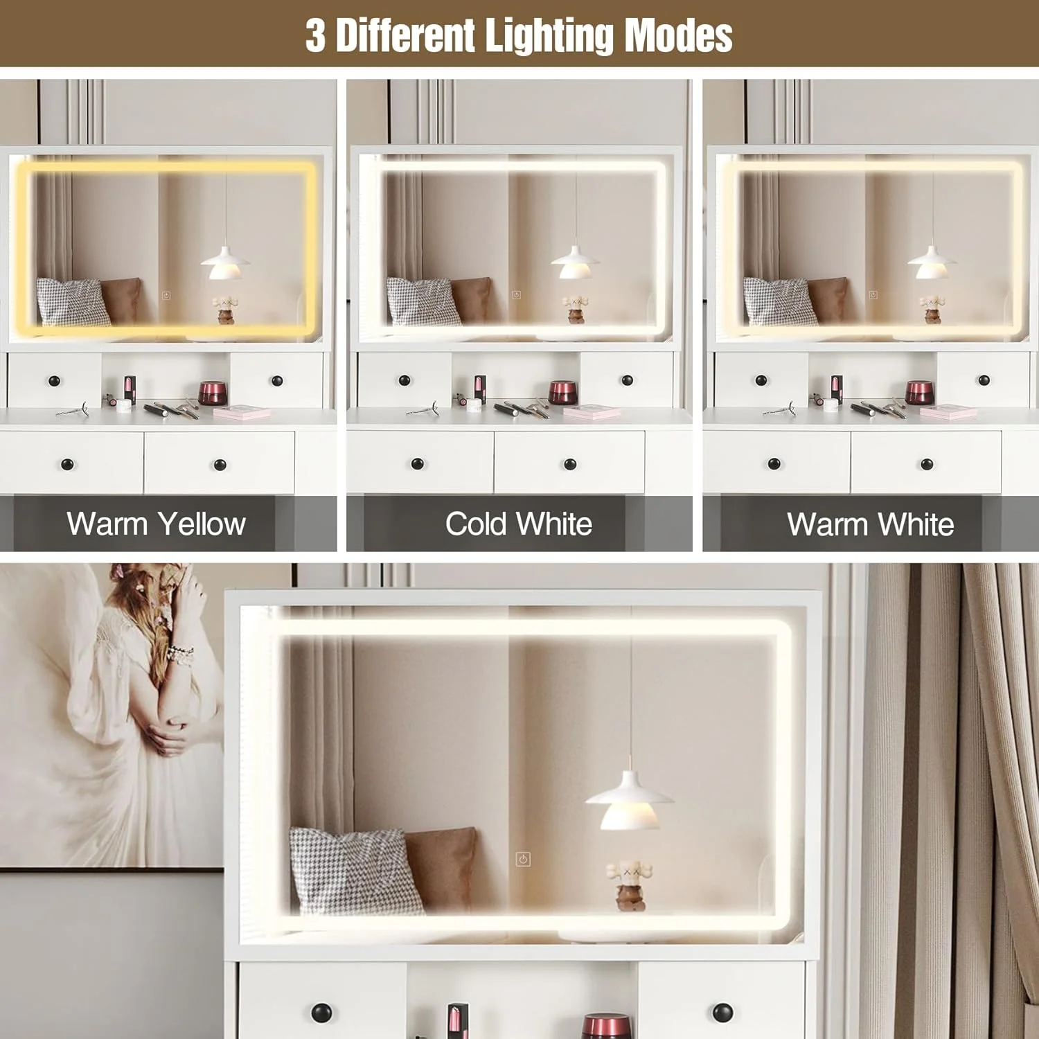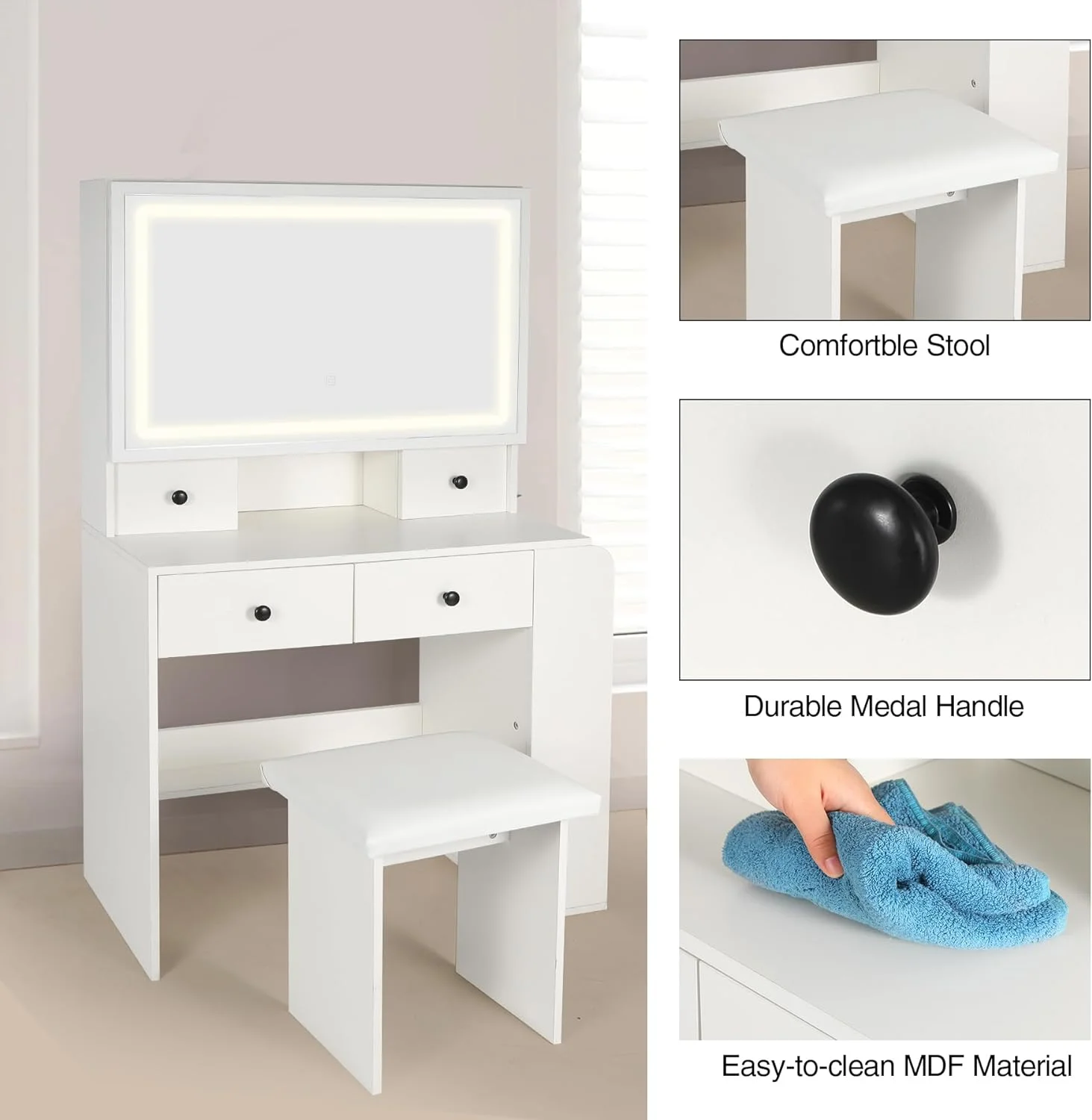 Algherohein Modern Vanity Makeup Table Set with 5 Drawer Lighted Mirror Bedroom,White