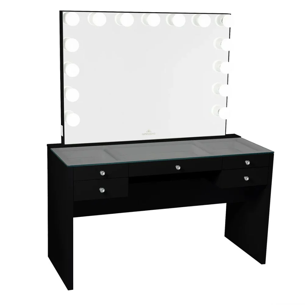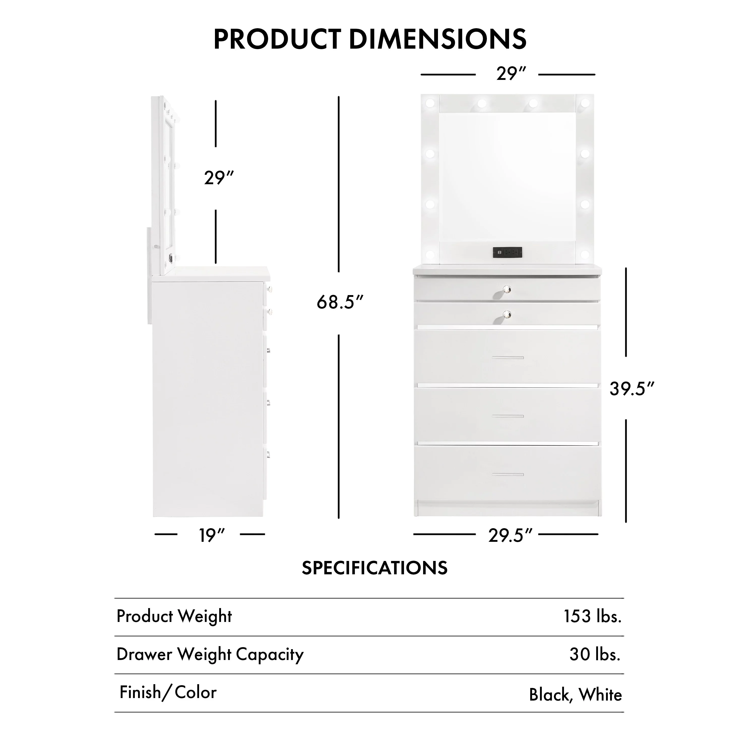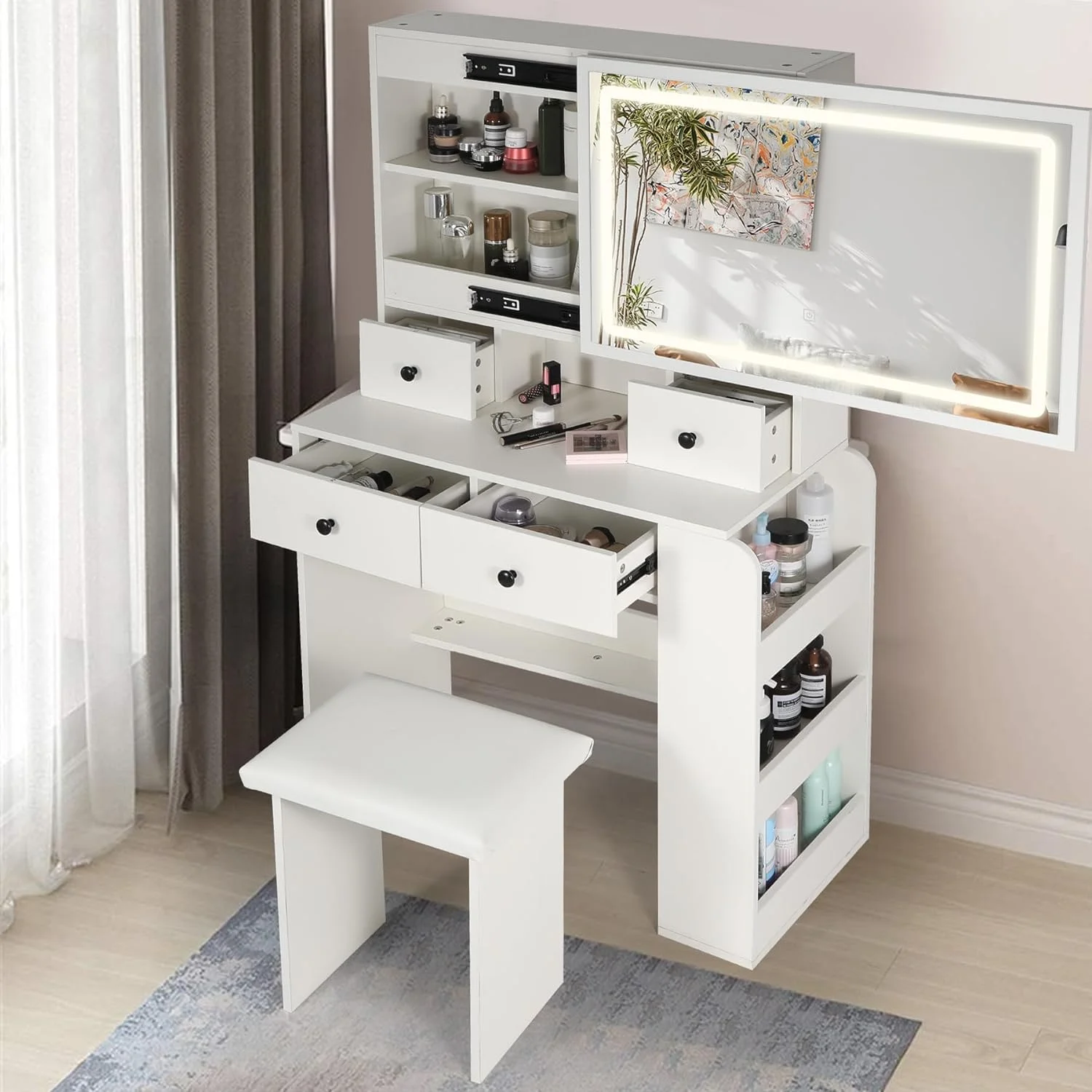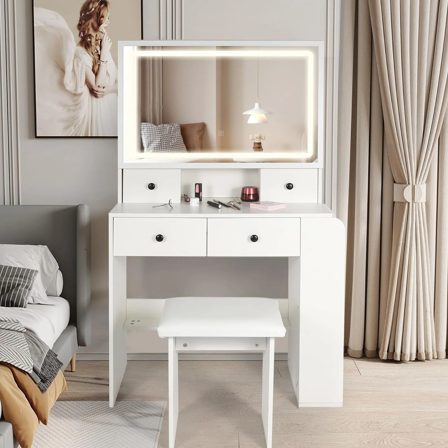 Algherohein Modern Vanity Makeup Table Set with 5 Drawer Lighted Mirror Bedroom,White