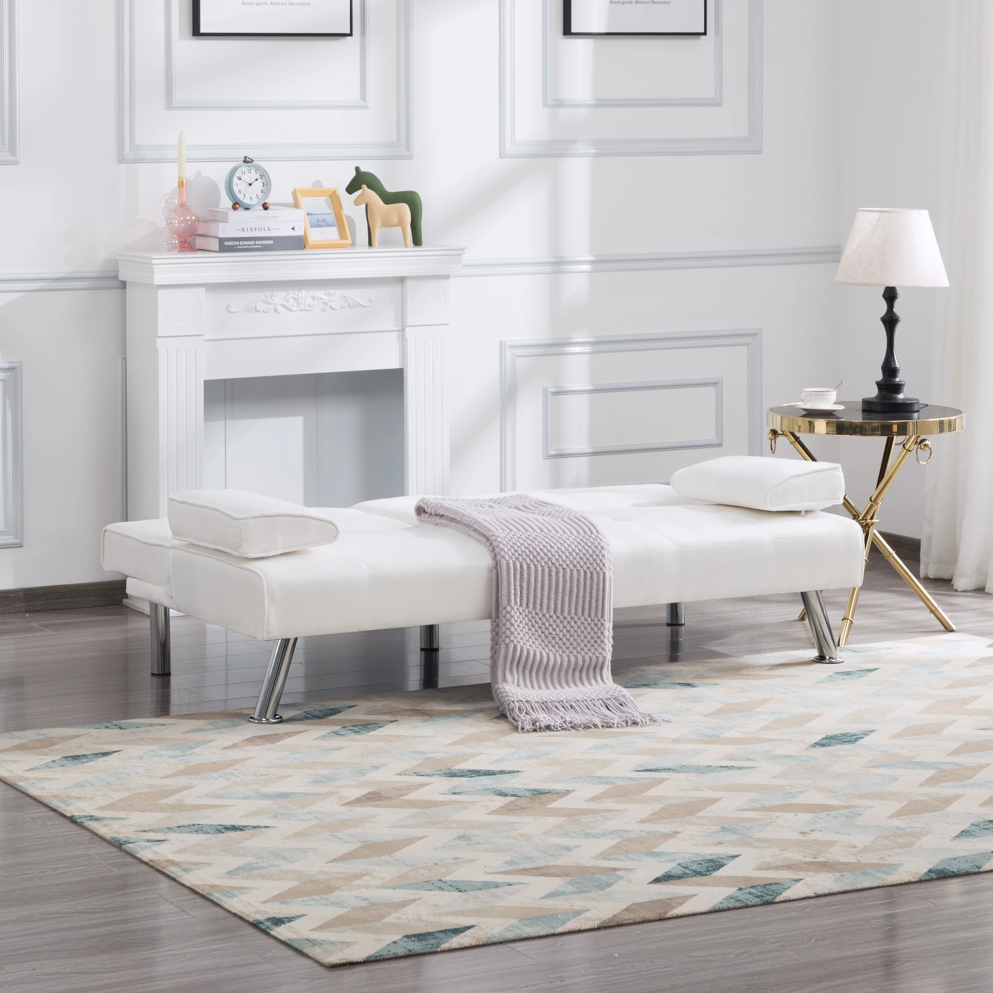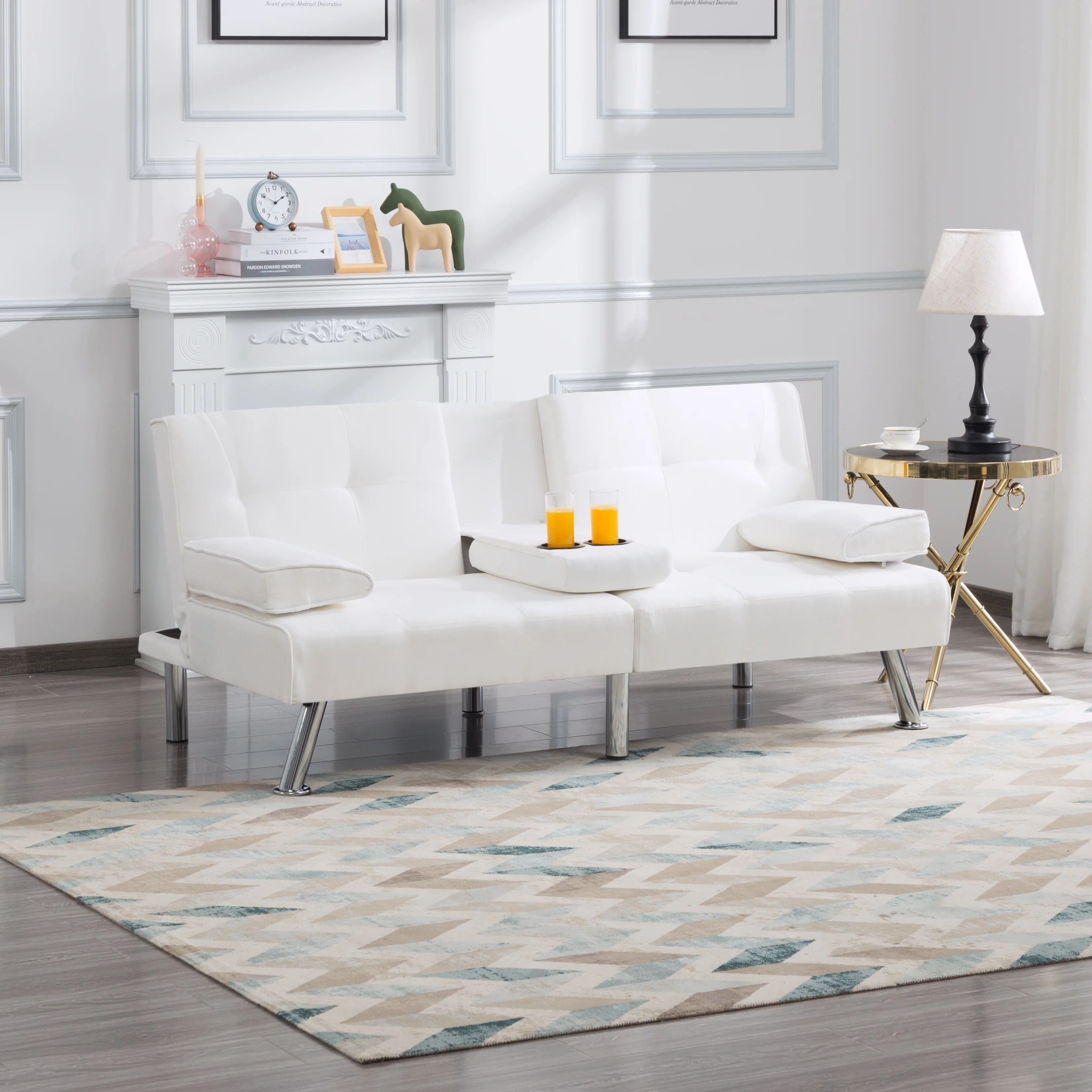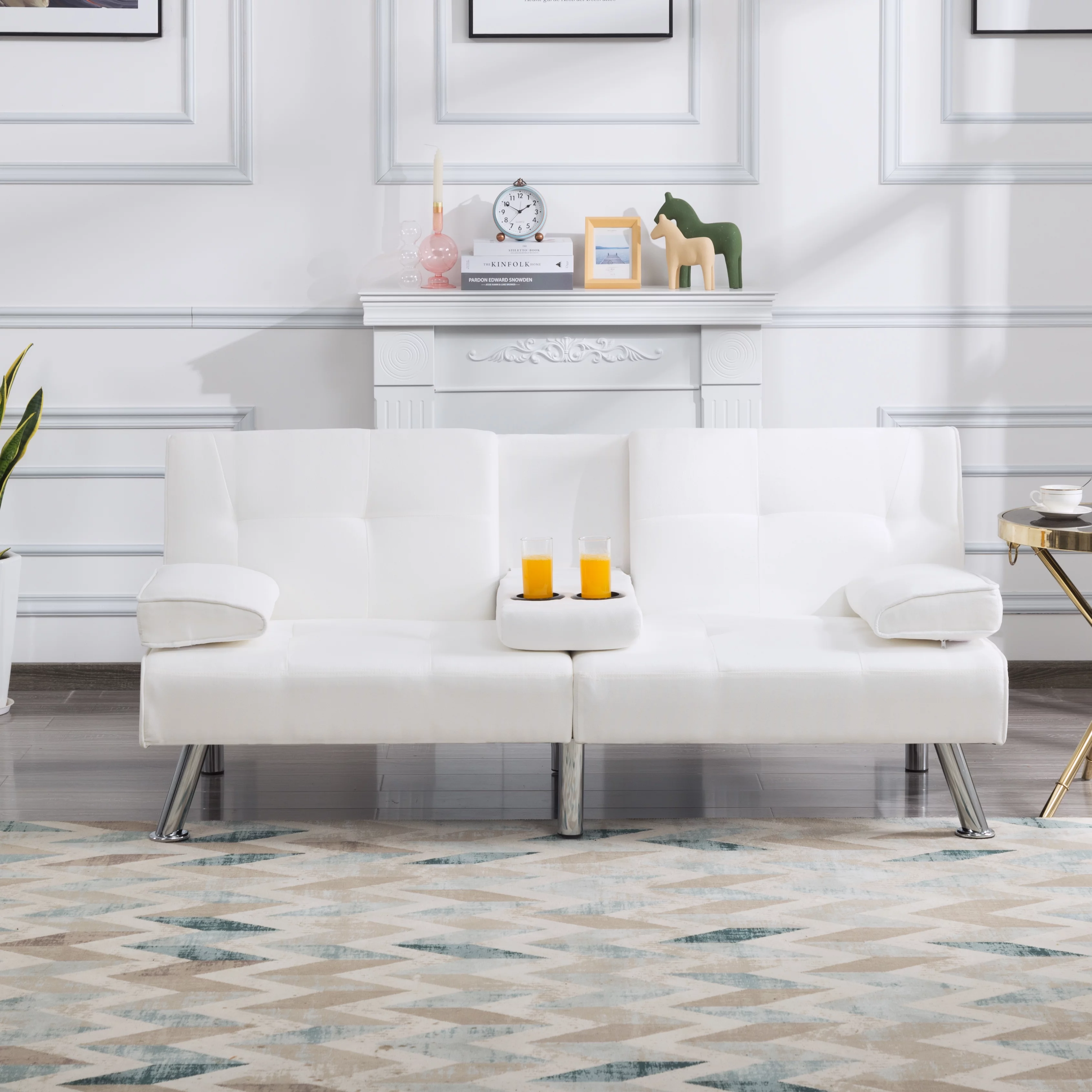 BSHTI 66.9 inch Futon Velvet Sleeper Sofa Bed and Drop Down Middle Back with 2 Cup Holders(Beige)