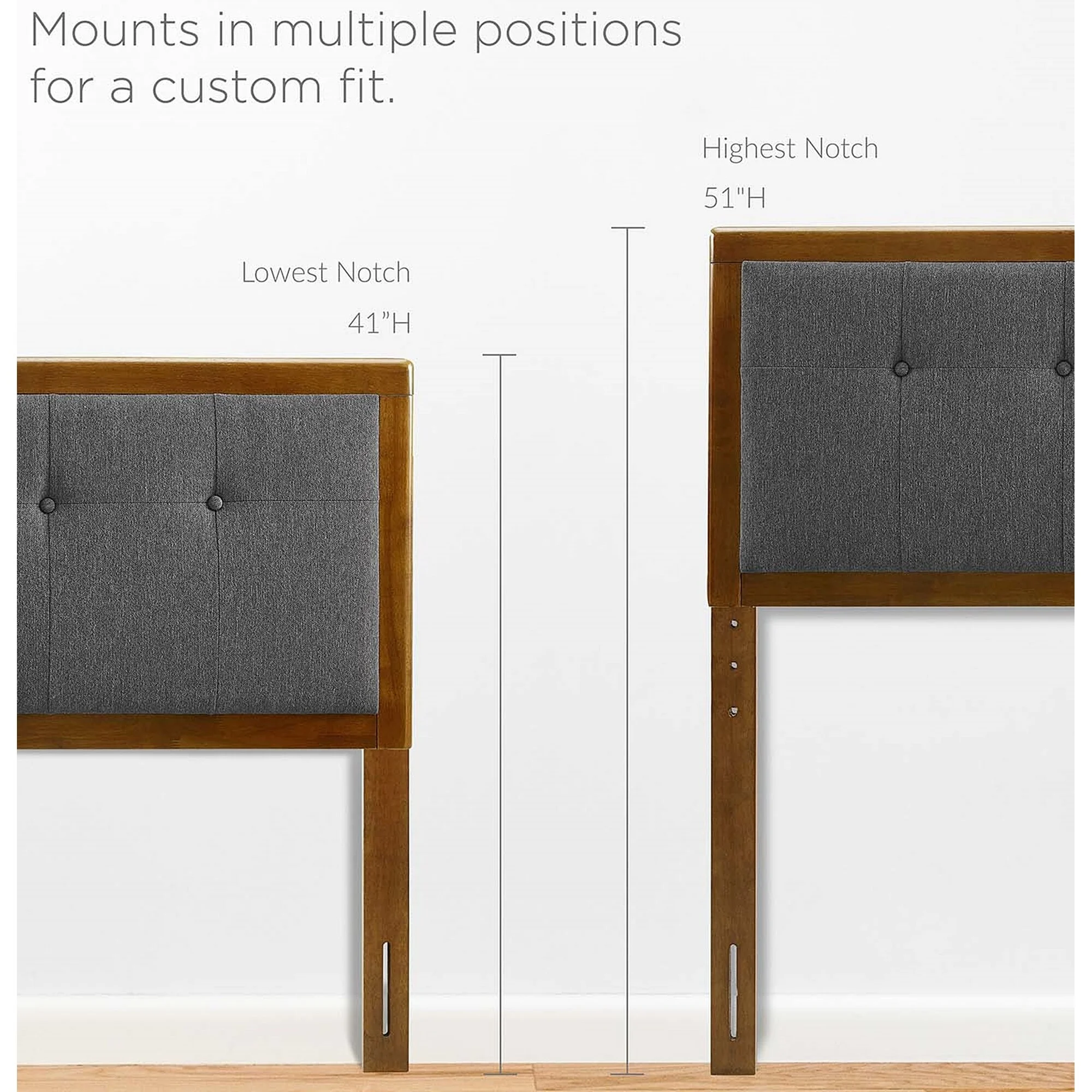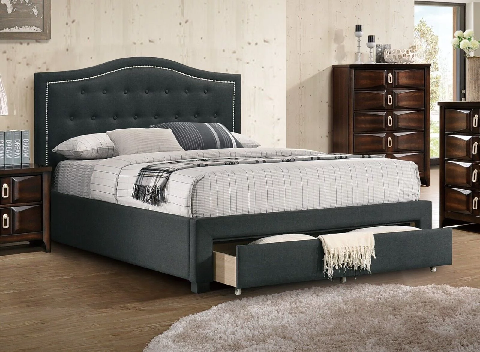 BSD National Supplies Marlin Traditional Charcoal Fabric Button Tufted Queen Size Walnut Wooden Headboard