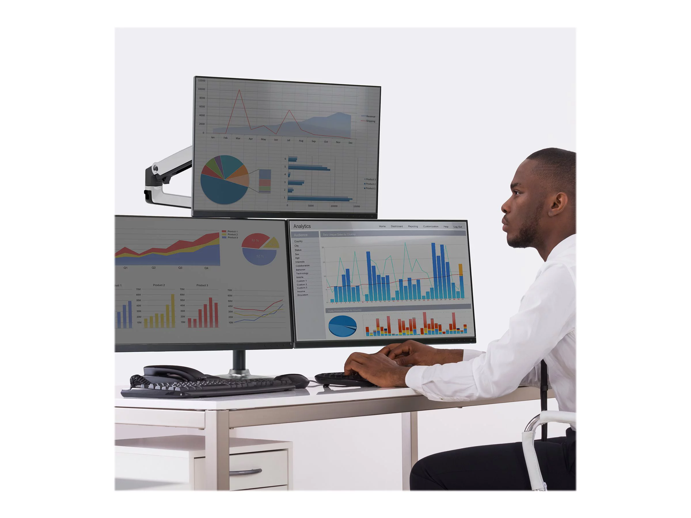 Mount-lt! Triple Computer Monitor Desk Mount, Fits Up To 32" Screens, USB, USB-C & Audio Ports, Ergonomic