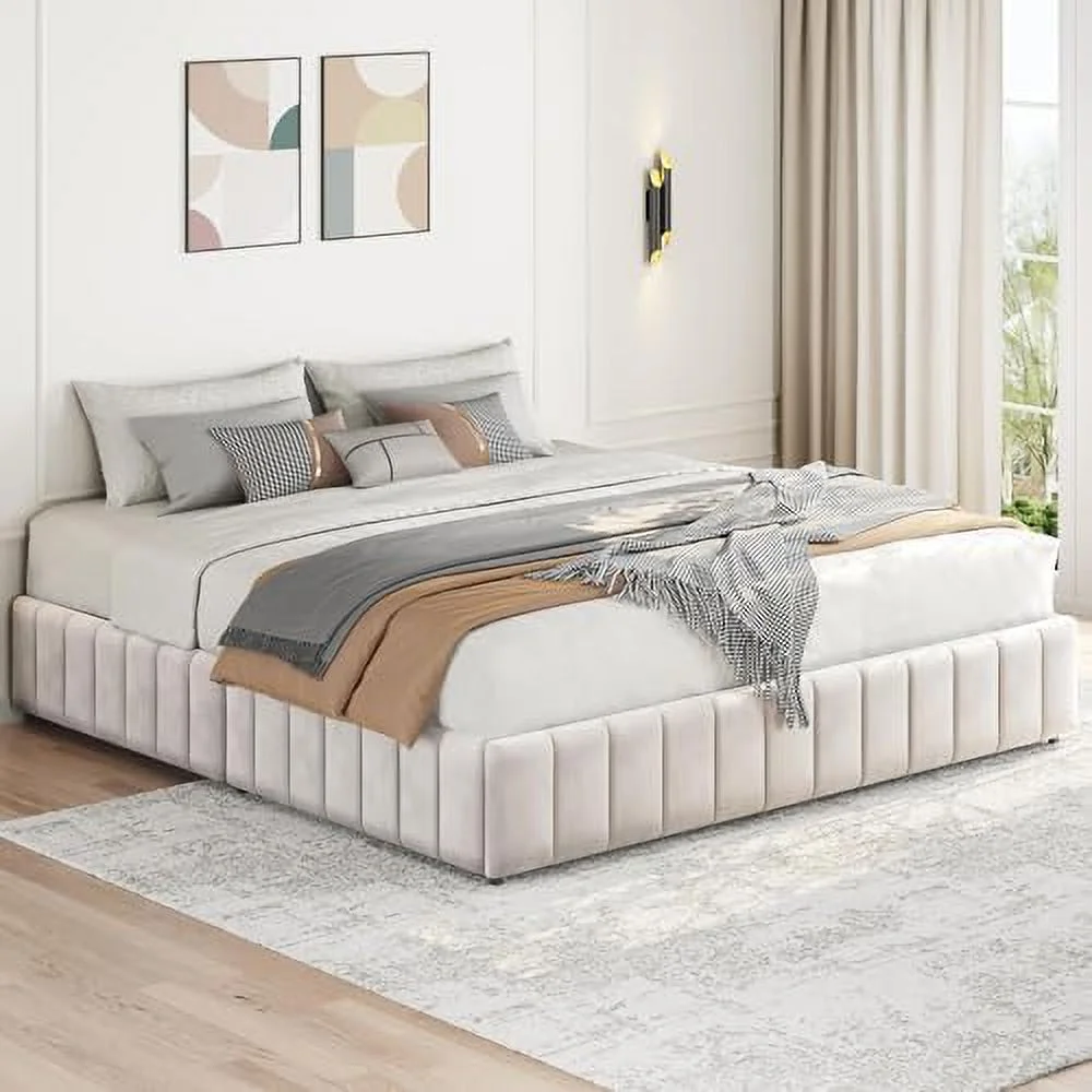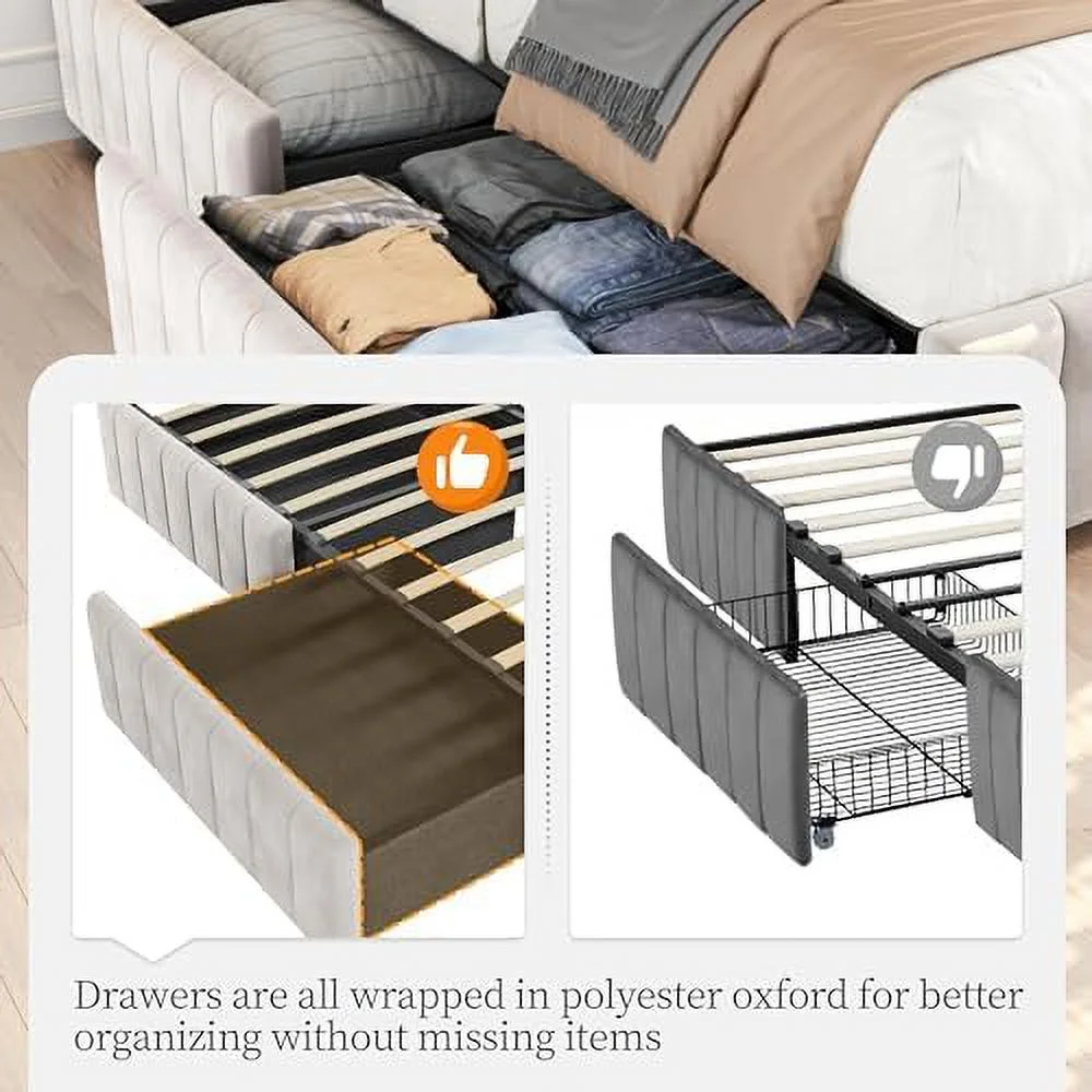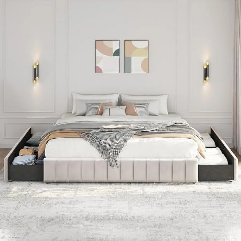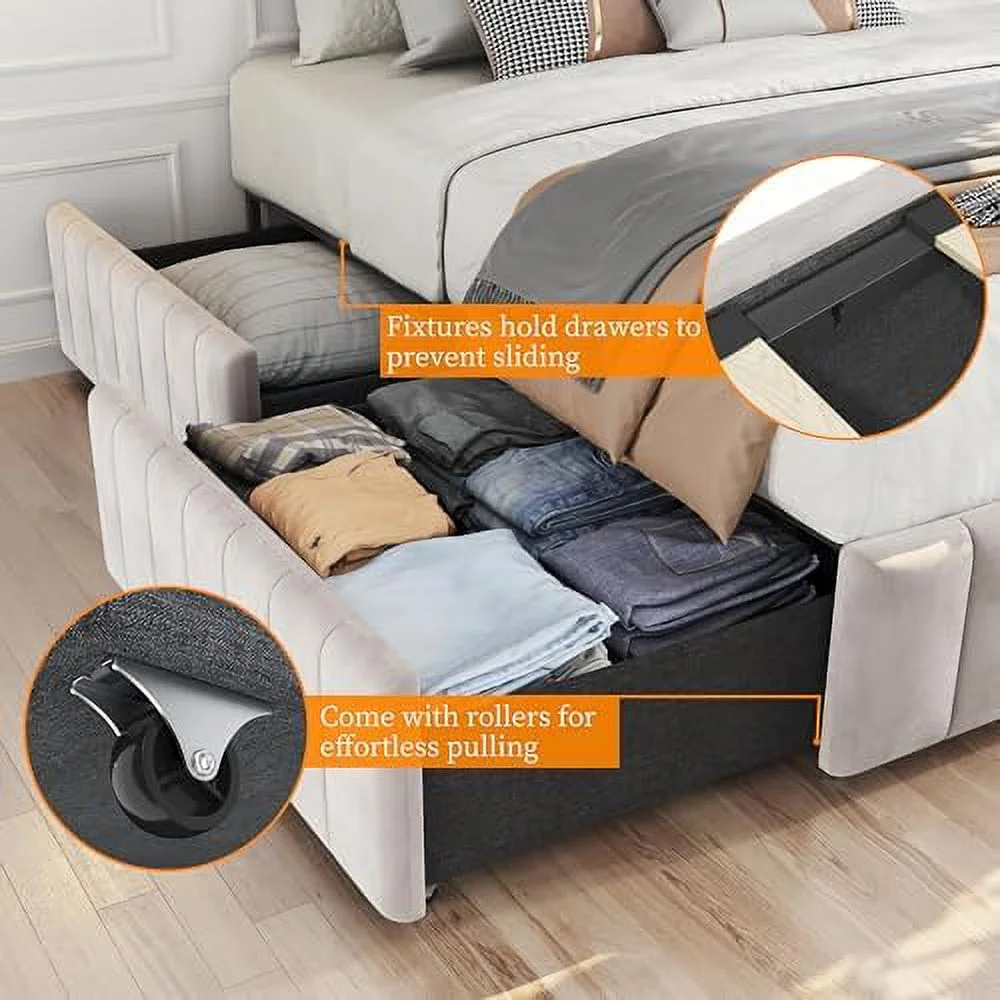 Platform Bed Frame with 4 Large Storage Drawers, King Size Bed Frame with Adjustable Tufted Headboard Beige - Queen
