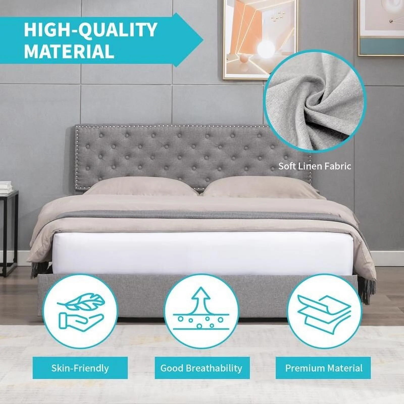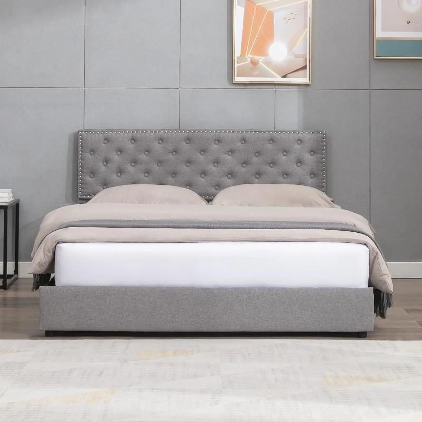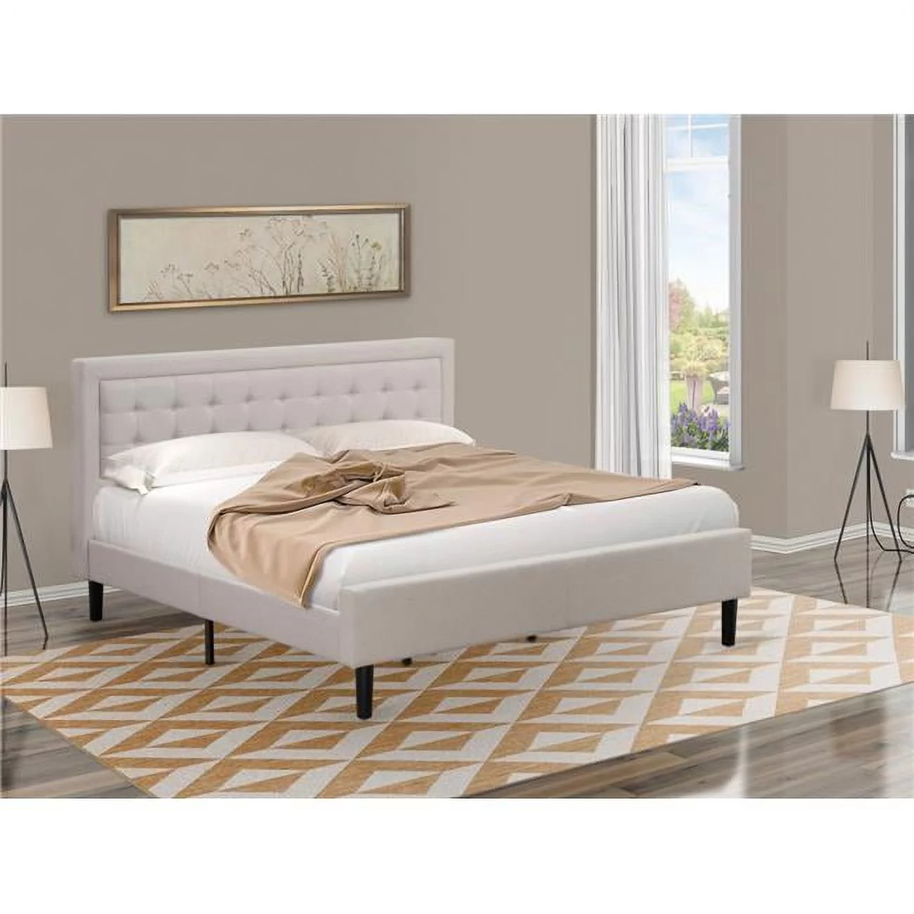 Fannin Platform King Size Bed - Mist Beige Linen Fabric Upholestered Bed Headboard with Button Tufted Trim Design - Black Legs