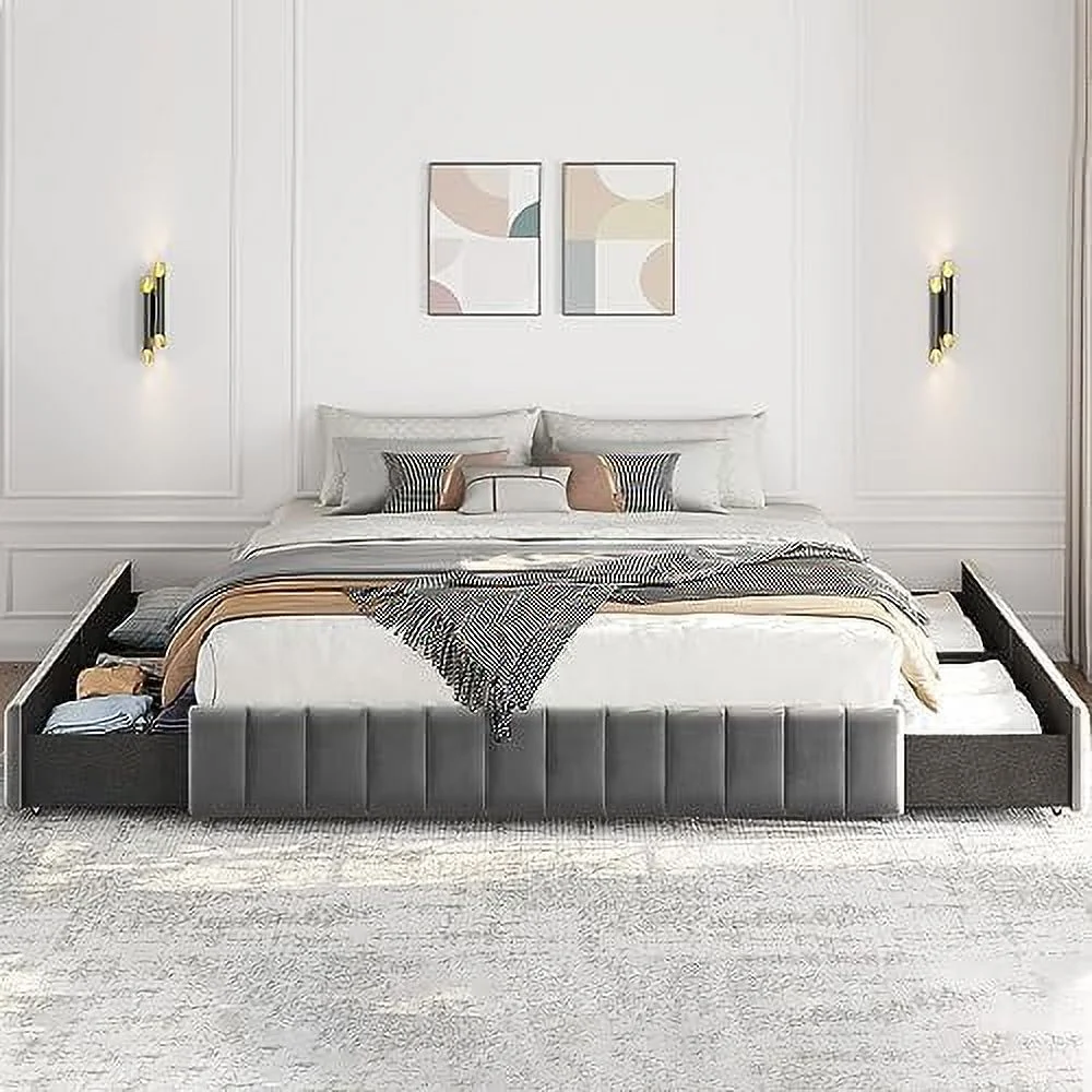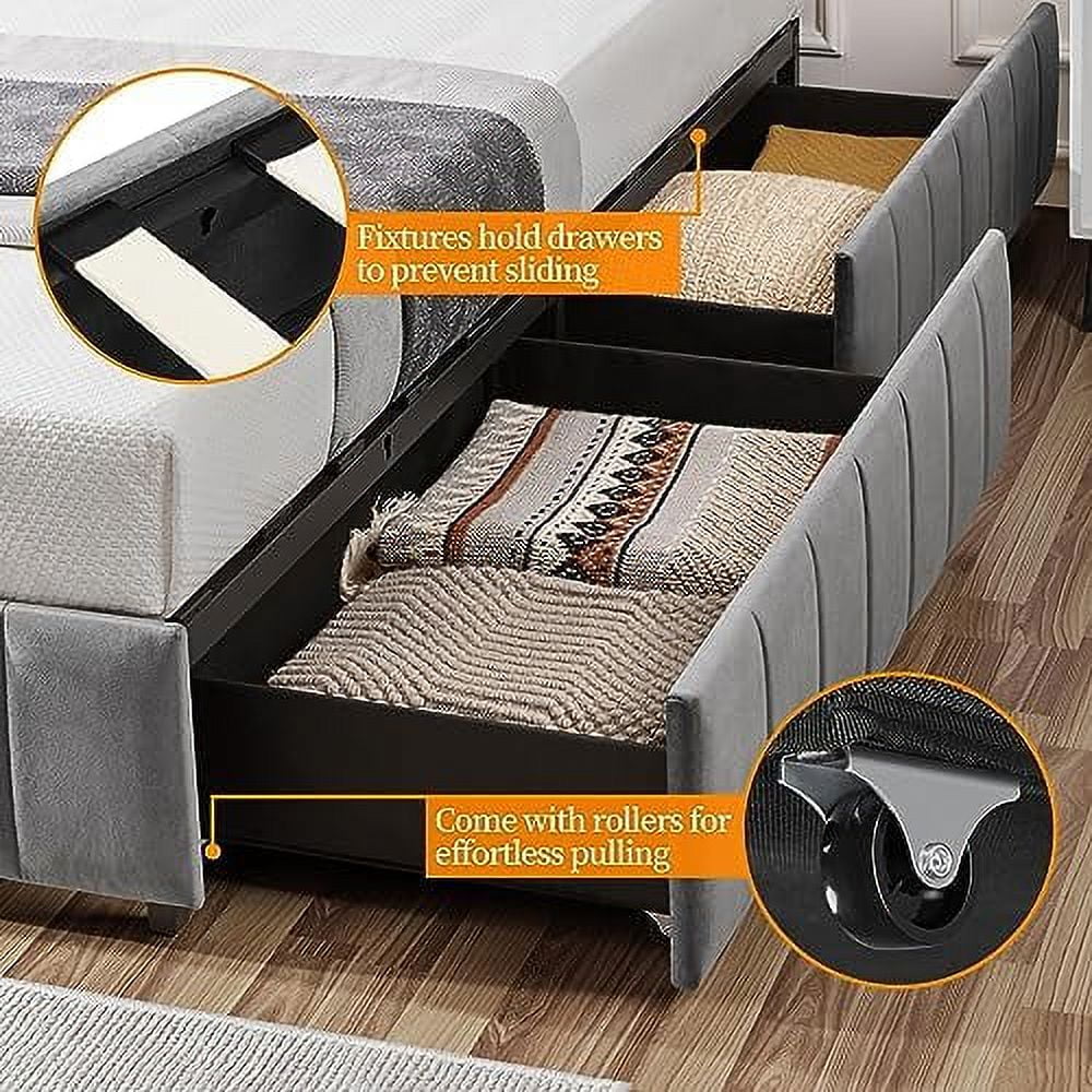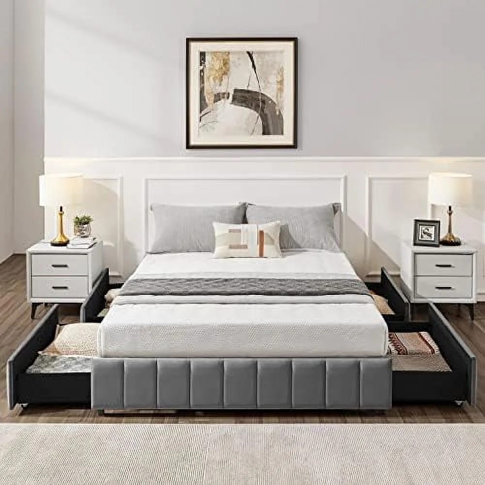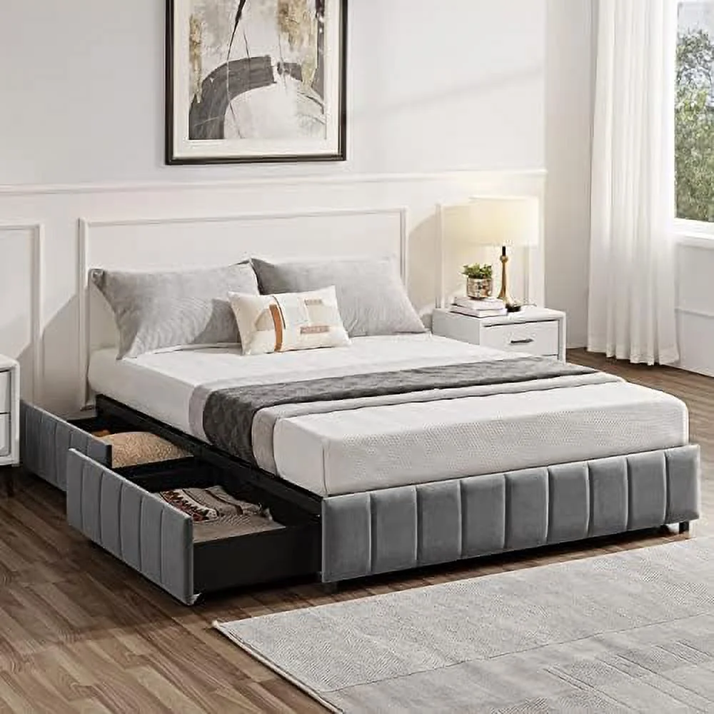 Platform Bed Frame with 4 Large Storage Drawers, King Size Bed Frame with Adjustable Tufted Headboard Light Grey - Full