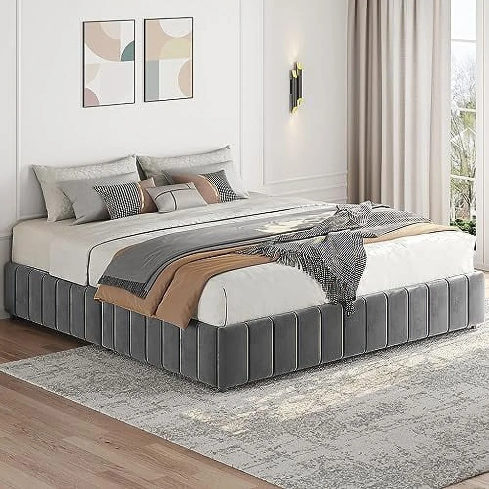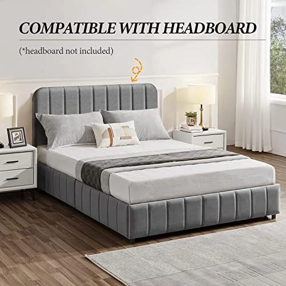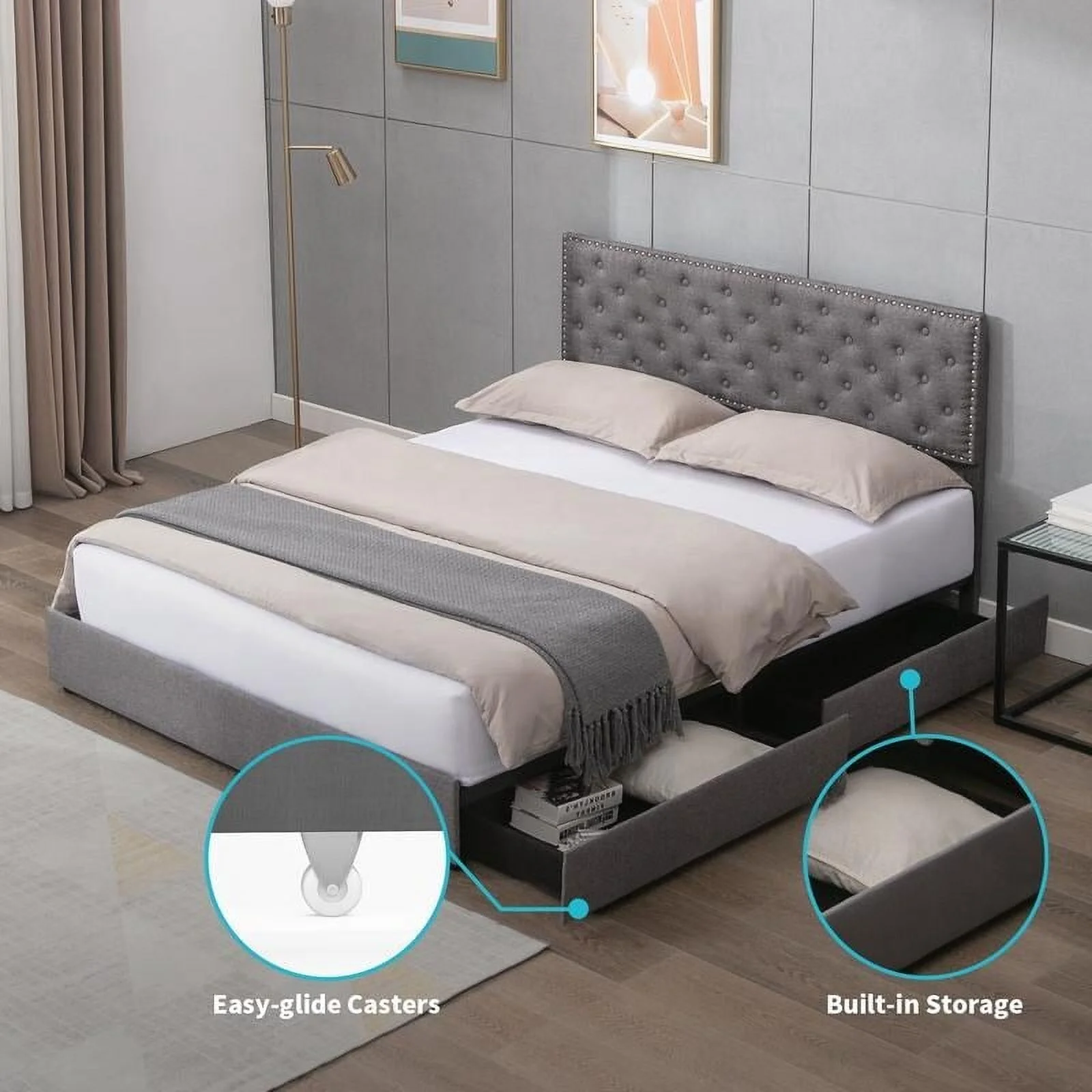 Platform Bed Frame with 4 Large Storage Drawers, King Size Bed Frame with Adjustable Tufted Headboard Light Grey - Full