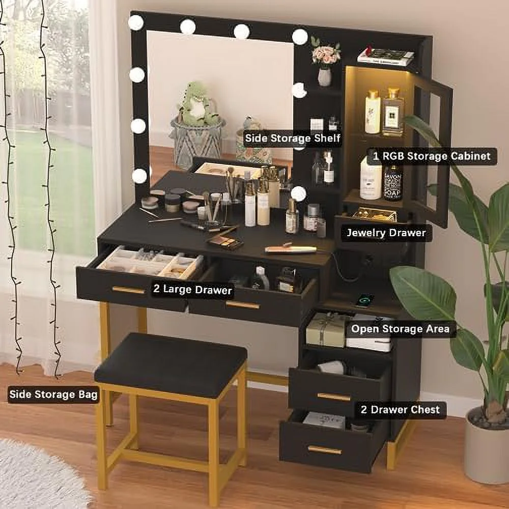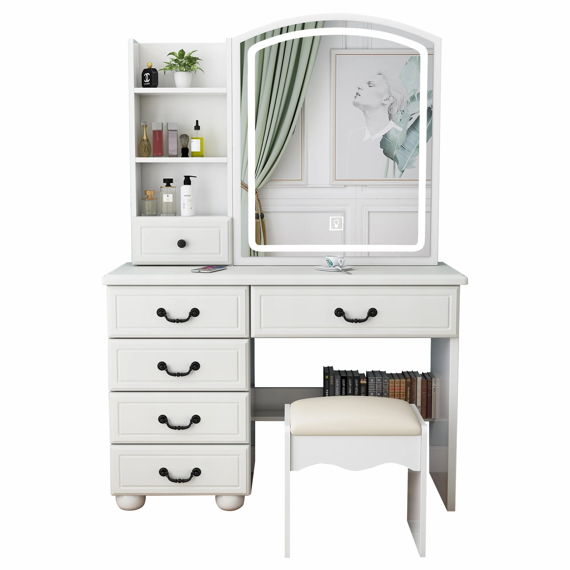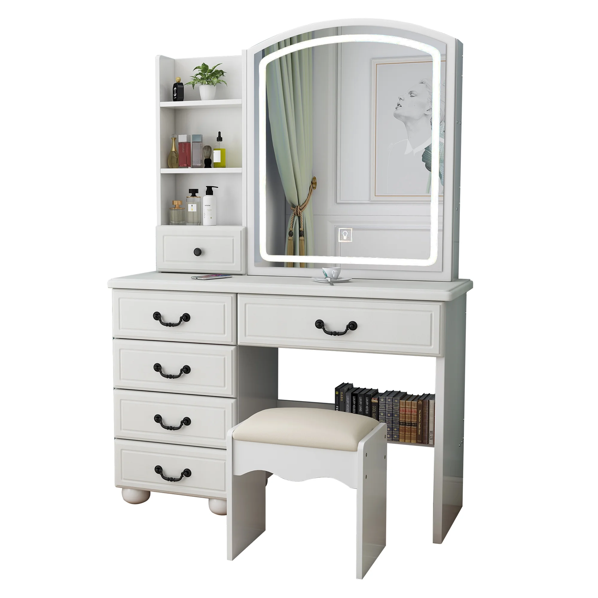 Glavbiku Modern Makeup Vanity Table Set with Sliding Mirror,LED Dressing Desk with 6 Drawer,White