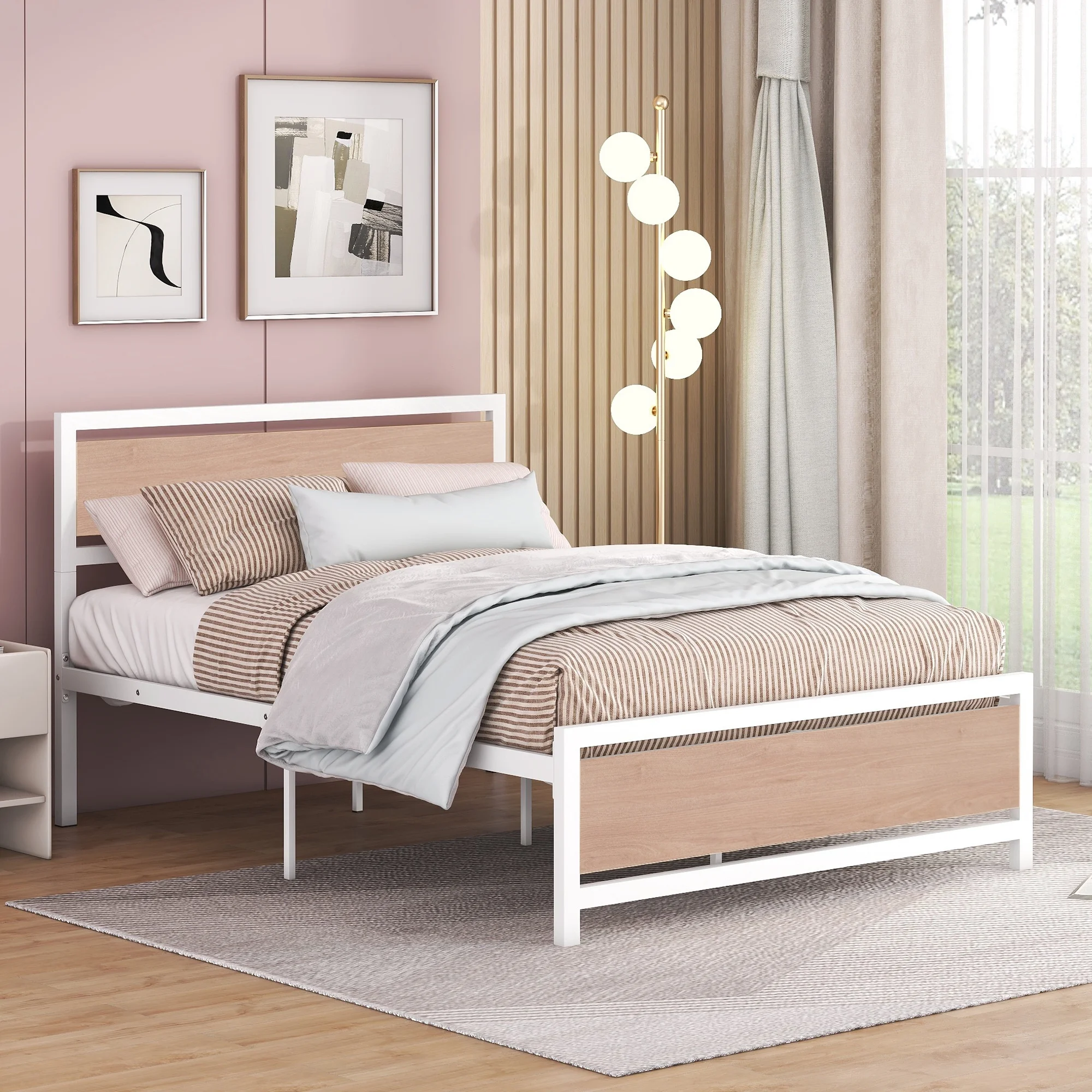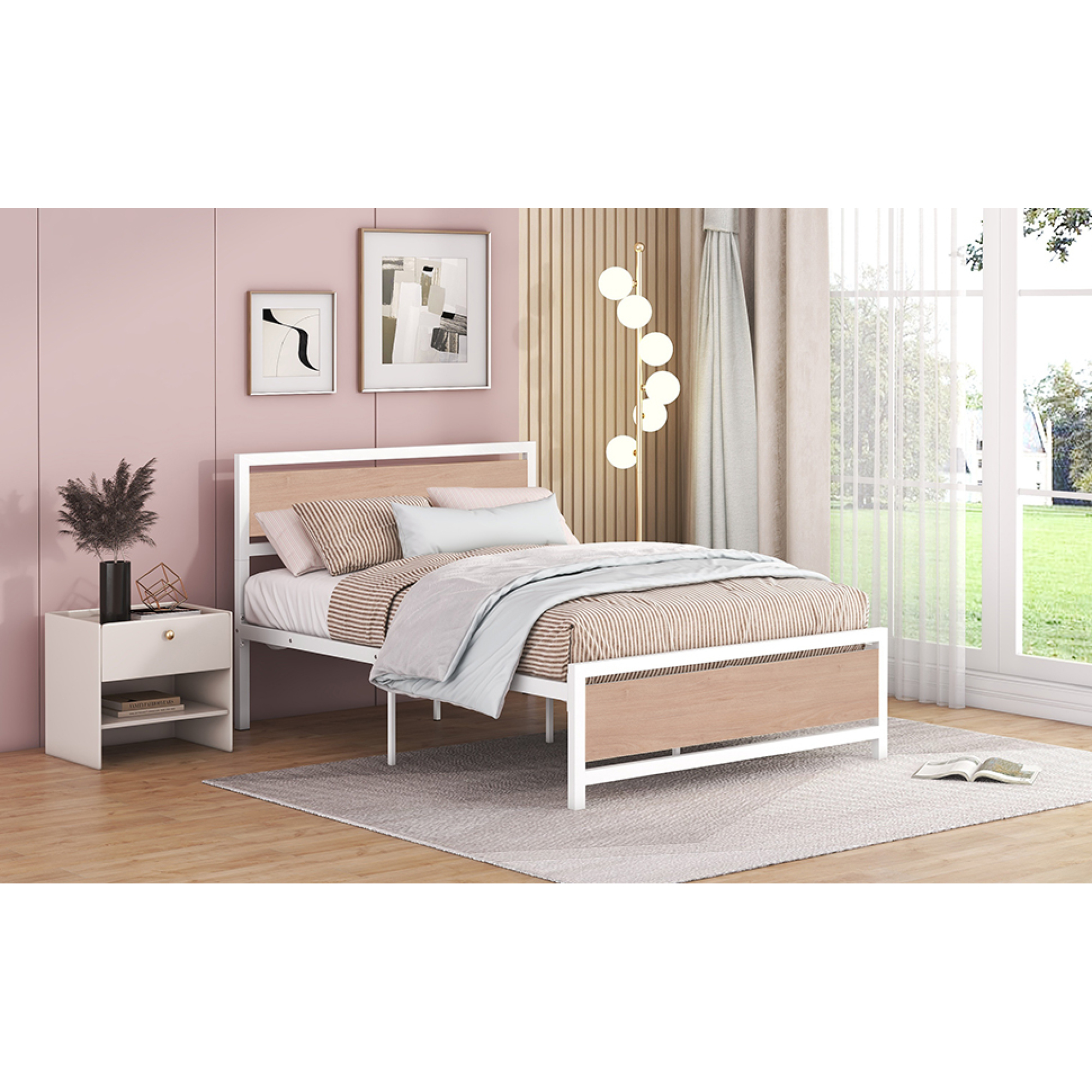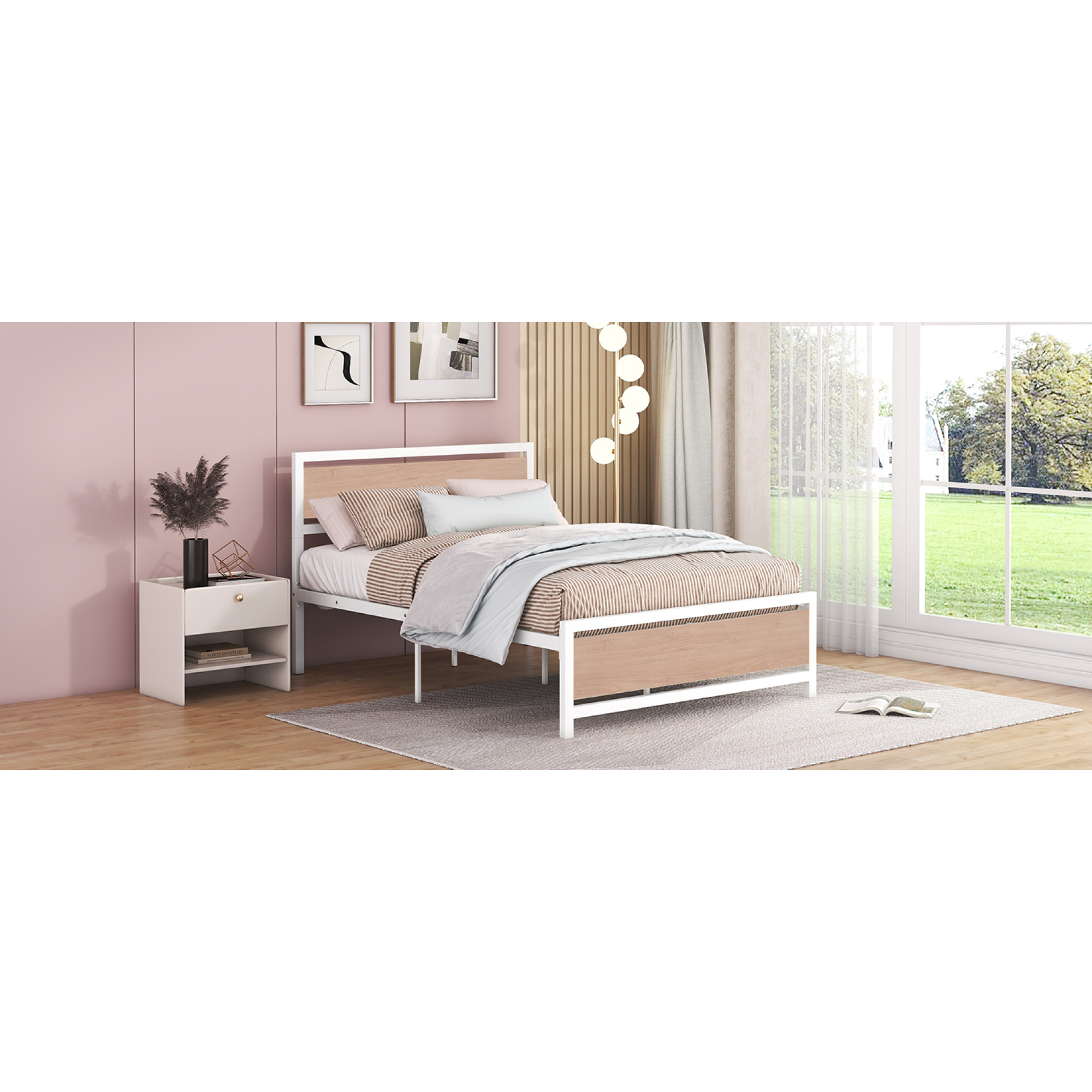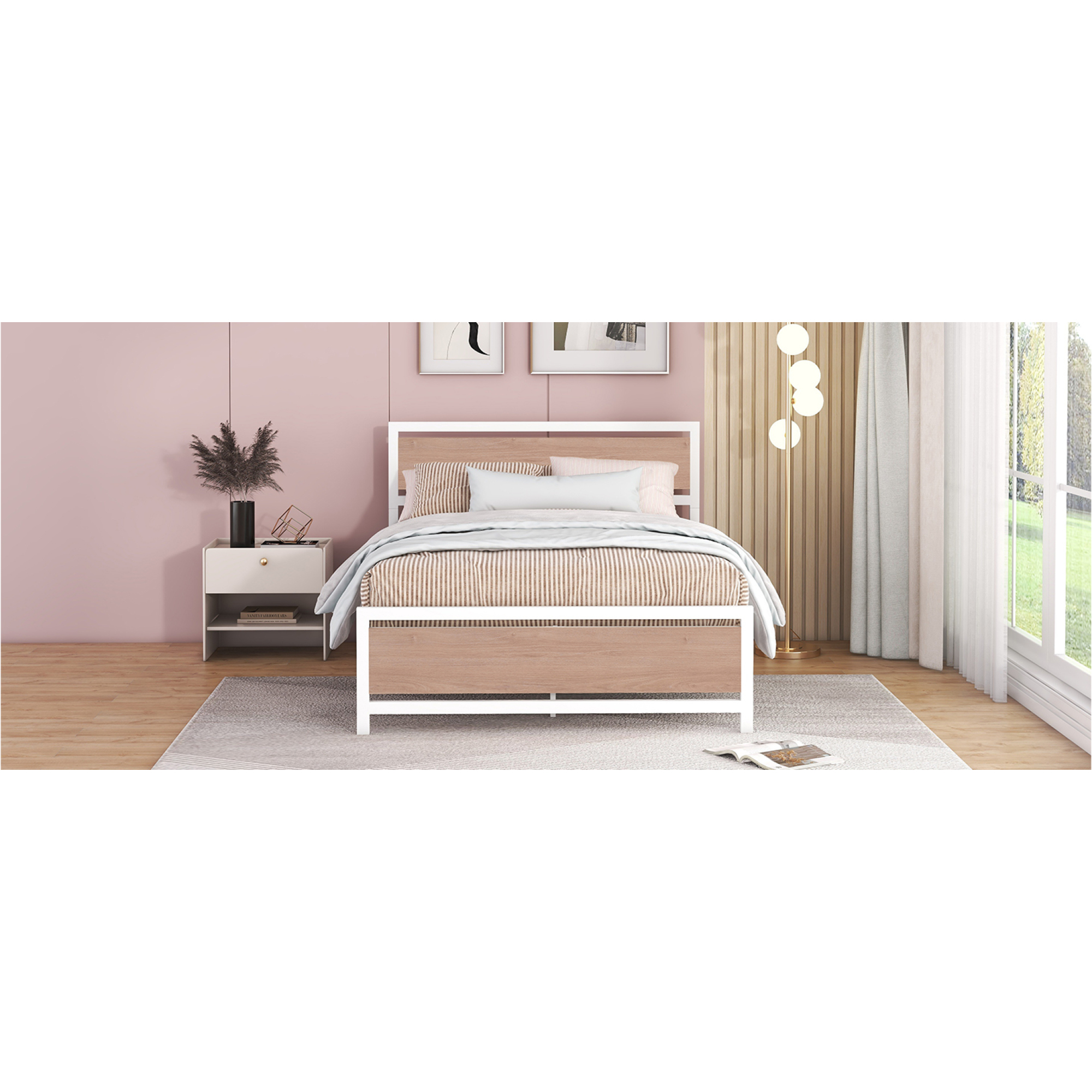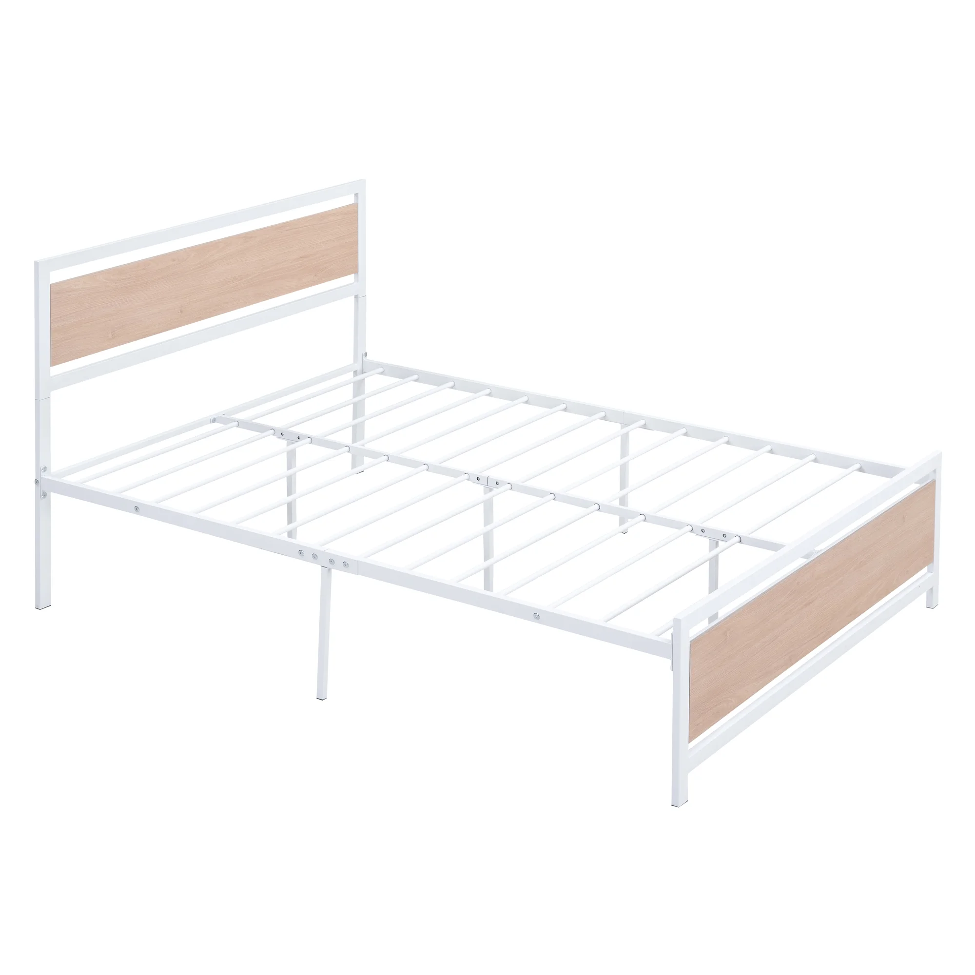 Full Size Platform Bed, Metal and Wood Bed Frame with Headboard and Footboard , White