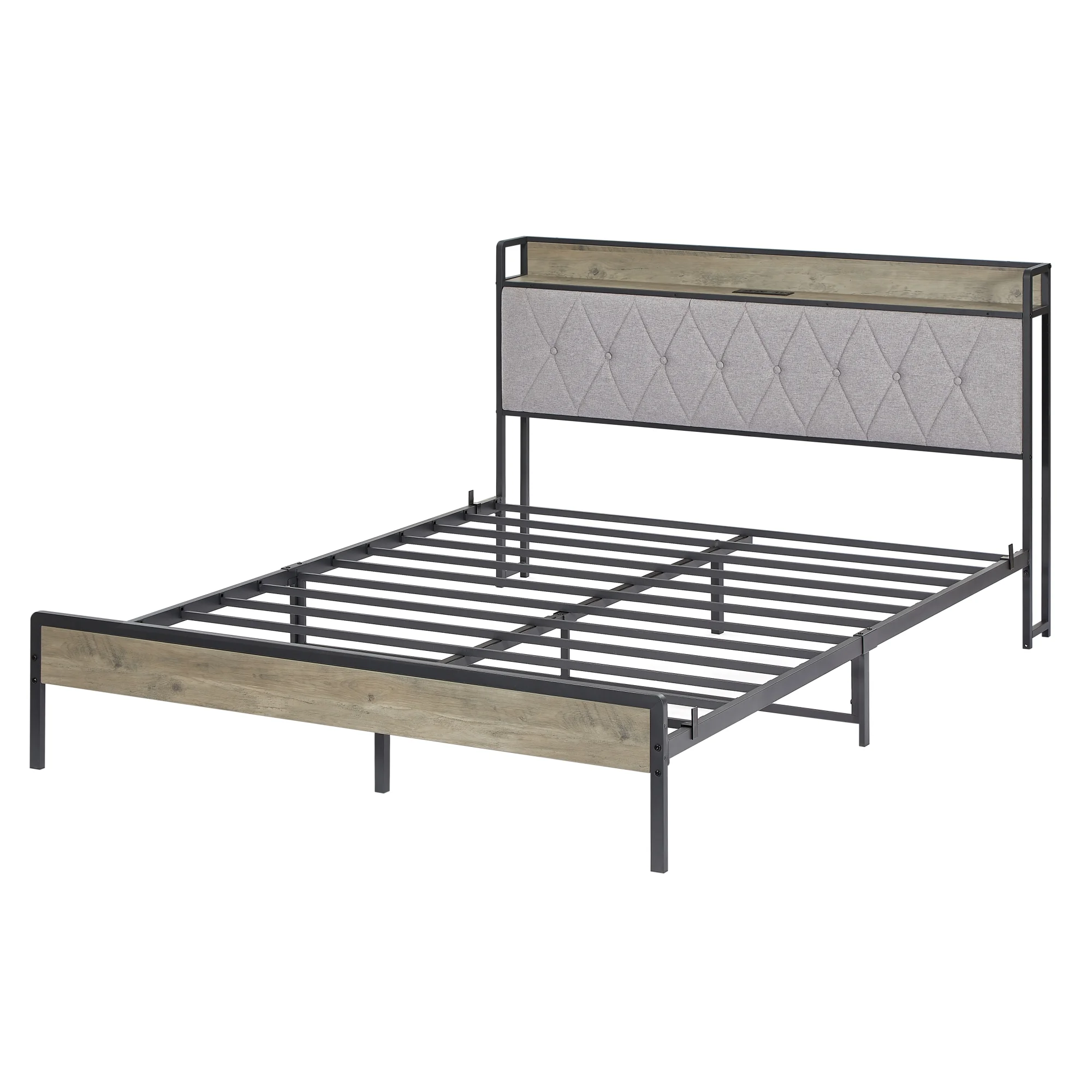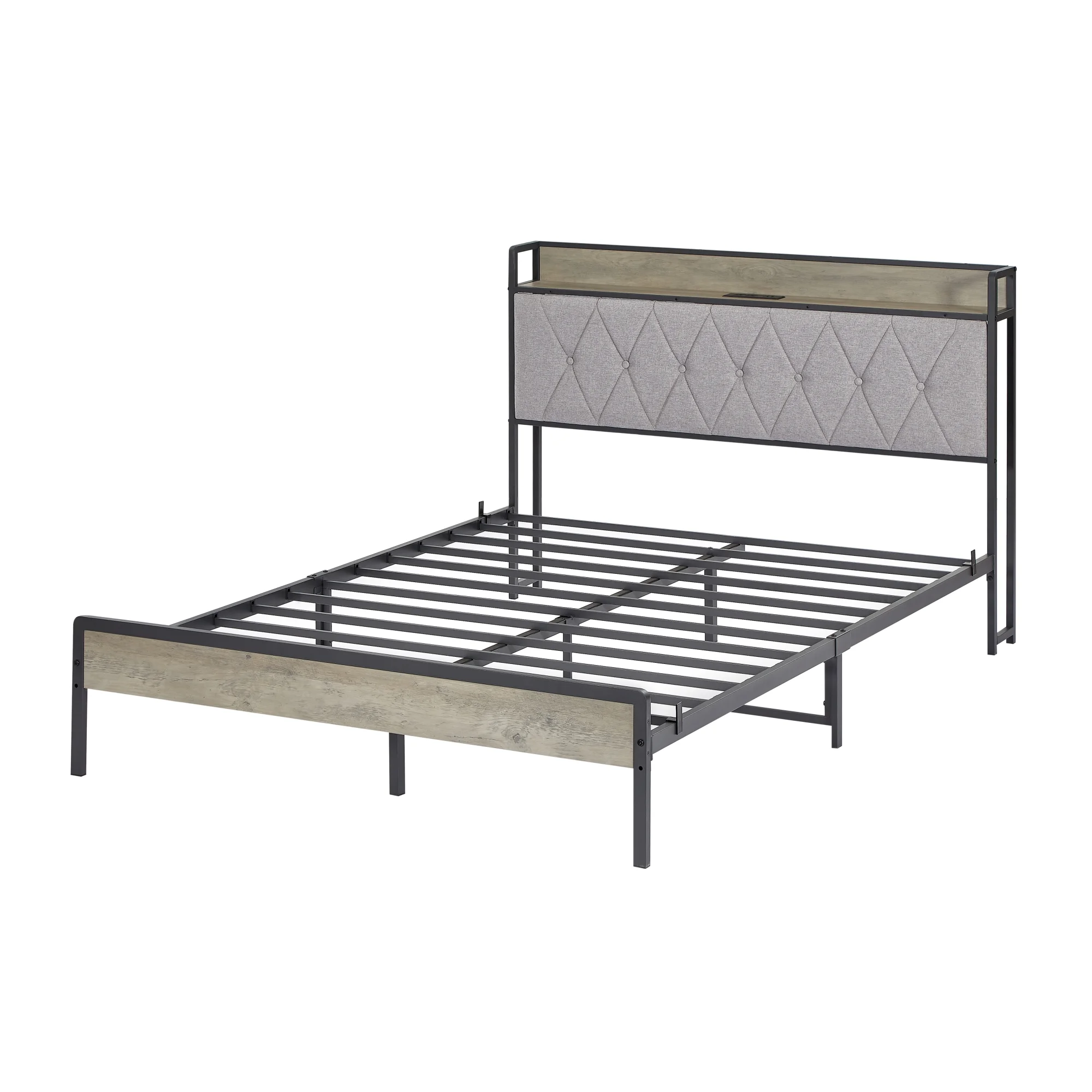 Full Size Bed Frame with Charging Station - Grey, 87.8'' L x 61.8'' W x 39.2'' H