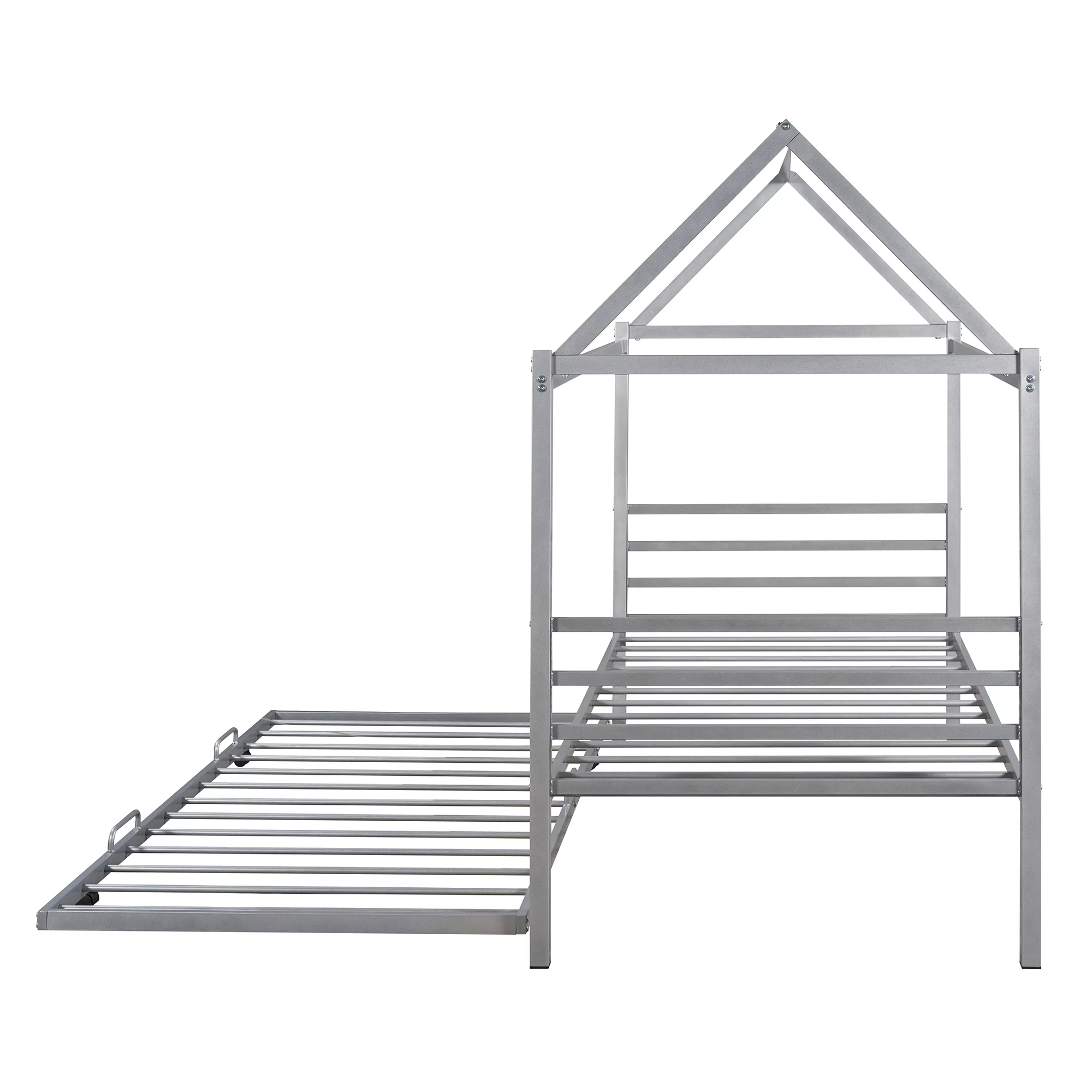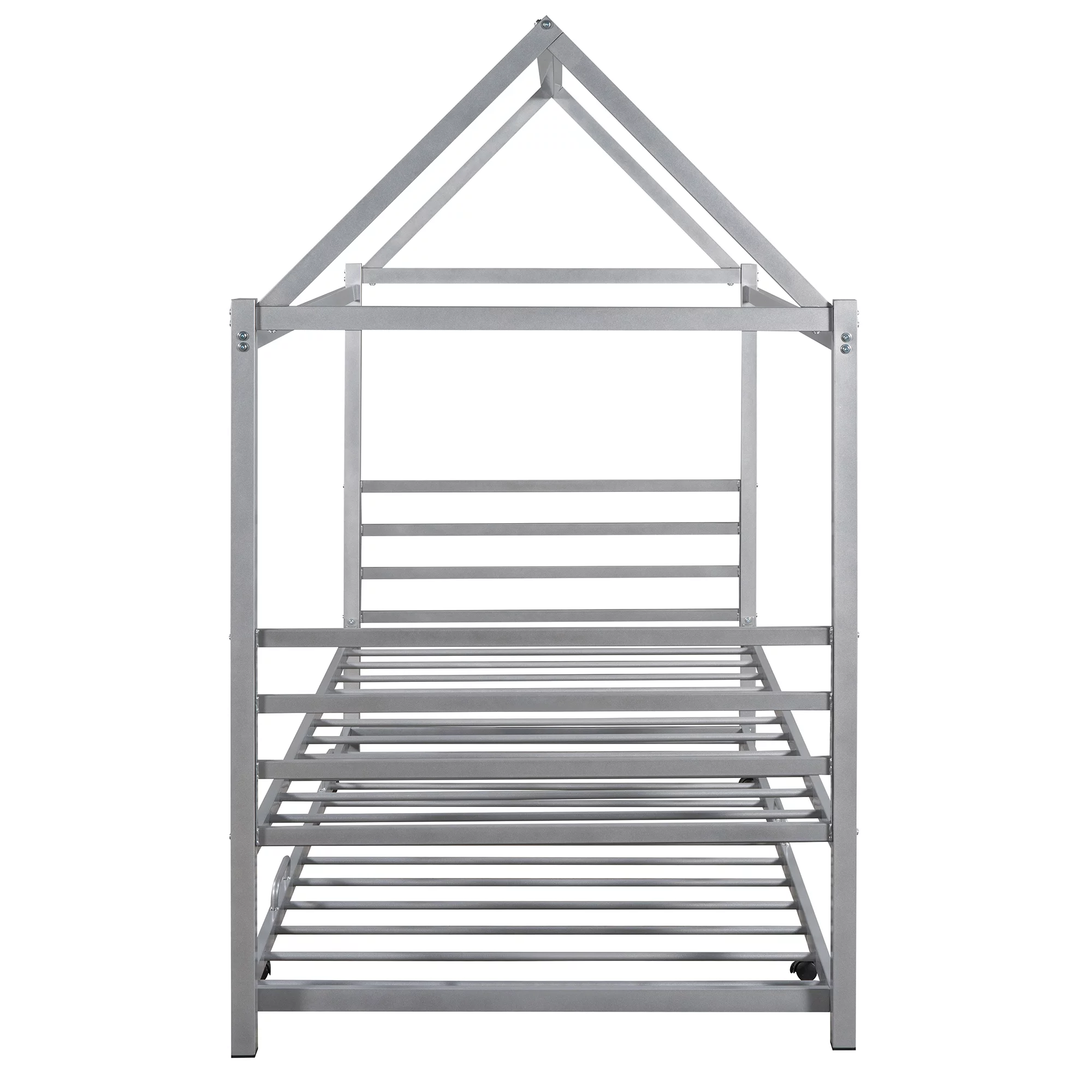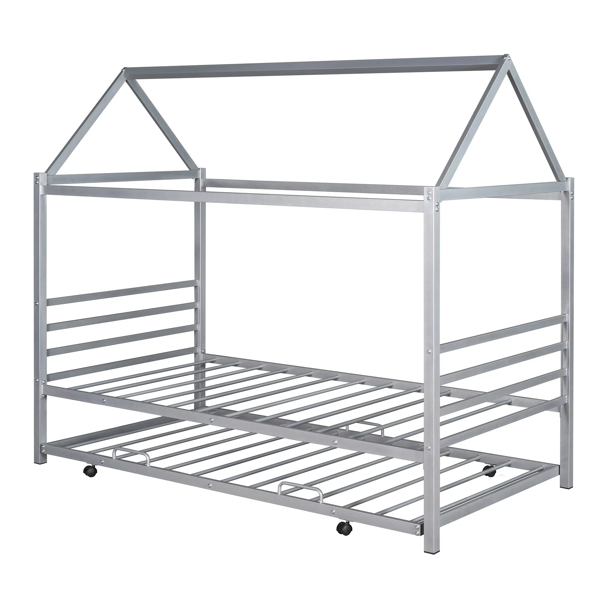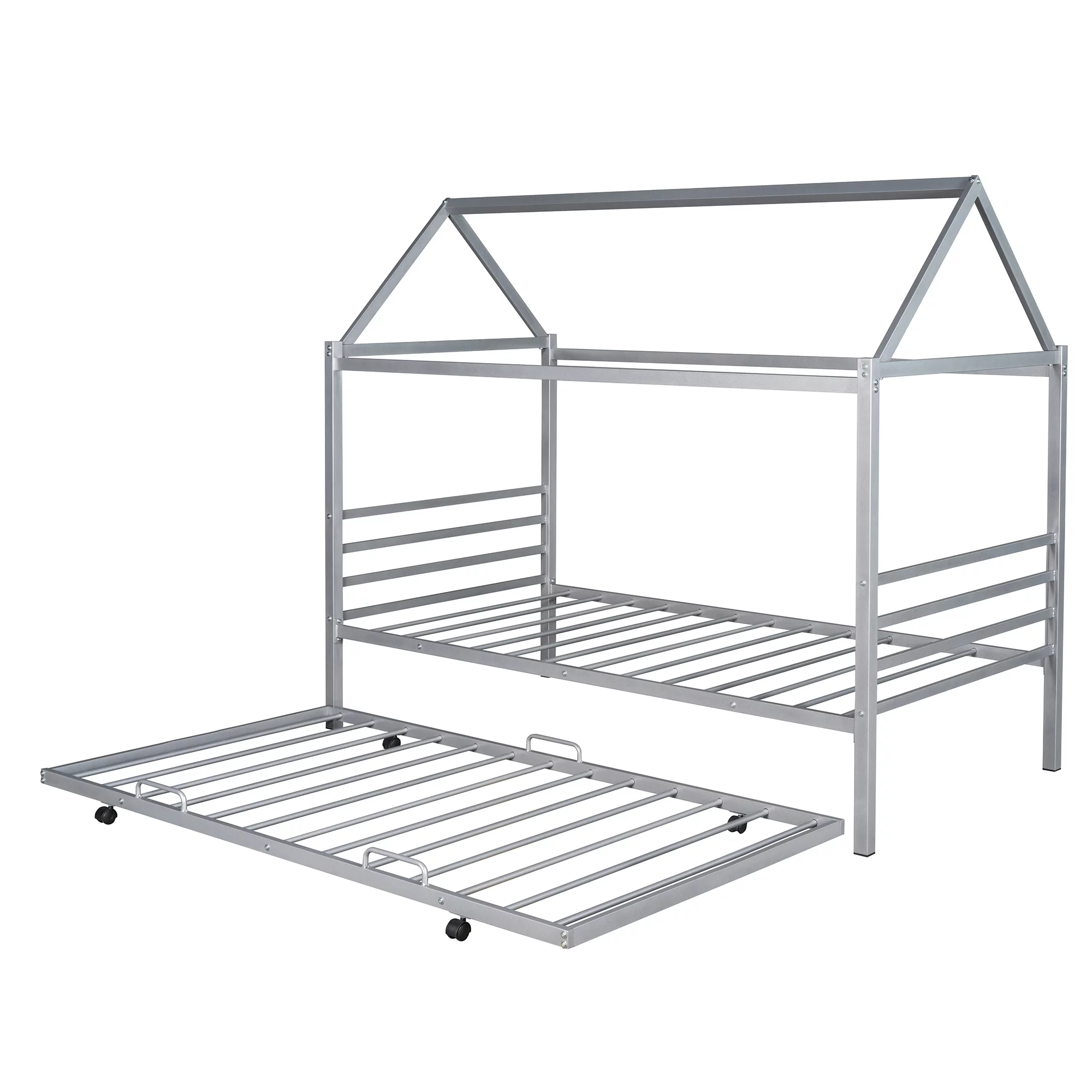Momspeace Twin Size Metal House Shape Platform Bed with Trundle for Kids Teens Bedroom, Silver