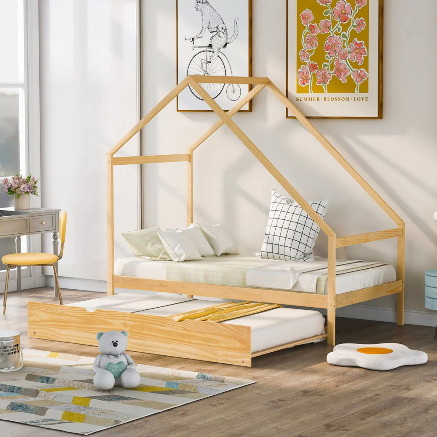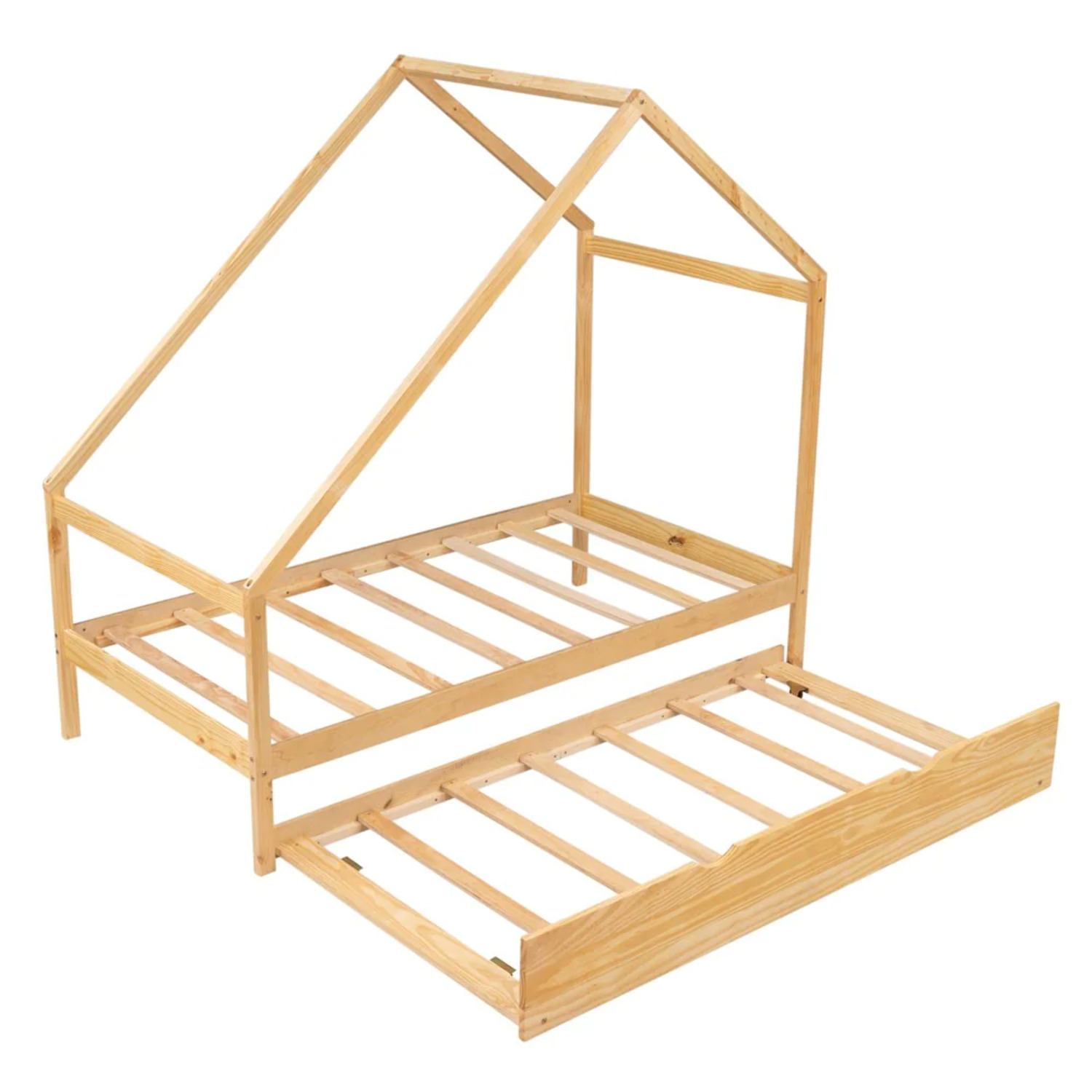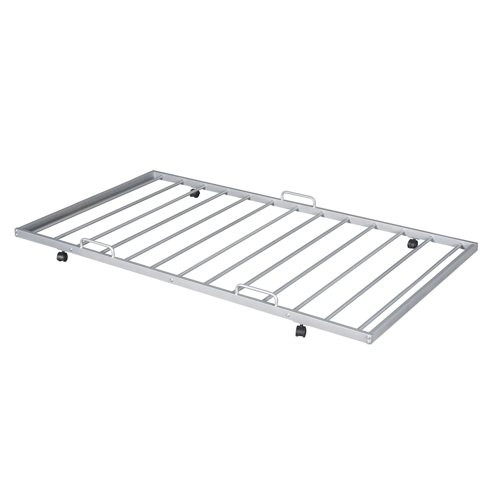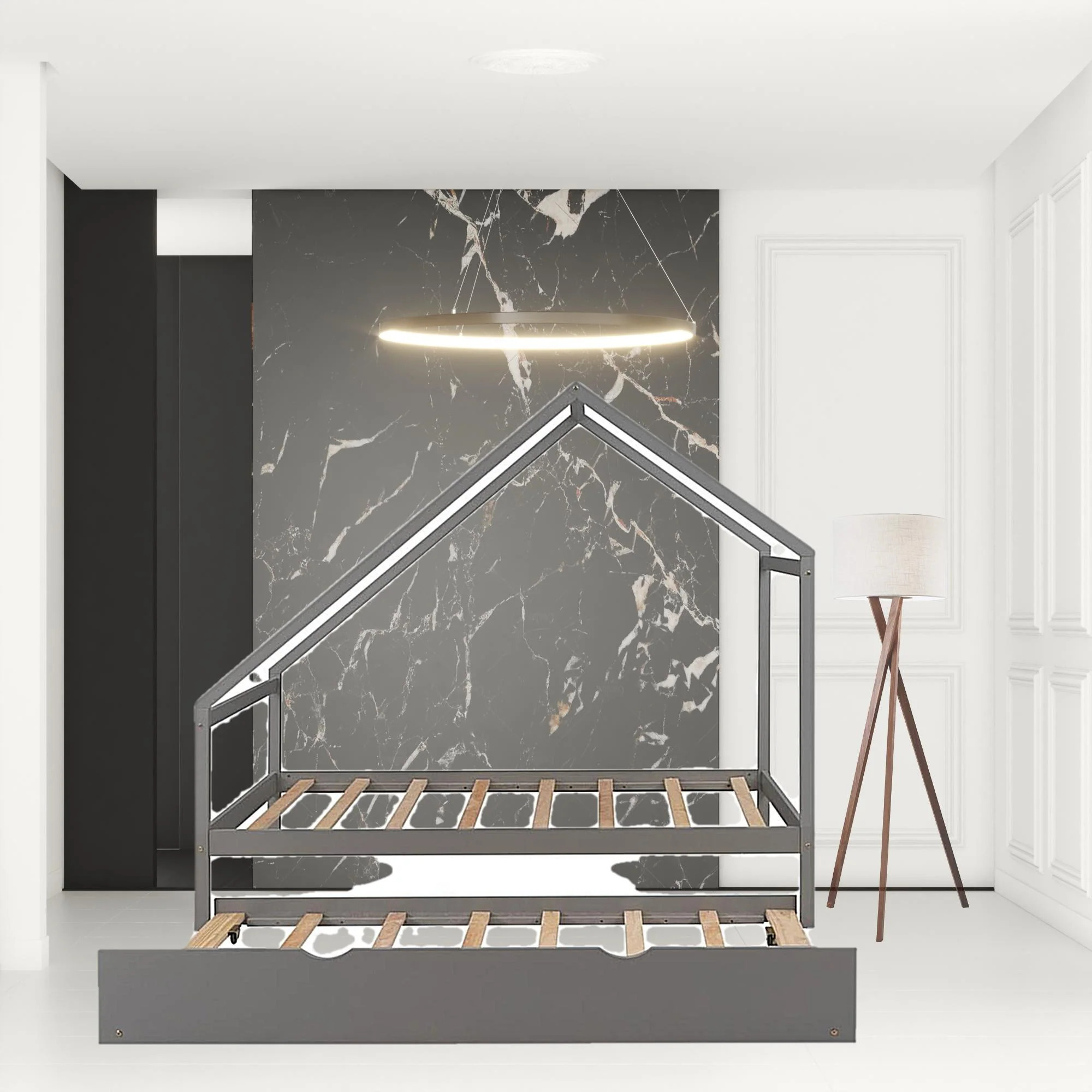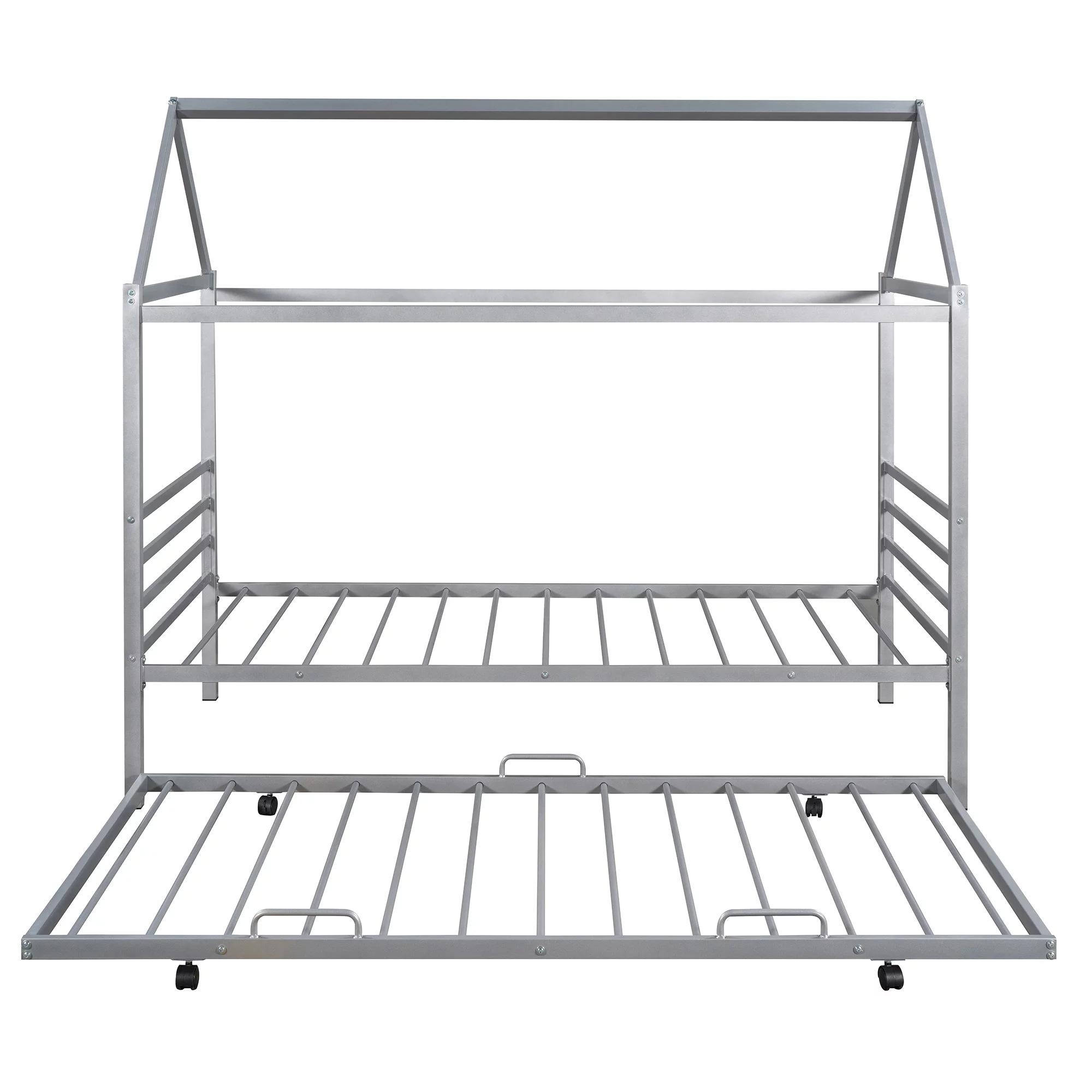 Momspeace Twin Size Metal House Shape Platform Bed with Trundle for Kids Teens Bedroom, Silver