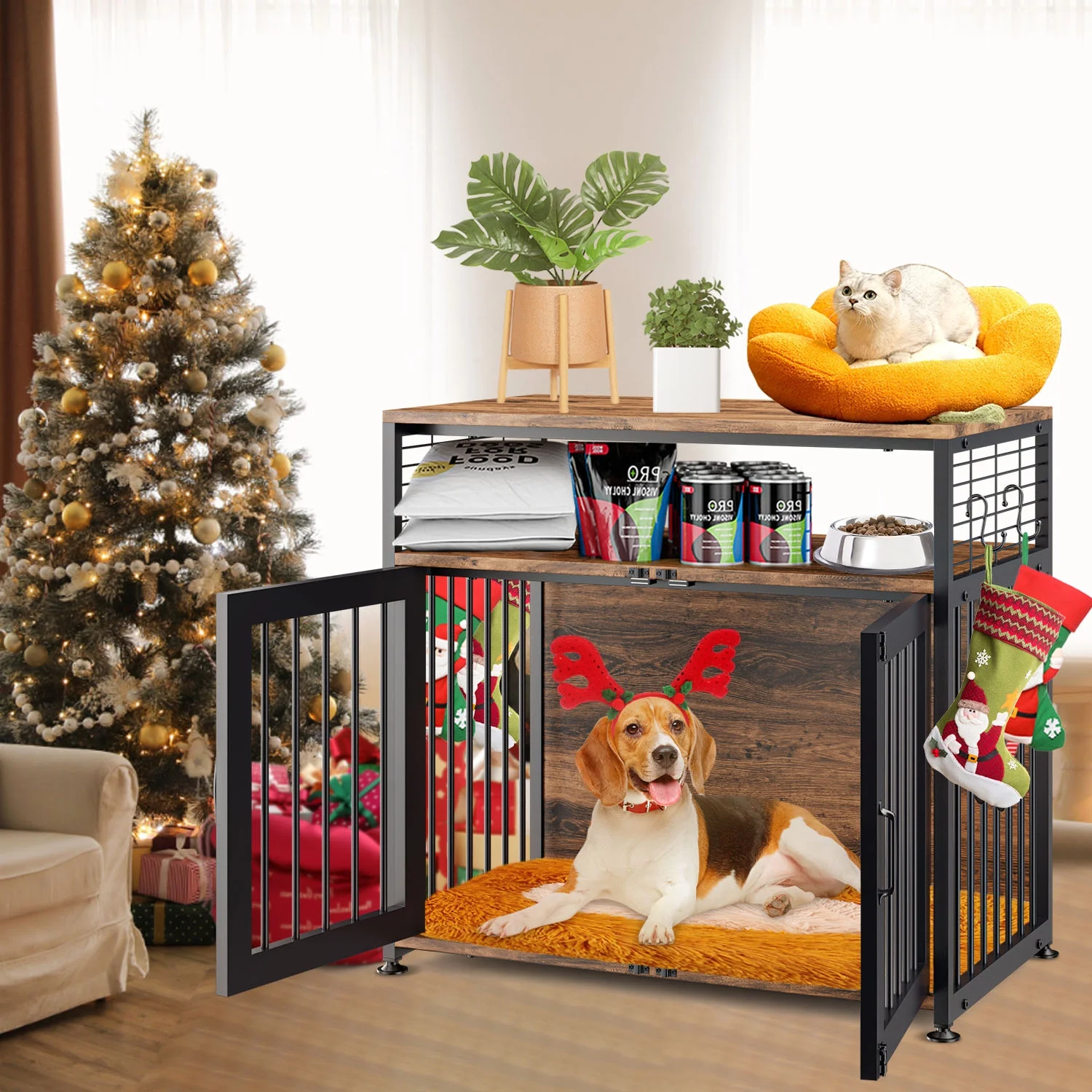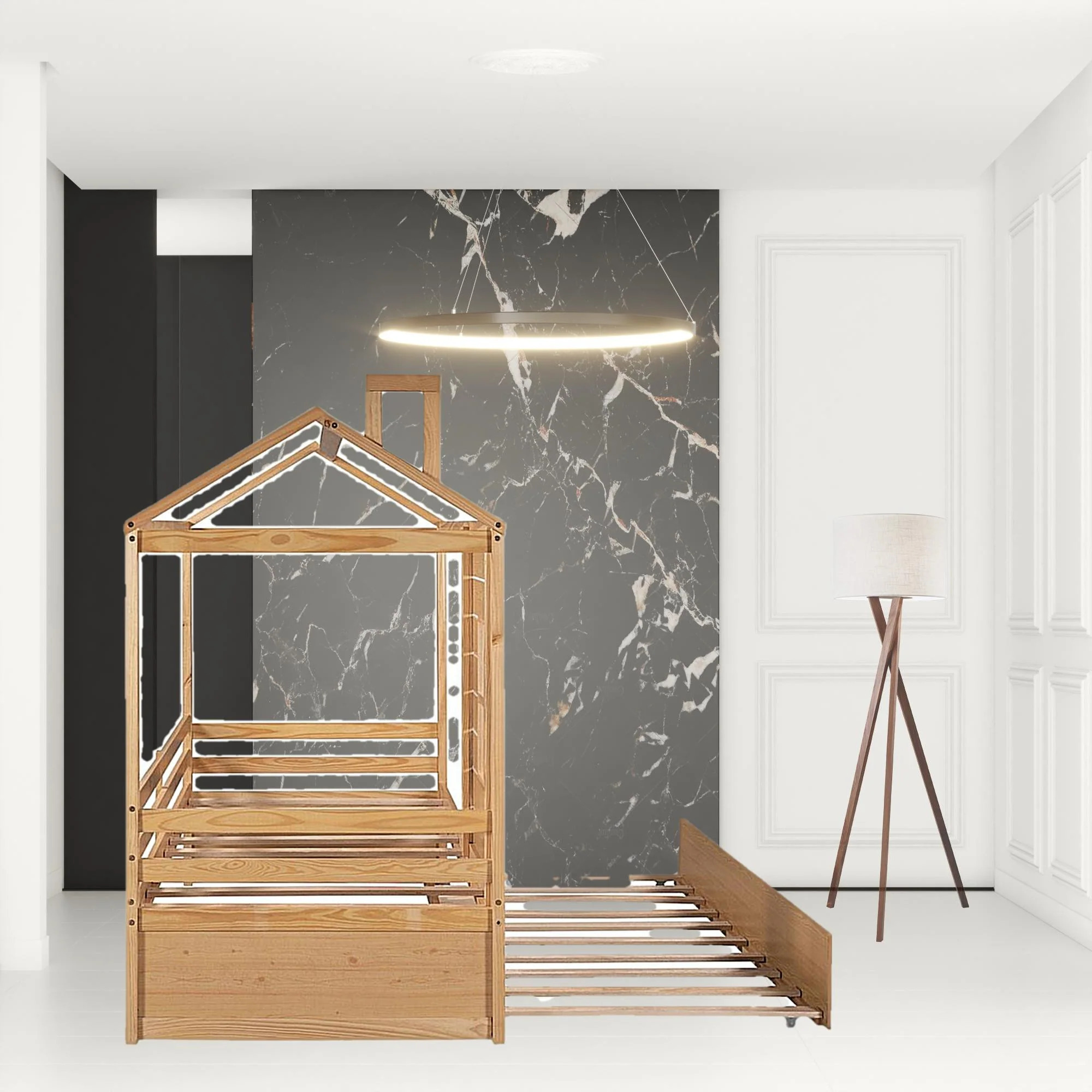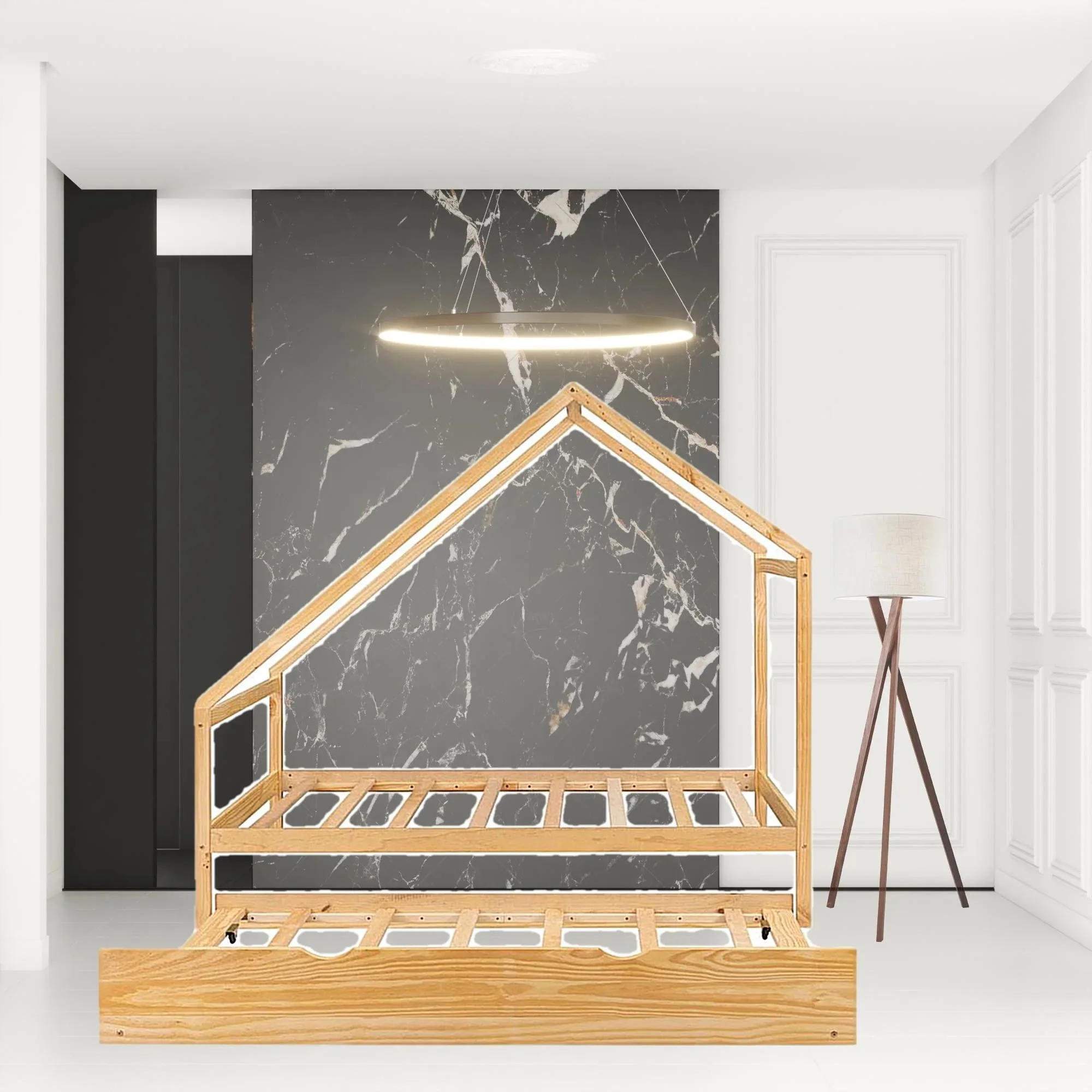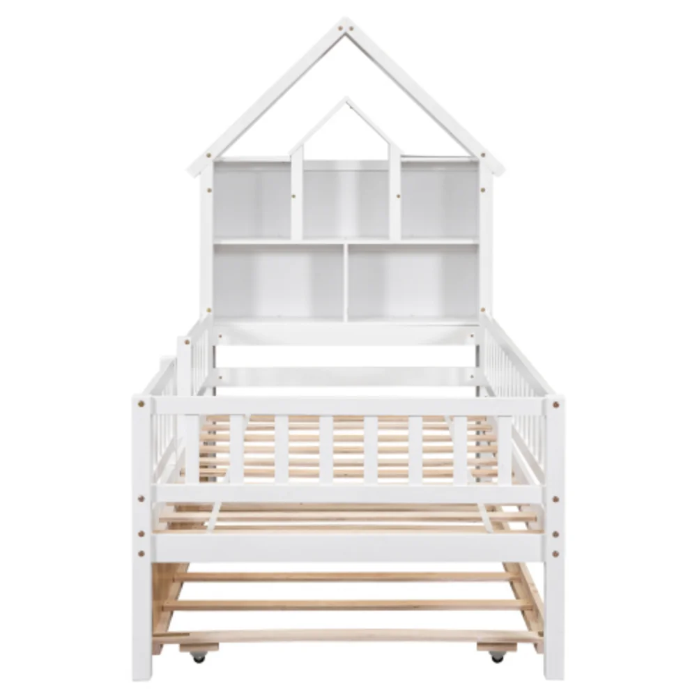 Twin Size House-Shaped Headboard with Fence Guardrails and Trundle,White