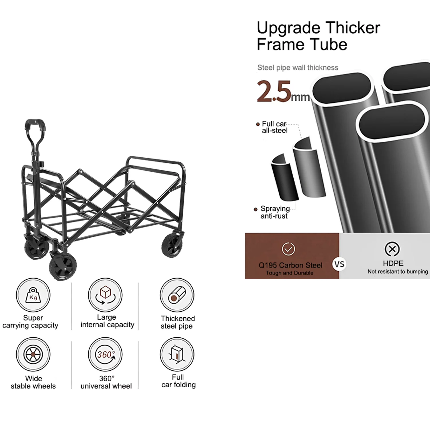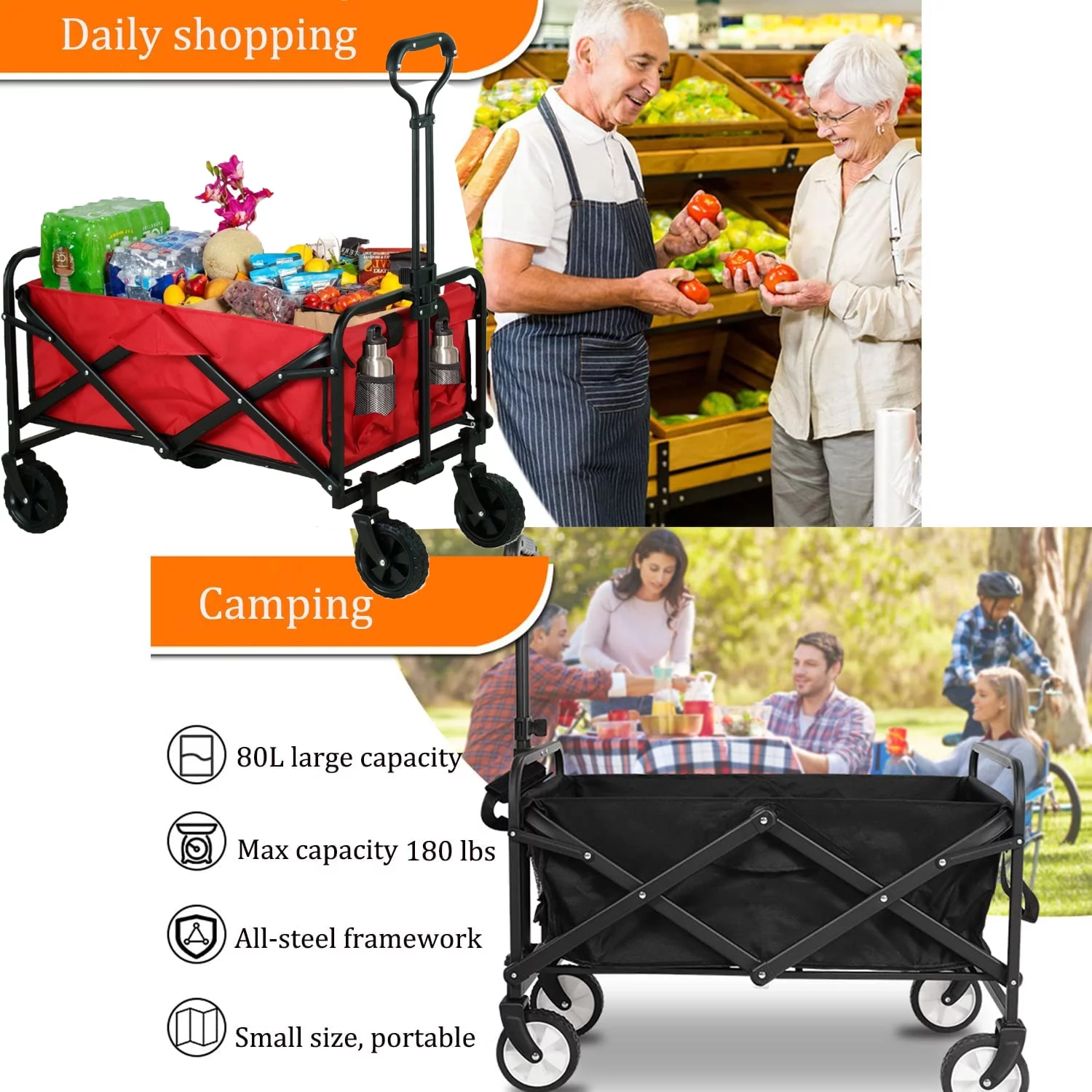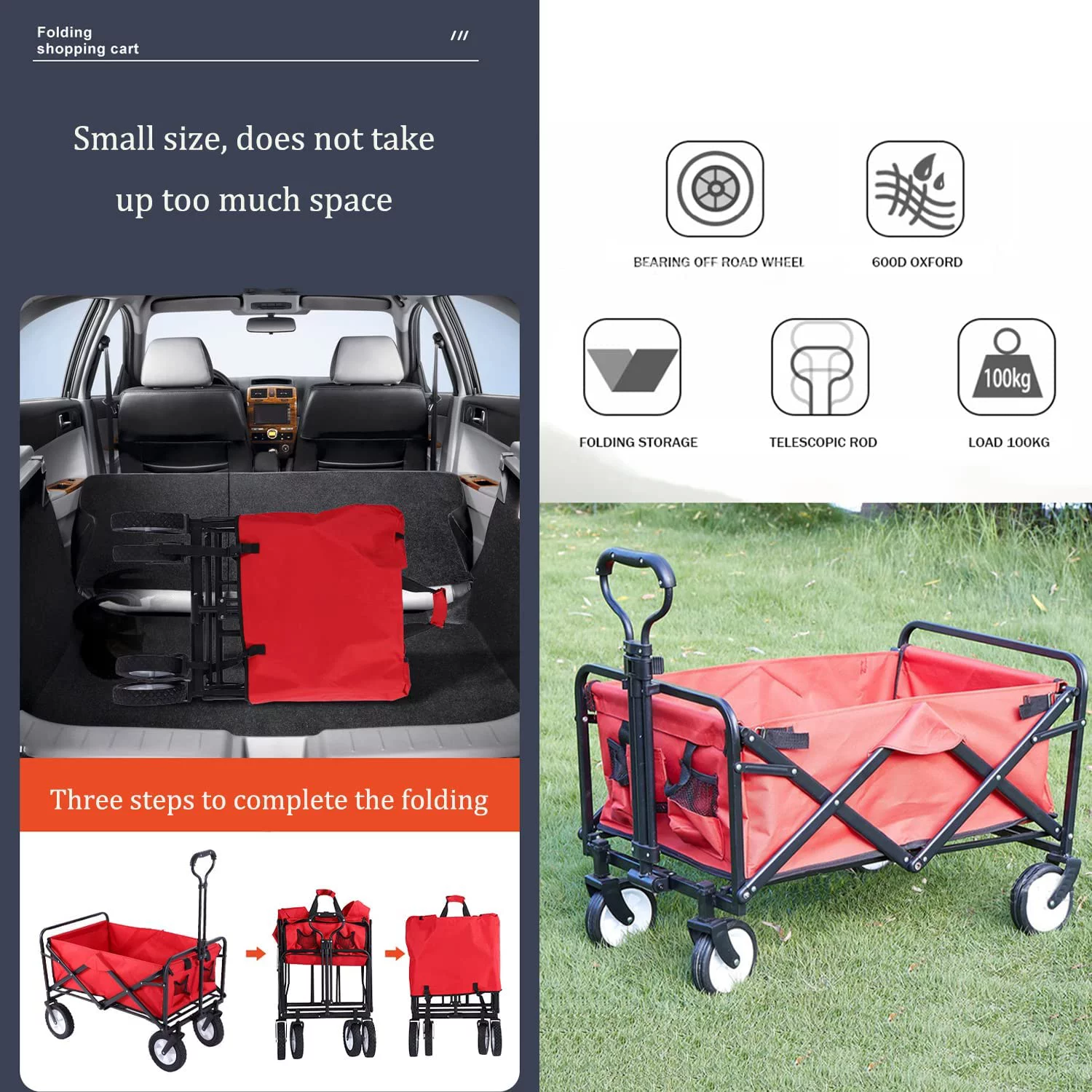 VEVOR Wagon Cart Folding Wagon Cart with 176lbs Load Outdoor Utility Wagon w/Adjustable Handle Red