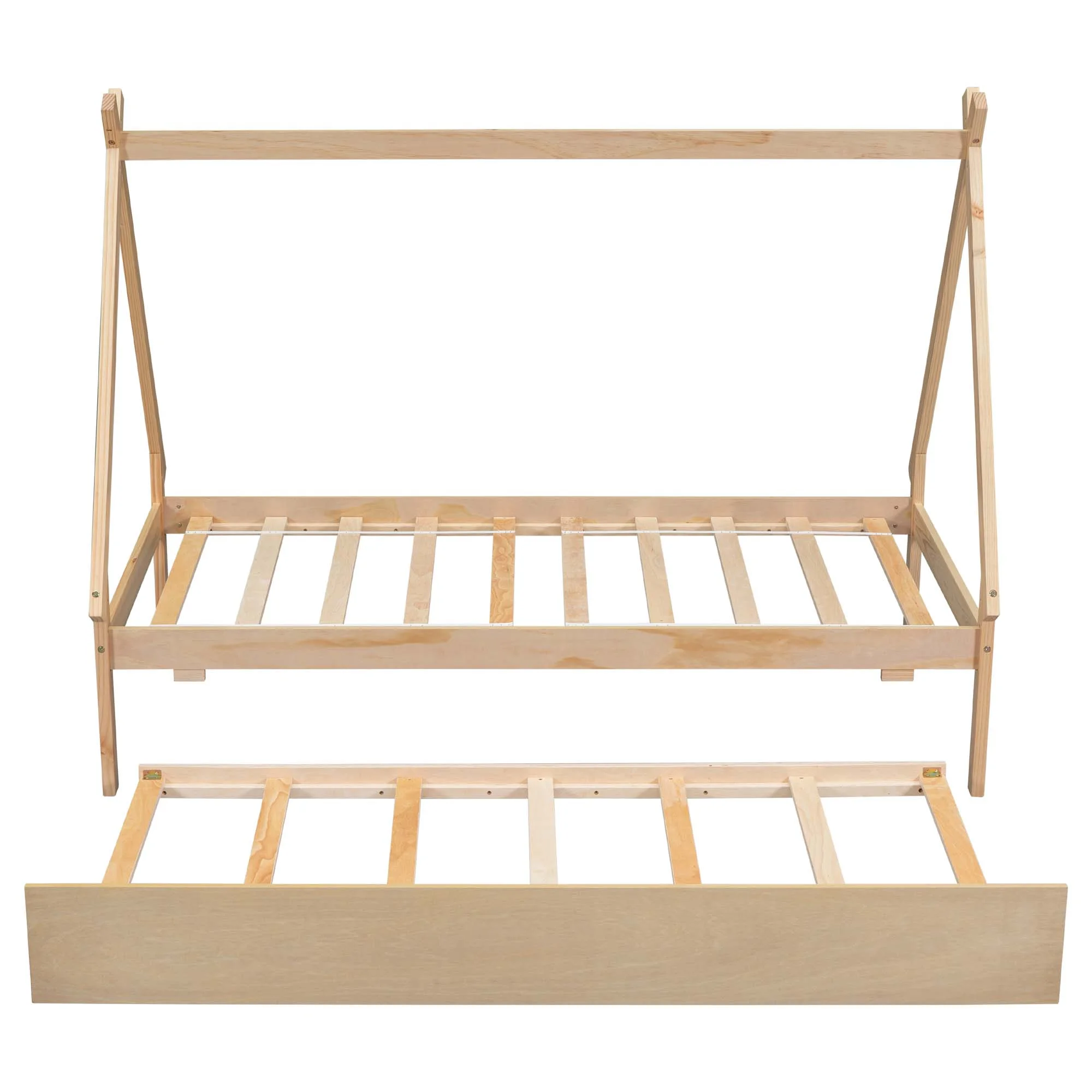 DEALTOPS Twin Size Tent Floor Bed with Pull-out Trundle, Wood Montessori Bed for Kids, Natural