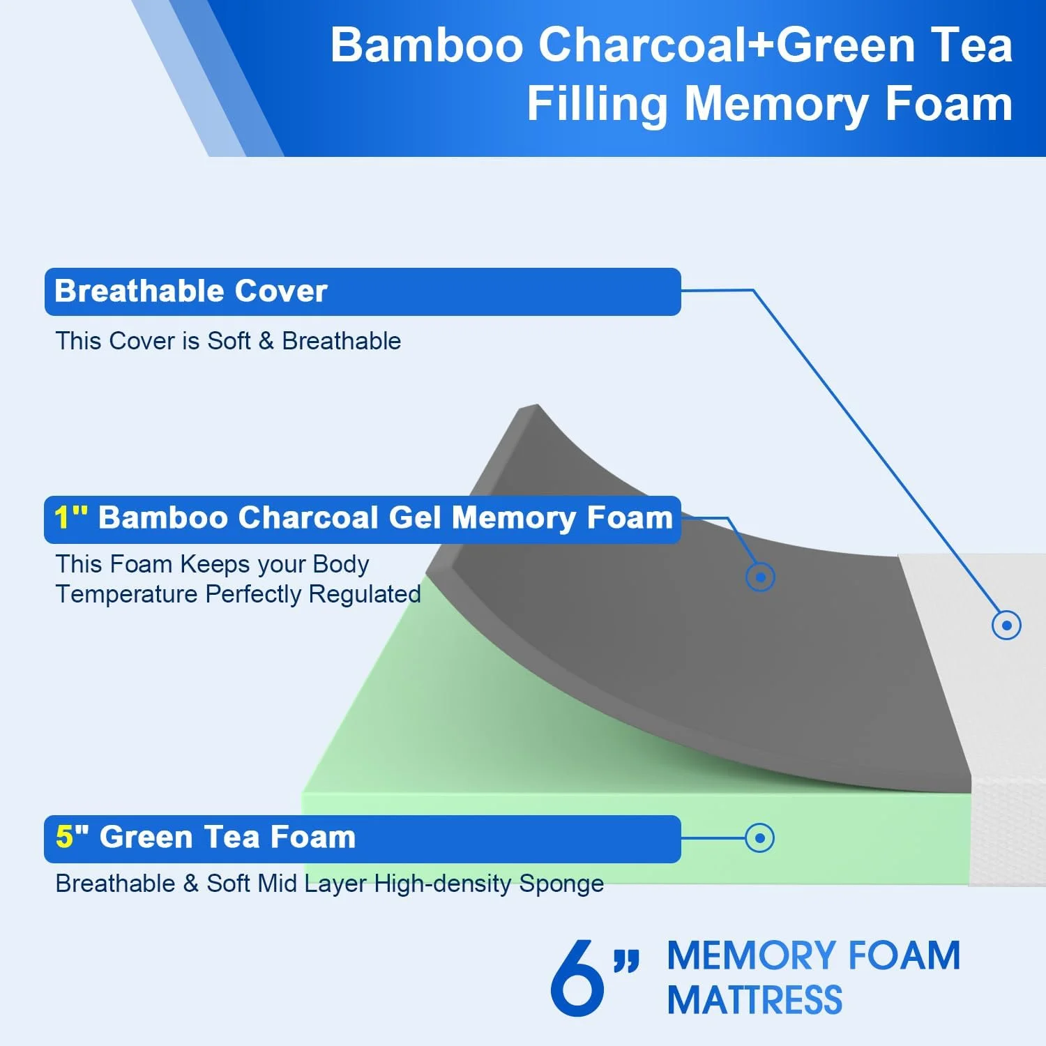 PayLessHere 5/6 Bamboo Charcoal/Green Tea Gel Infused Memory Foam Mattress for Adults(5 Inch, Full)