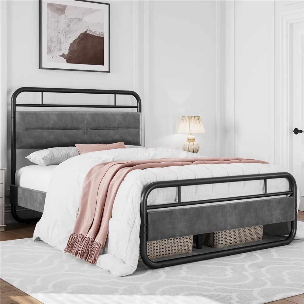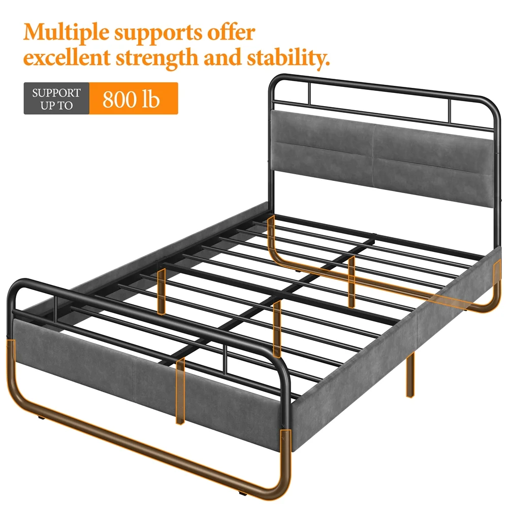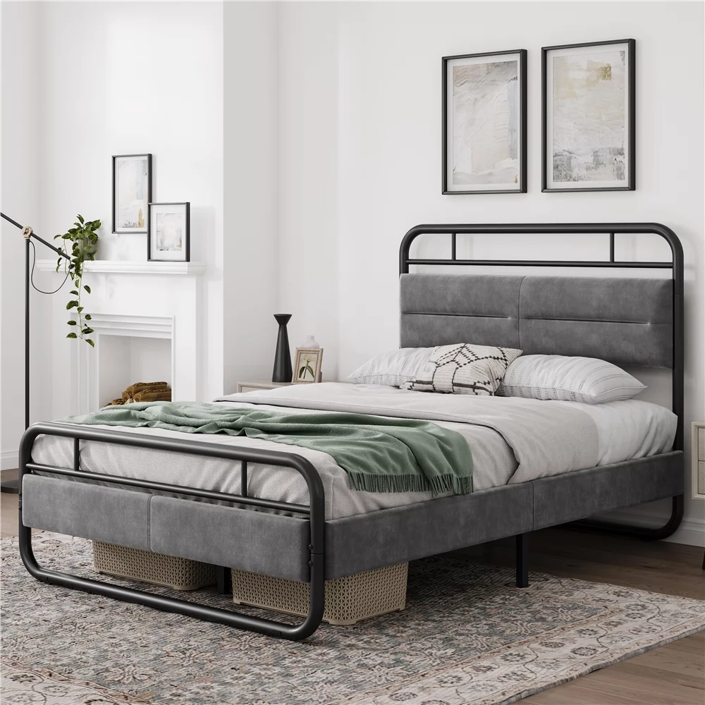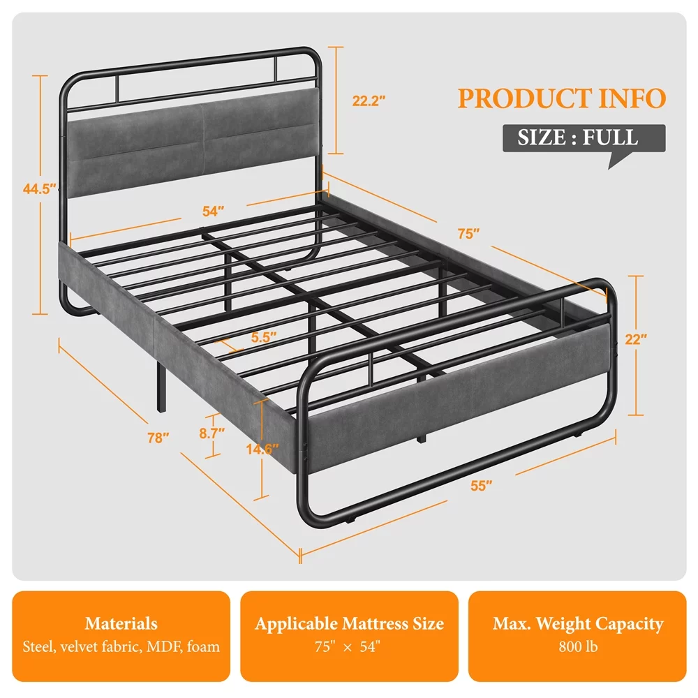 SMILE MART Full Size Metal Platform Bed with Velvet Upholstered Headboard,Dark Gray