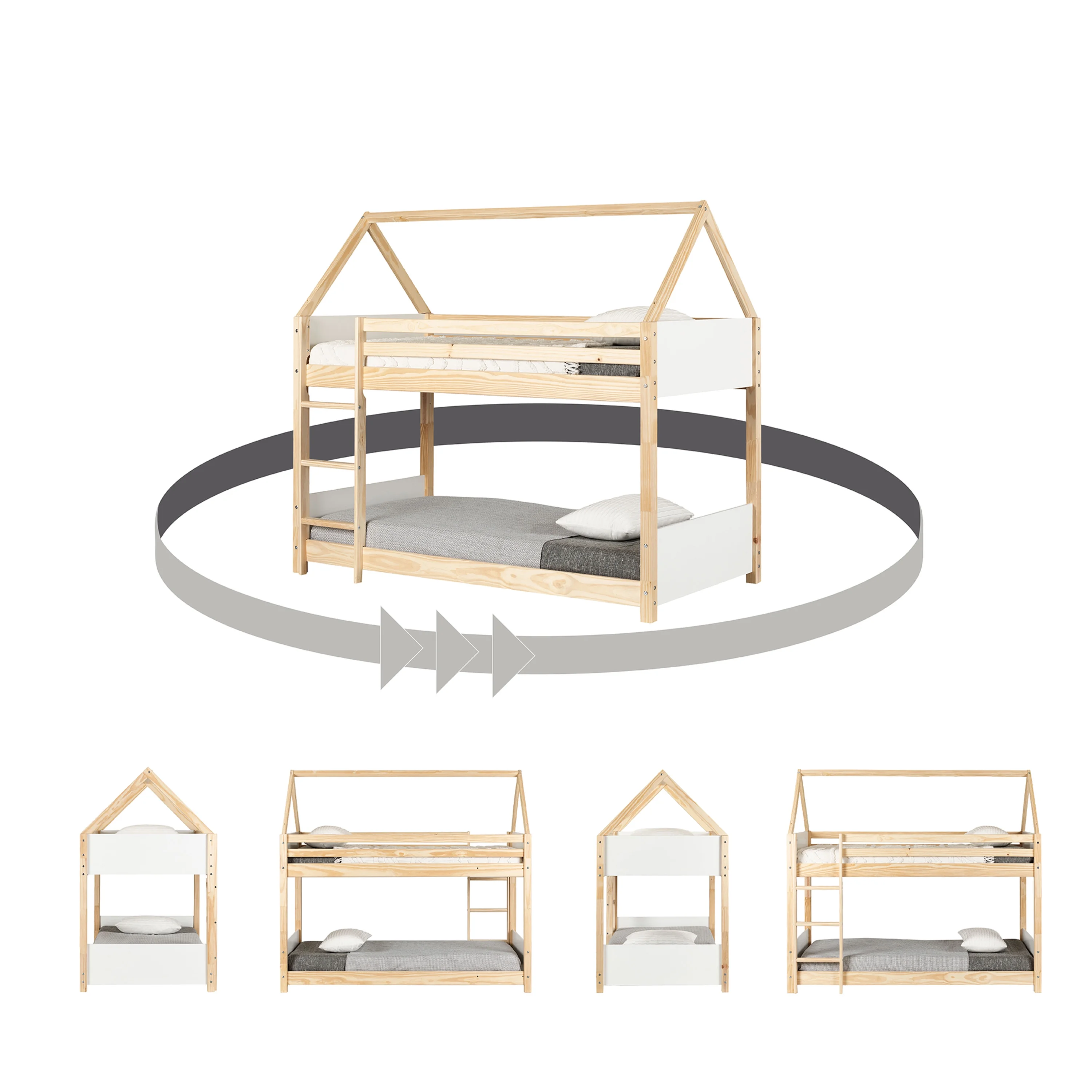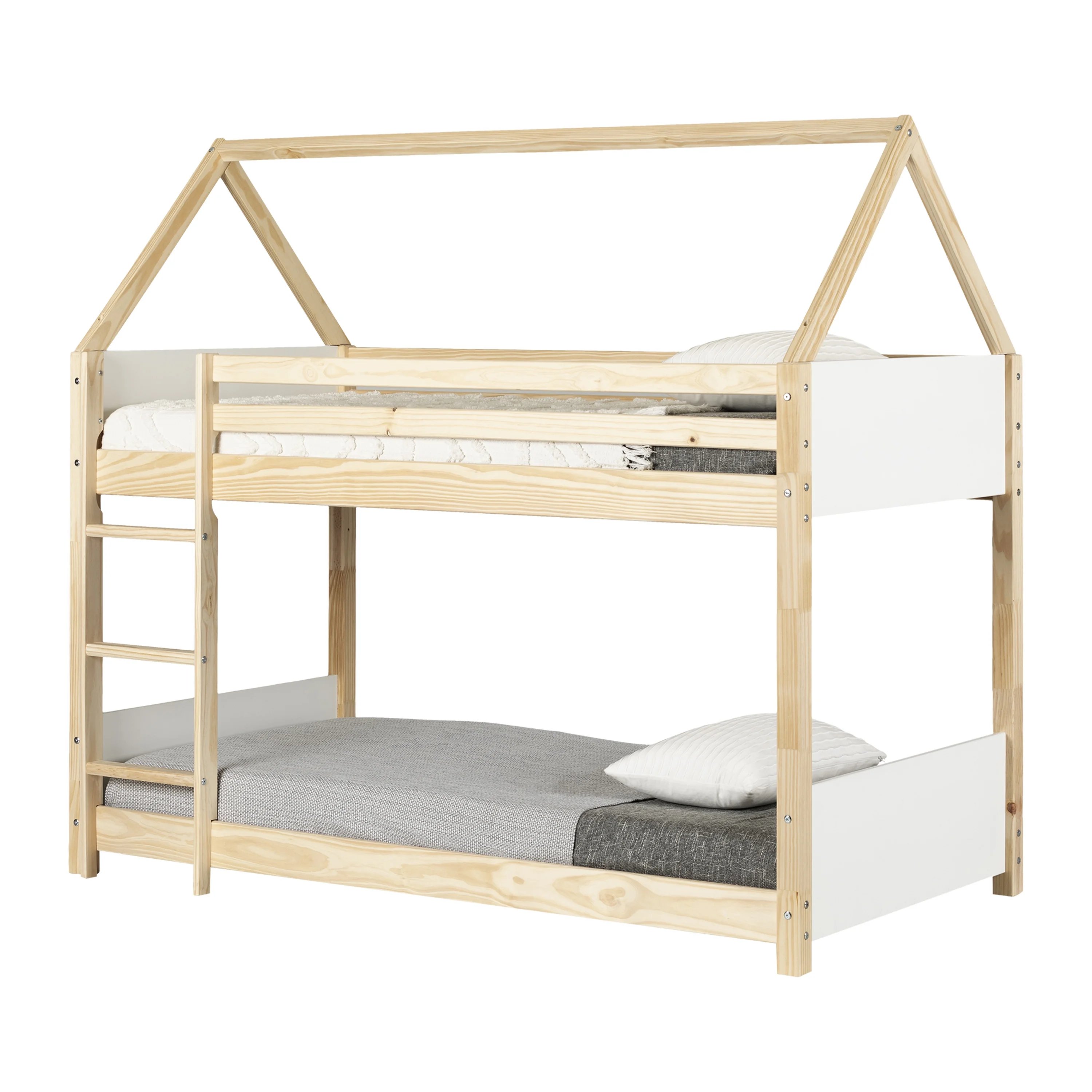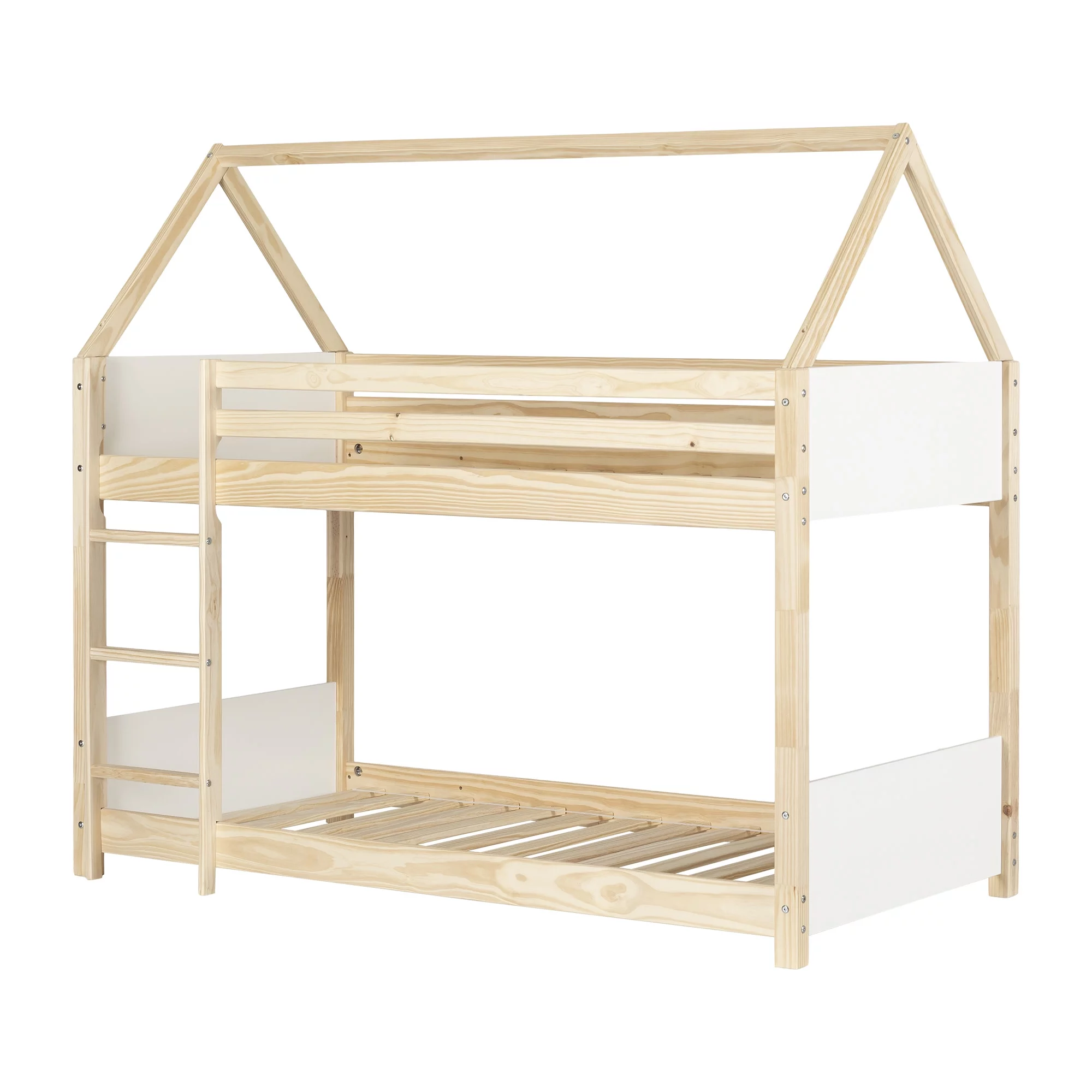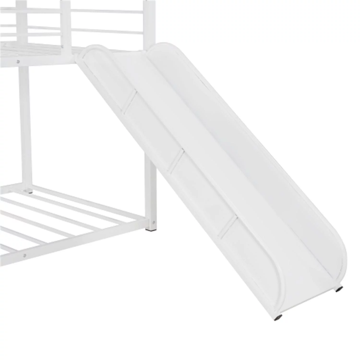 Twin Over Twin Metal Bunk Bed with White Slide, House Bunk Bed with Roof and Guardrails for Kids, Teens, Girls, Boys