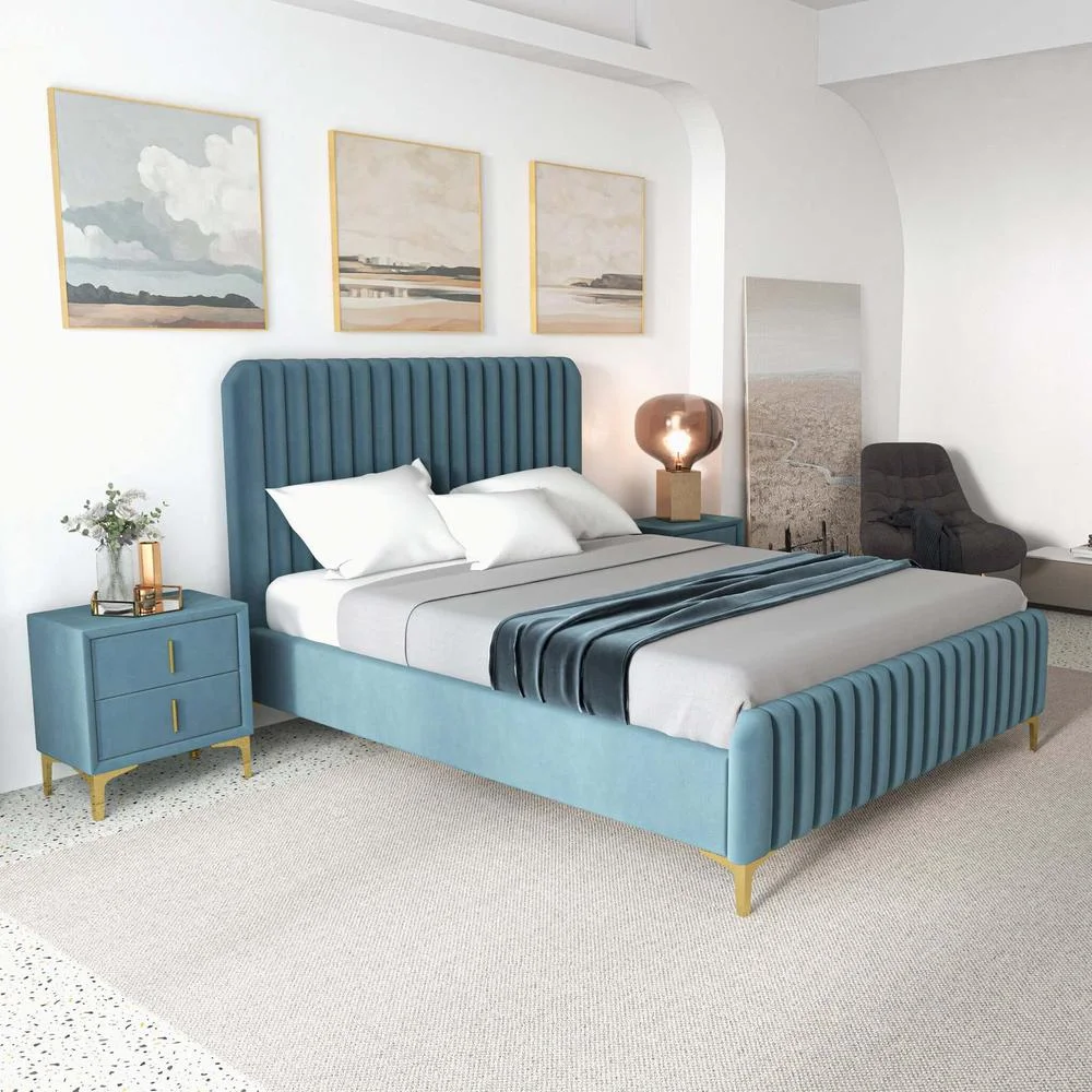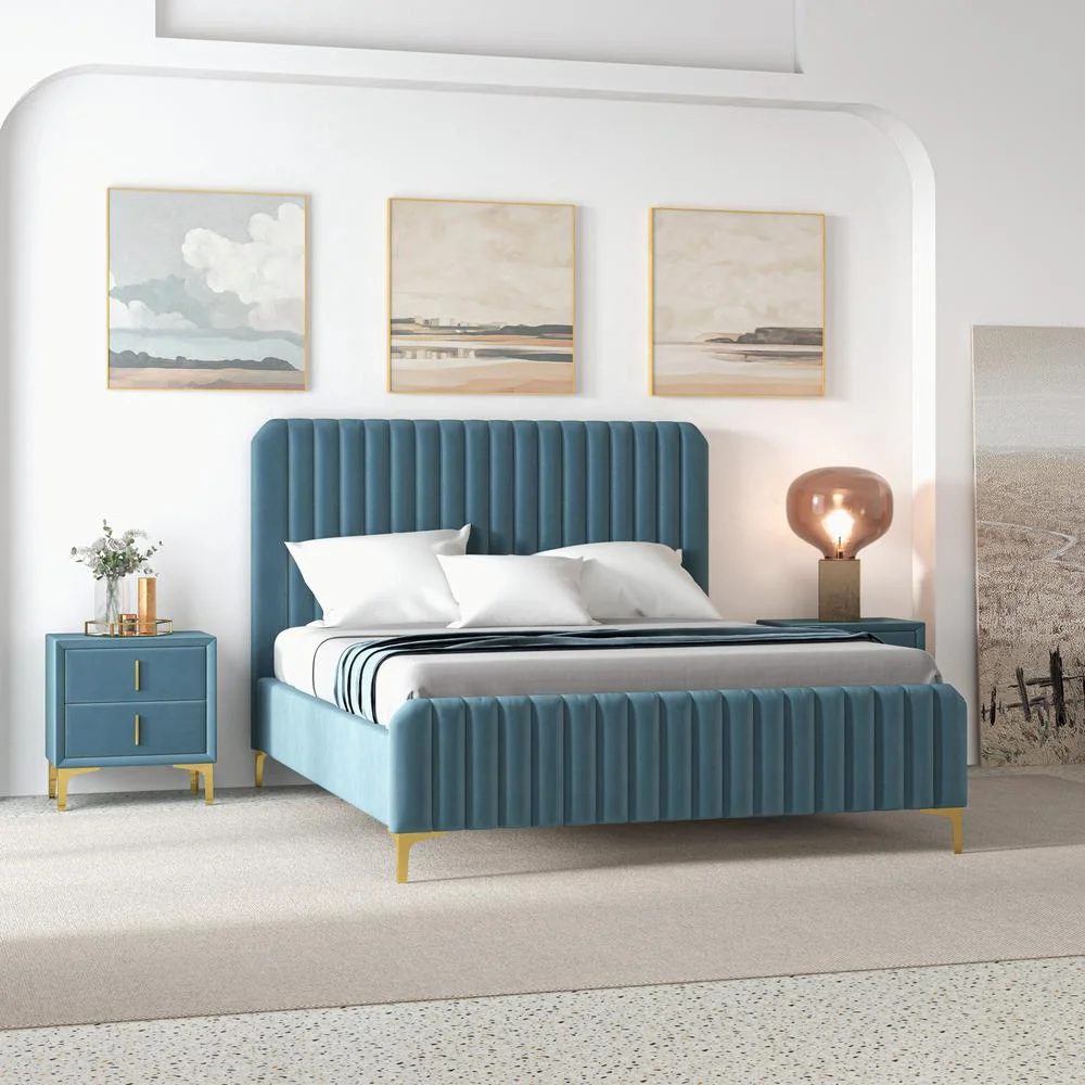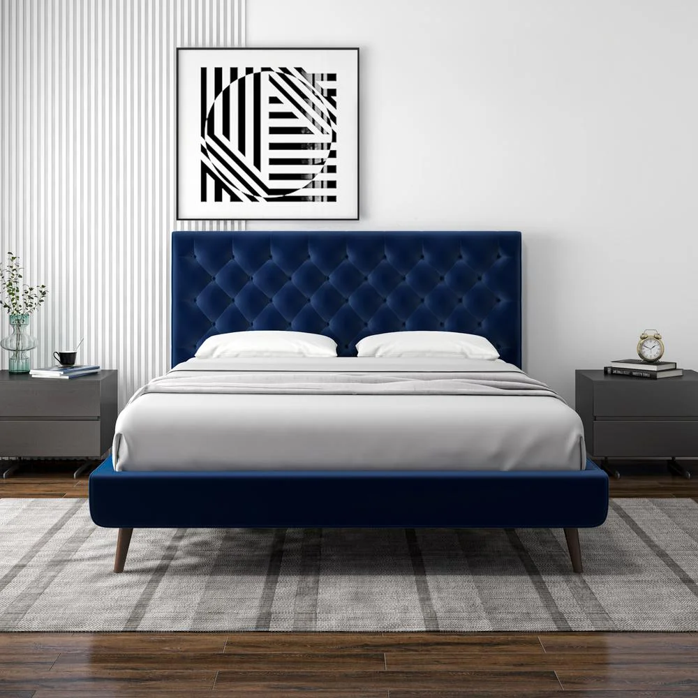 Angelou Mid Century Modern Blue Velvet Upholstered Queen Platform Bed