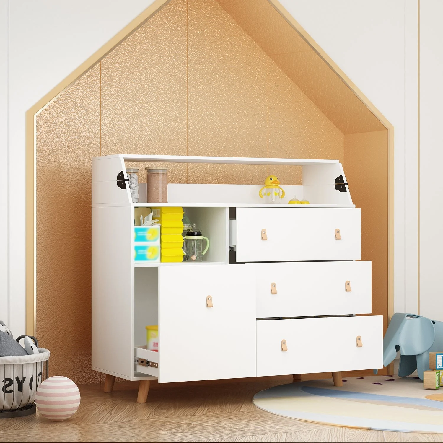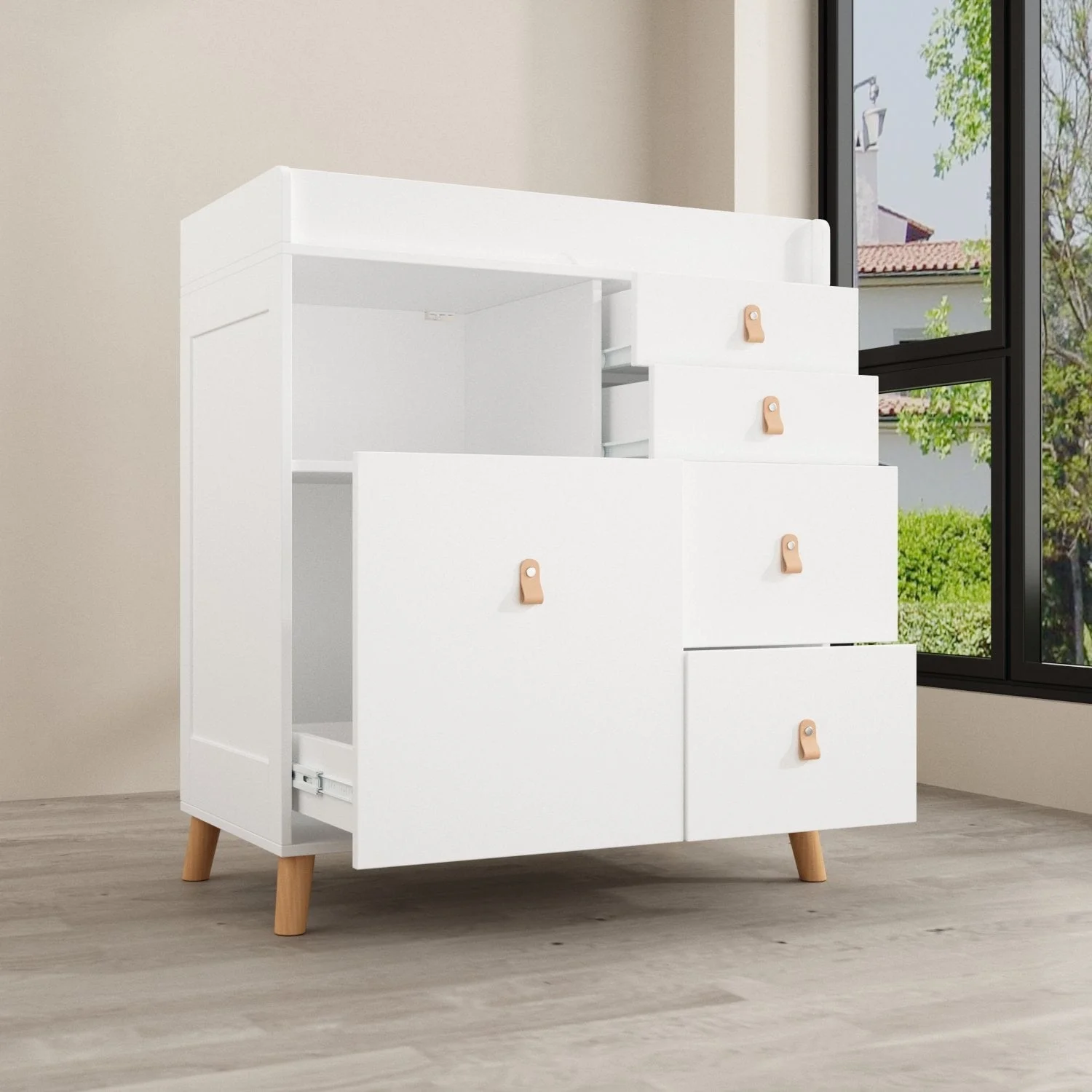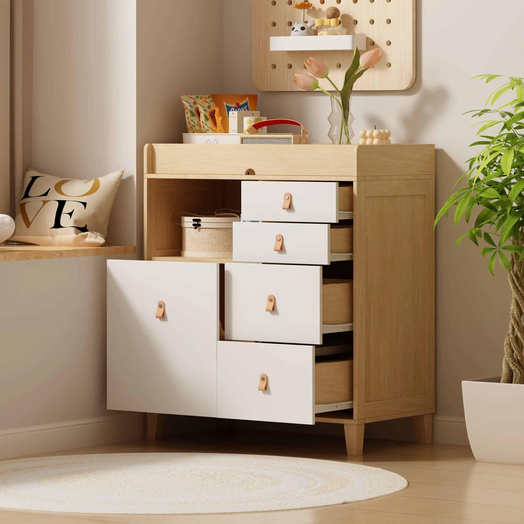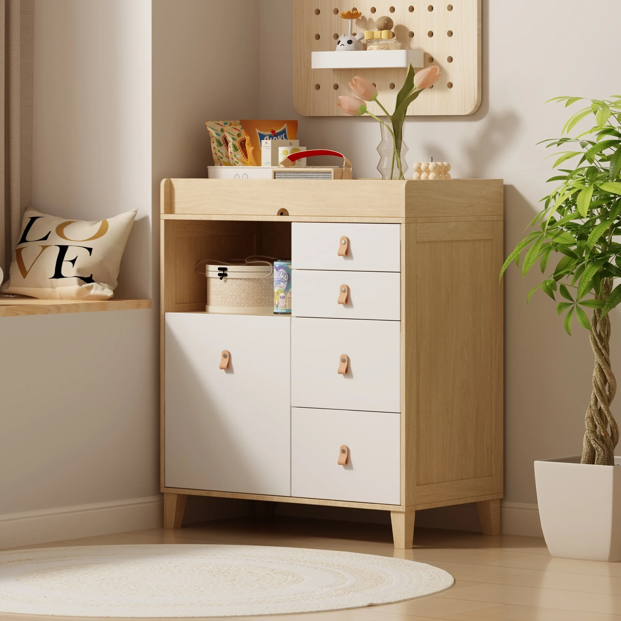 Versatile Nursery Changing Station with Ample Storage - White Dresser Oak - 5-drawer