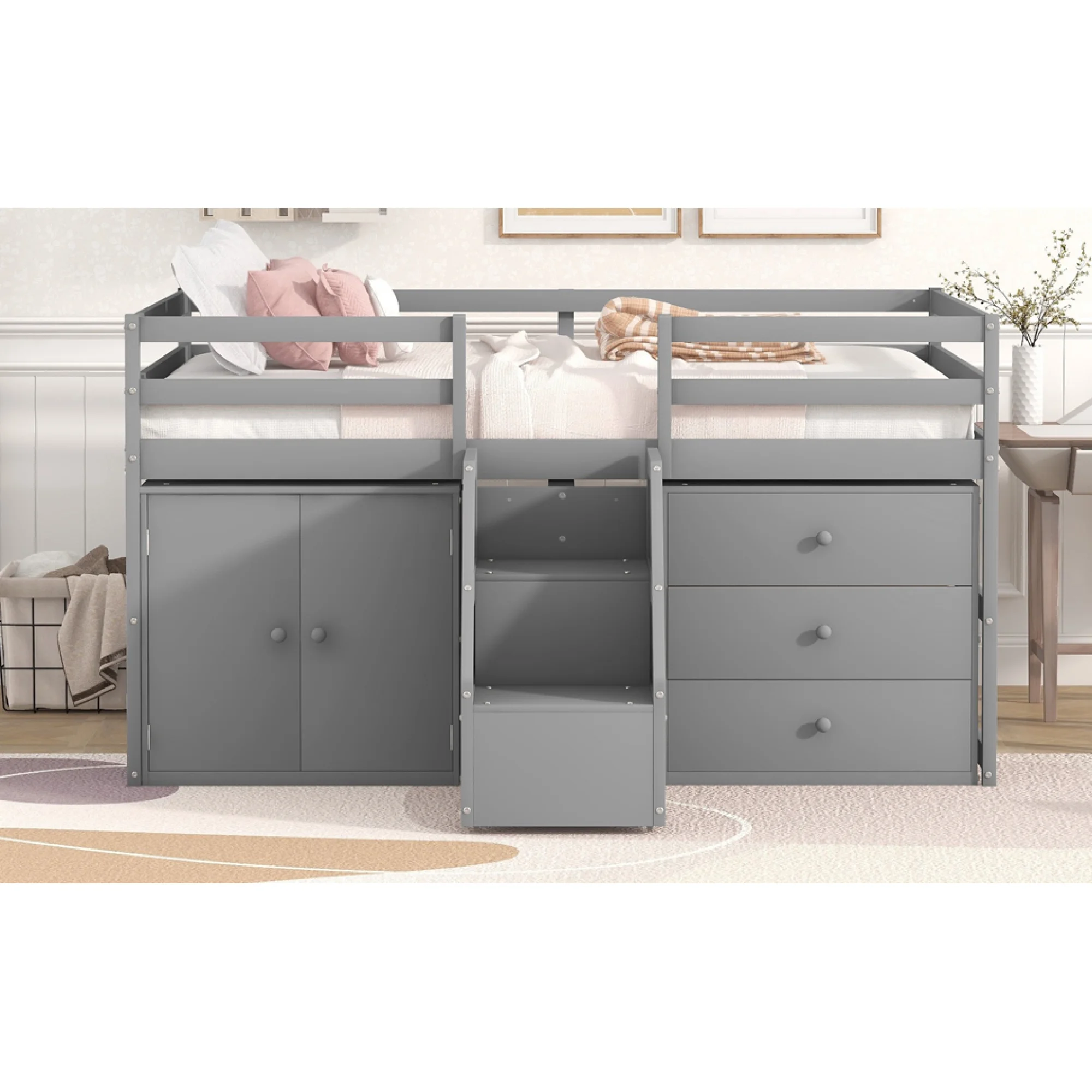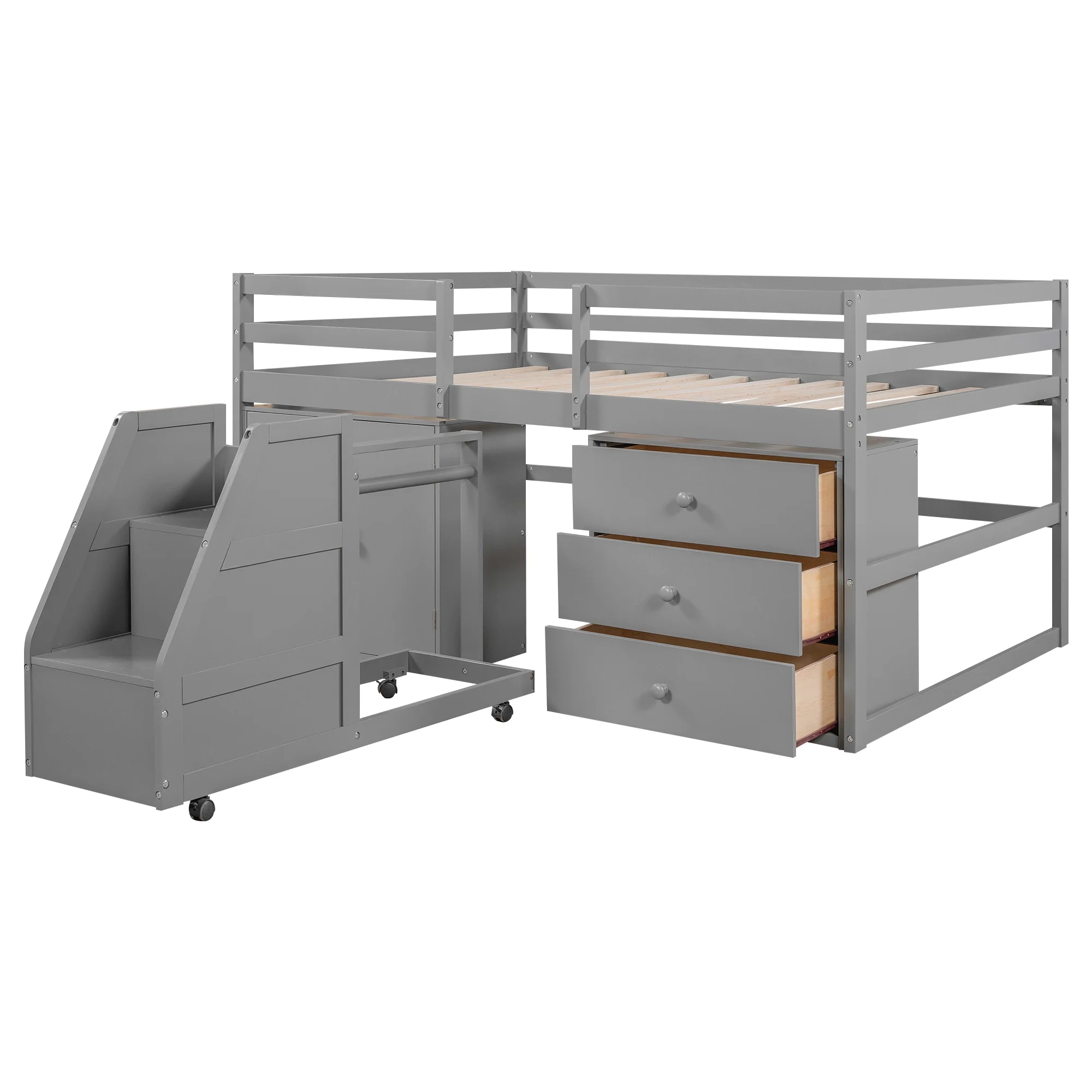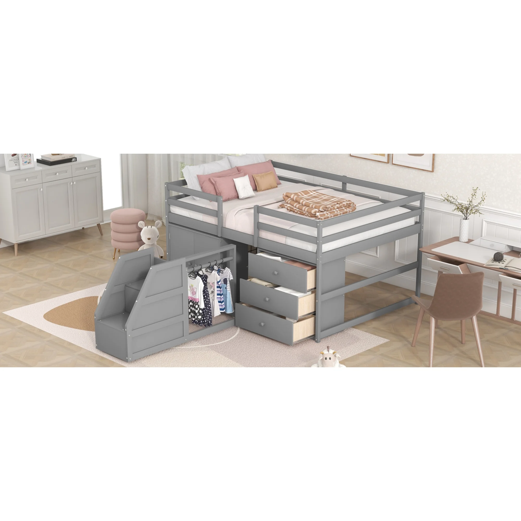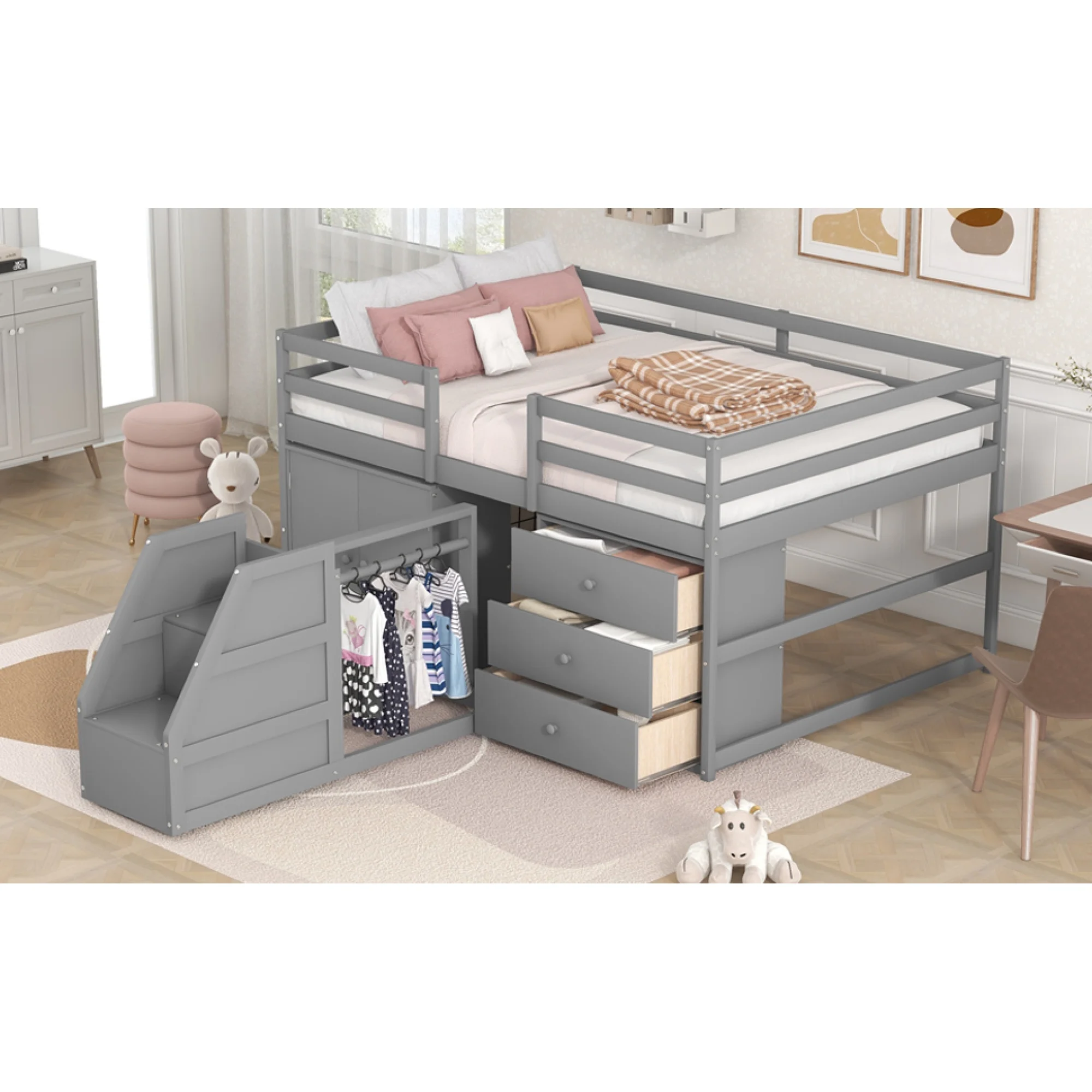 Dawn Whisper Full Size Functional Loft Bed with Cabinets and Drawers, Hanging Clothes at the back of the Staircase, Gray